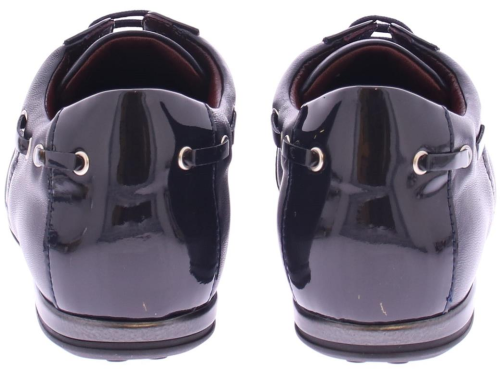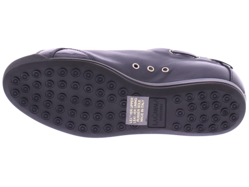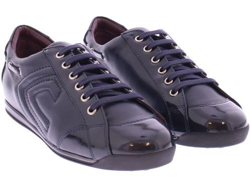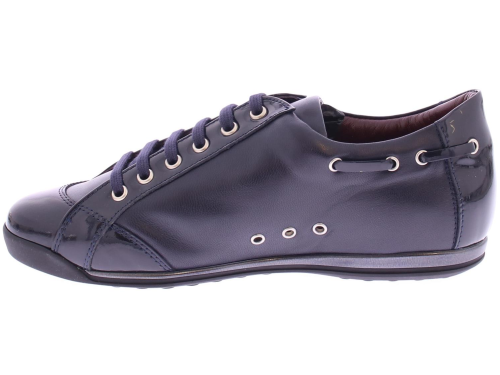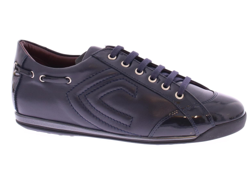 Donkerblauw leren dames sneaker van La Cabala. Uitgevoerd in het bekende superzachte kalfsleer in combinatie met lakleer op de neus, hiel en langs de veter. Het voetbed van de elegante sneakers is uitneembaar.