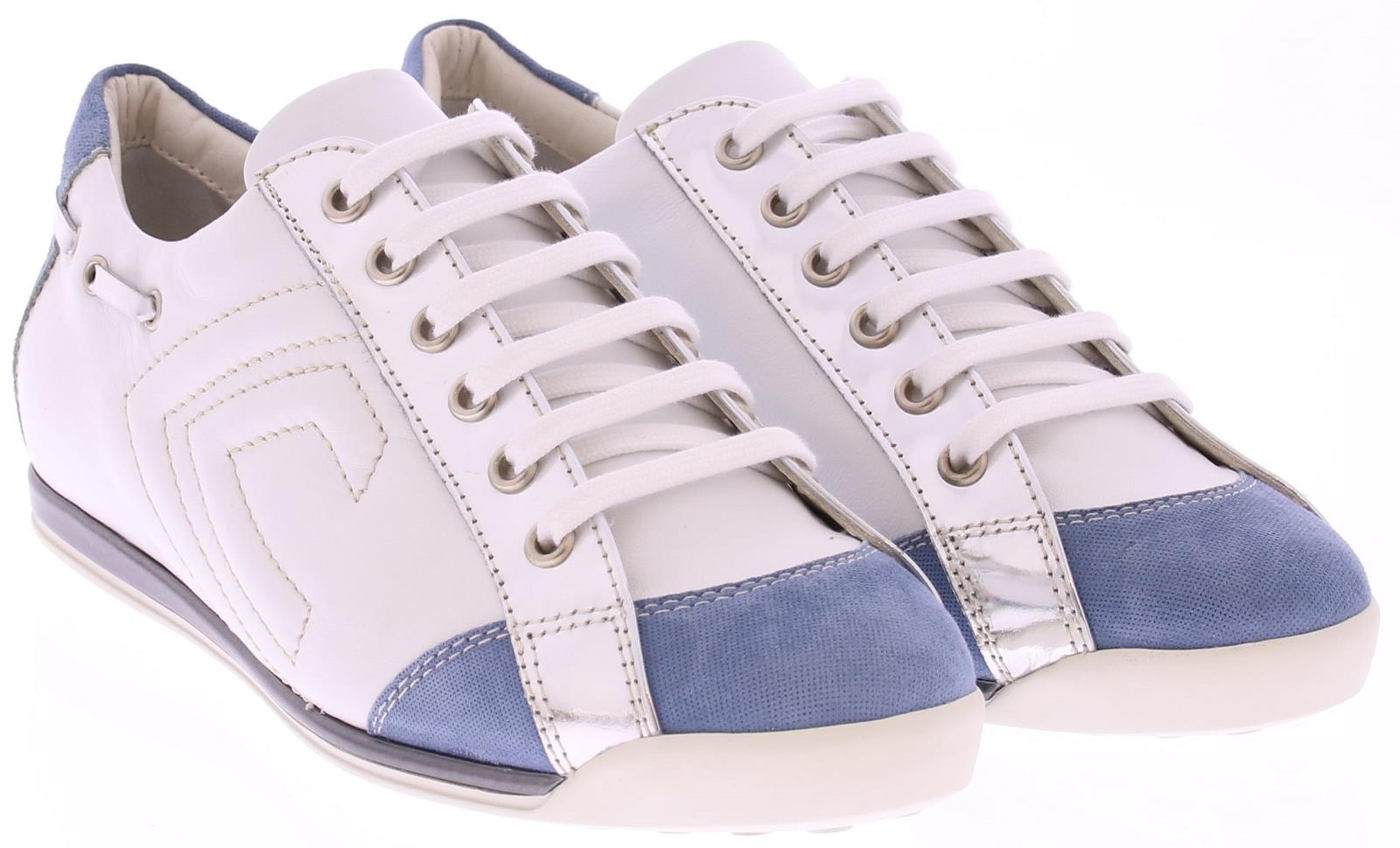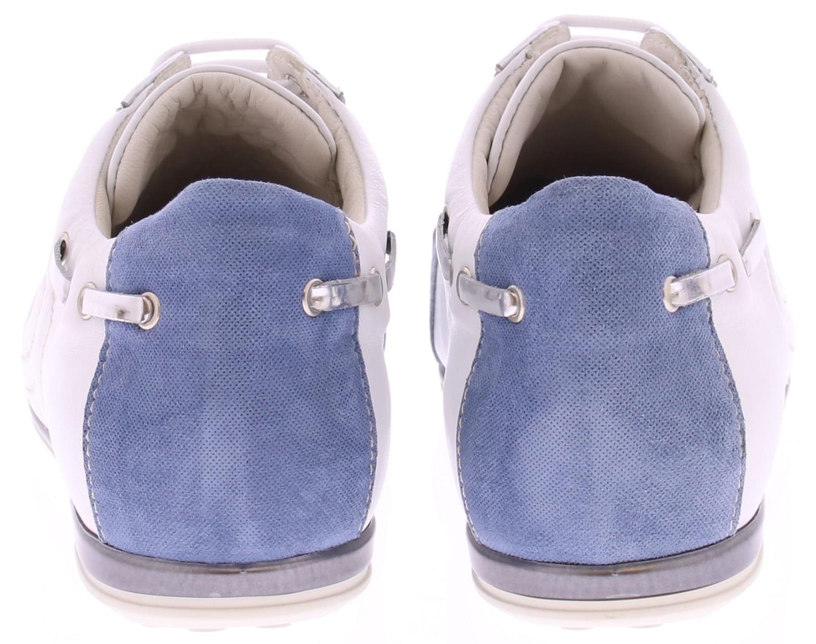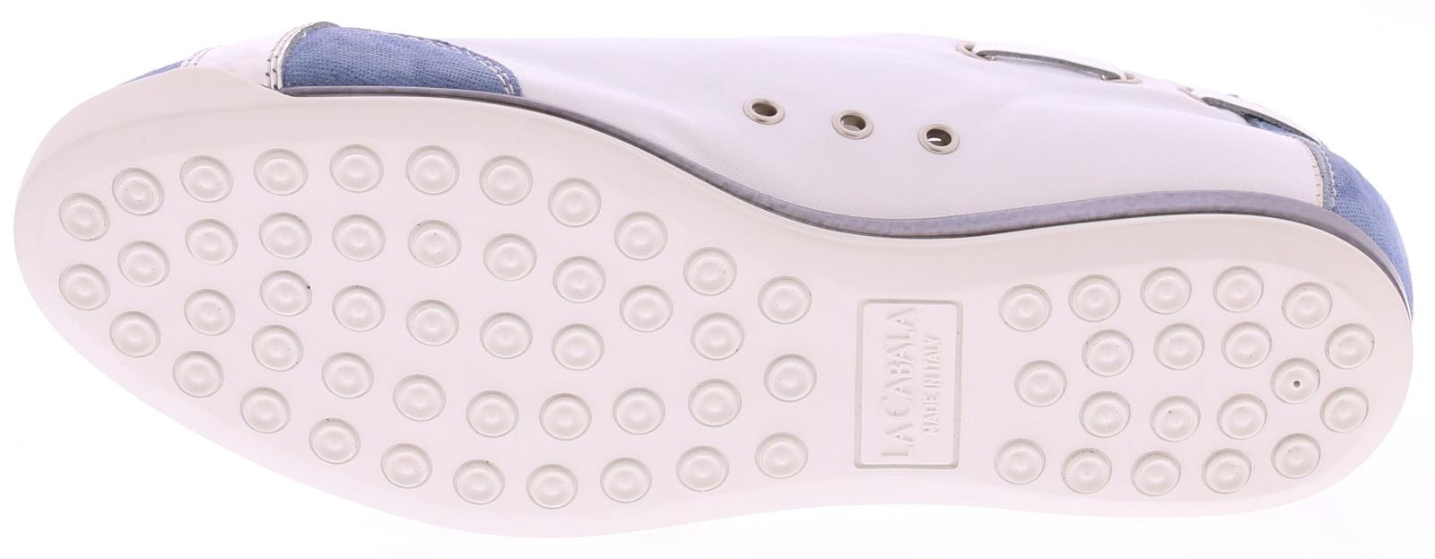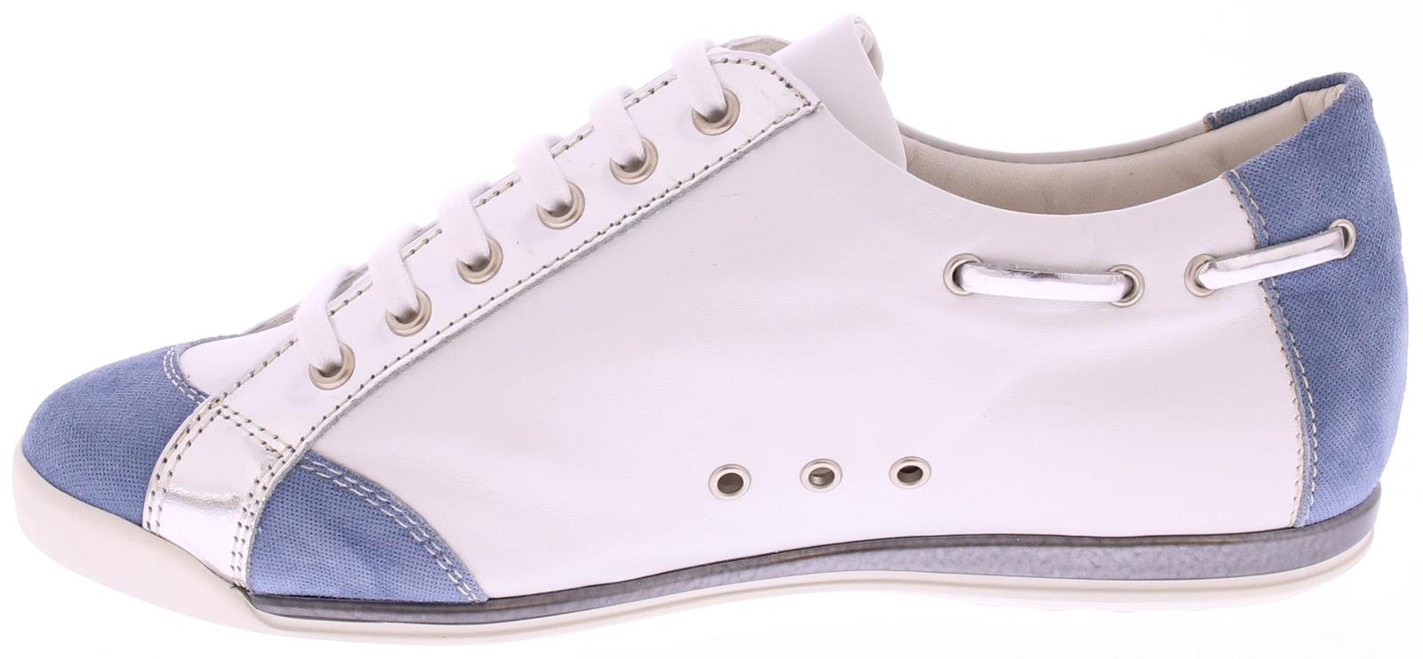 Wit met lichtblauw leren dames sneaker van La Cabala. Uitgevoerd in het bekende superzachte kalfsleer in combinatie met lichtblauw suede op de neus, hiel en zilver langs de veter. Het voetbed van de elegante sneakers is uitneembaar.