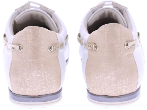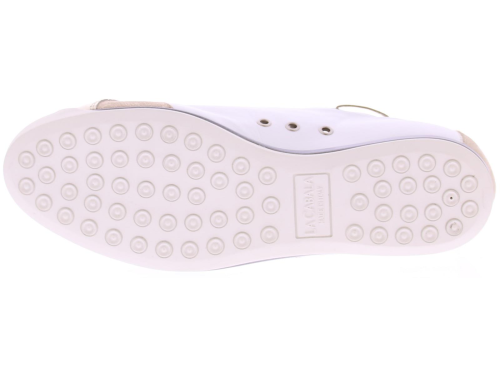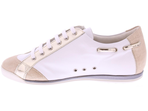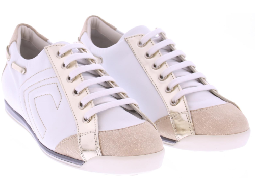 Wit met goud leren dames sneaker van La Cabala. Uitgevoerd in het bekende superzachte kalfsleer in combinatie met geprint leer op de neus, hiel en langs de veter. Het voetbed van de elegante sneakers is uitneembaar.