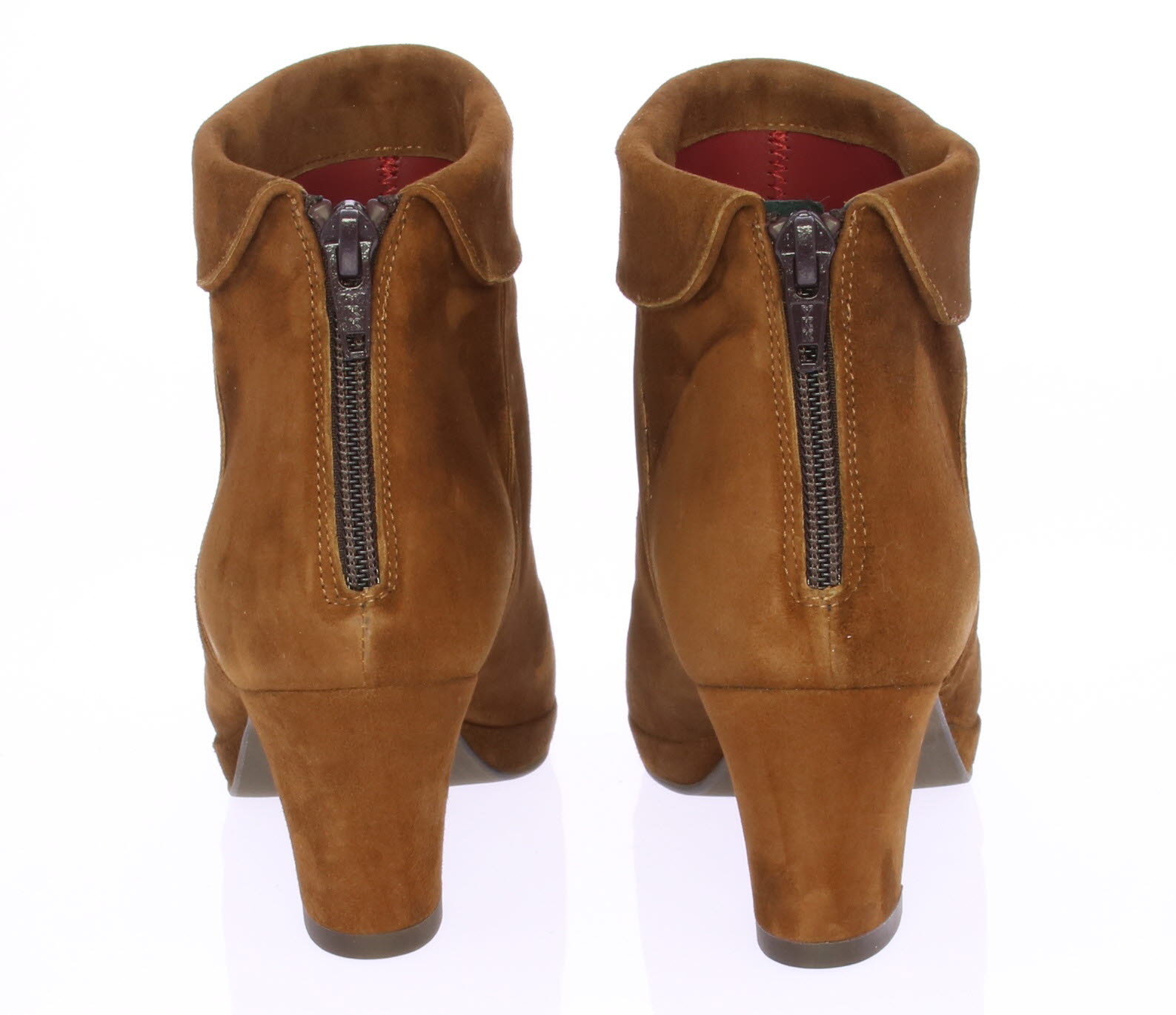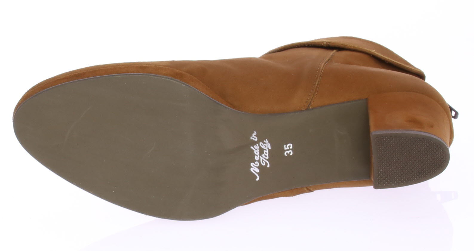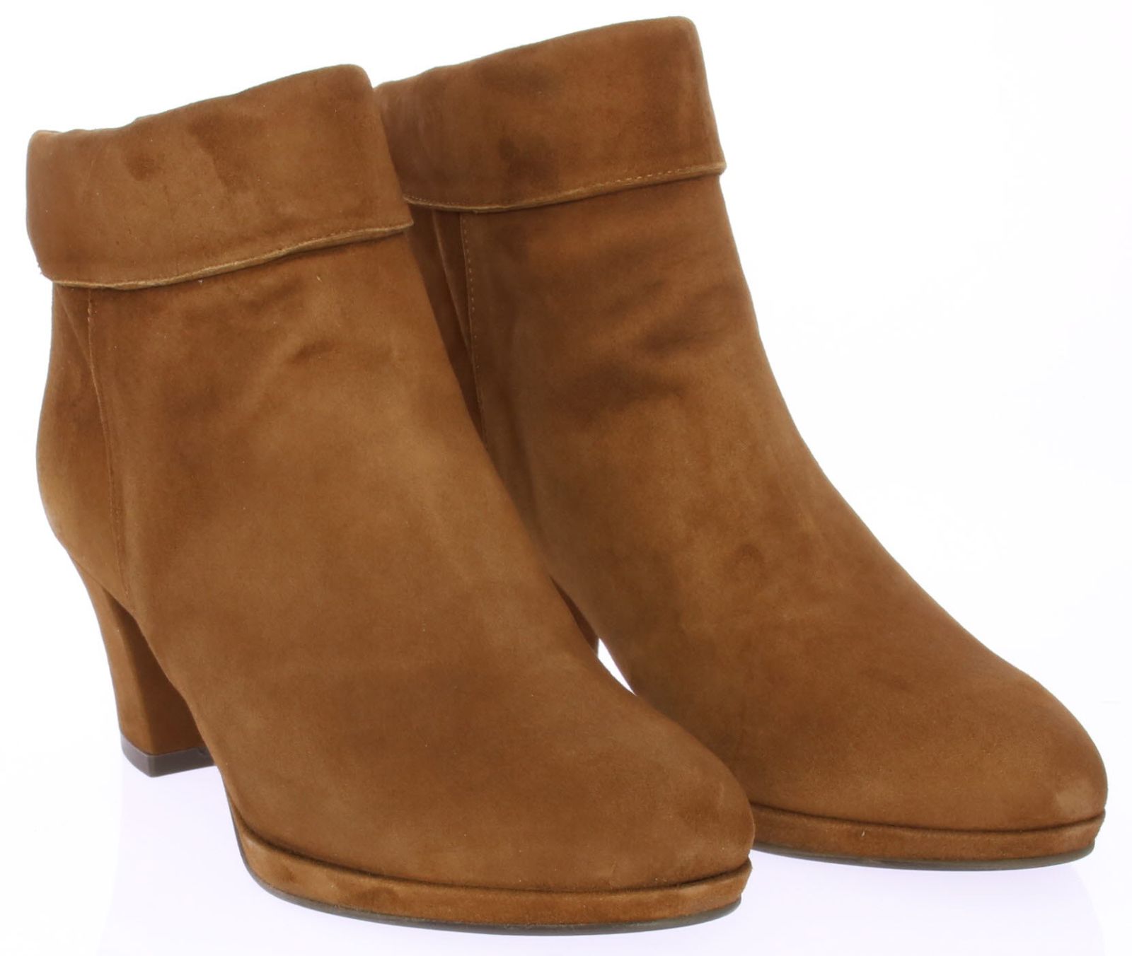 Cognac suede dames enkellaars van Lilian. De laarzen zijn voorzien van een plateau waardoor de 5 cm hak lager aanvoelt. Het model heeft een rits op de hiel en de schacht kunt u eventueel omhoog dragen.