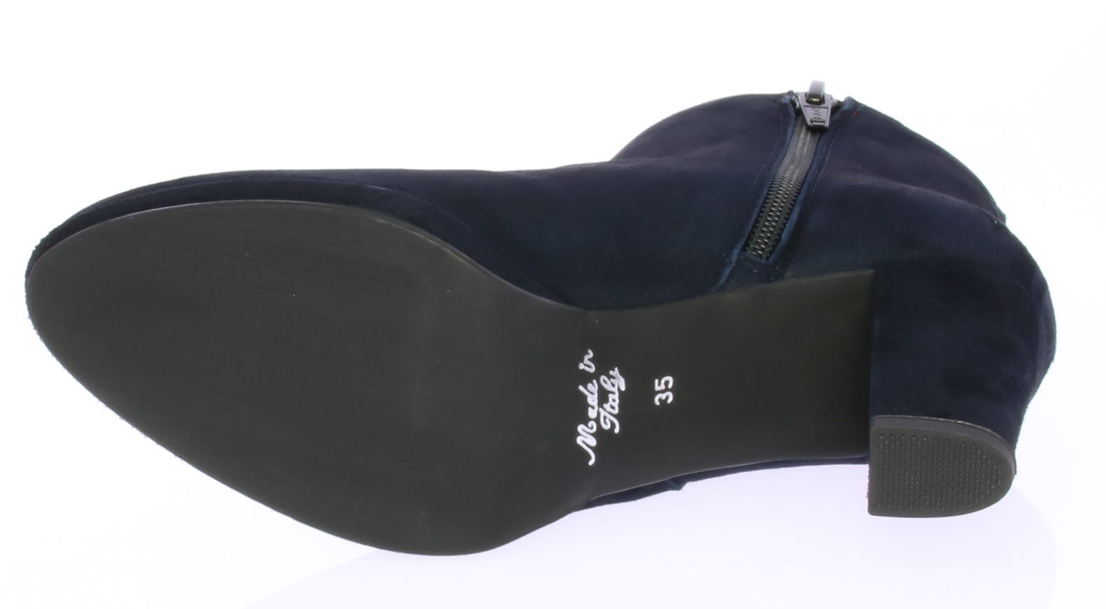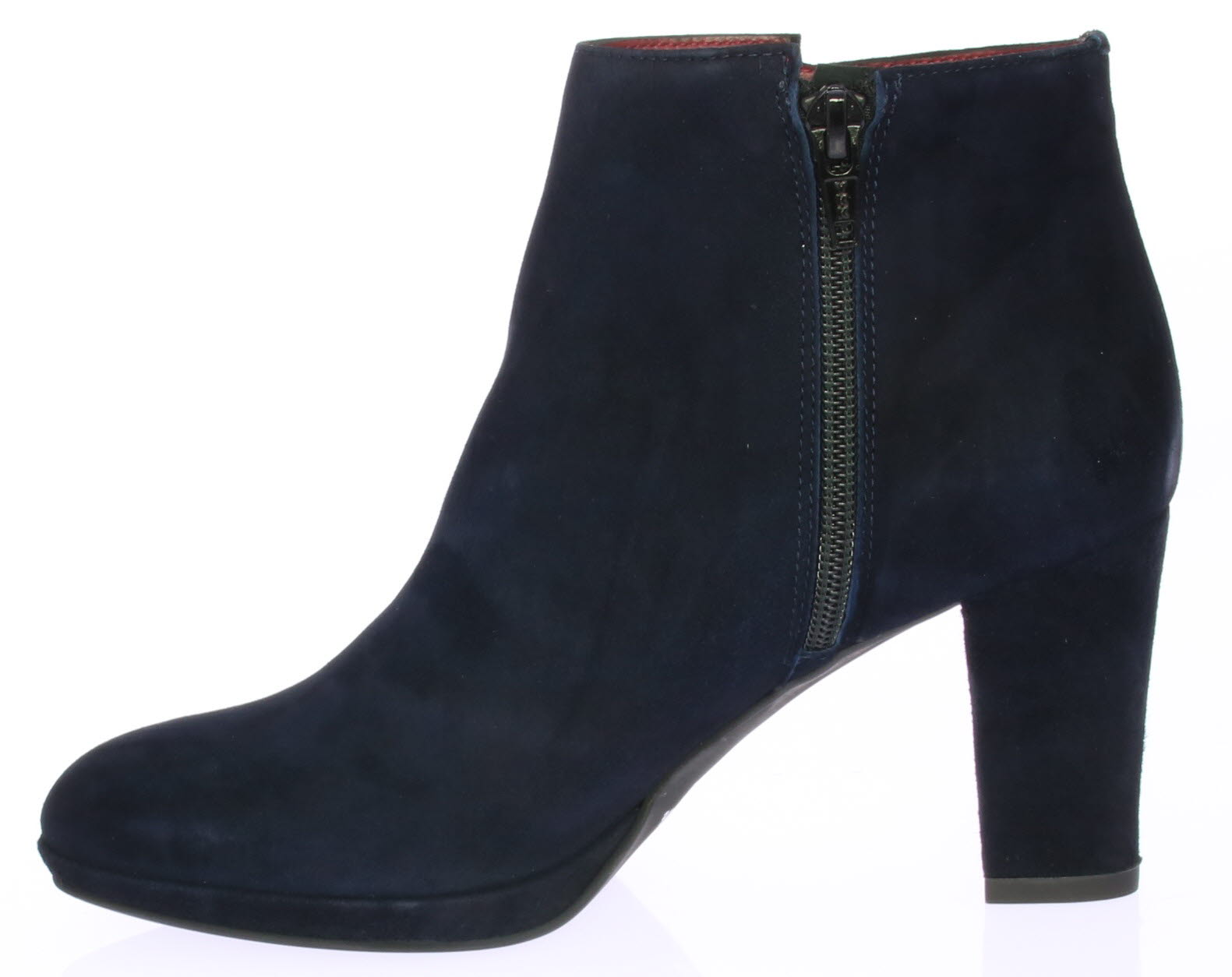 Donkerblauw suede dames enkellaars van Lilian. De laars heeft een bekleed plateau waardoor de 6 cm hoge hak veel minder hoog aanvoelt. Het is een mooi elegant basislaars die nauw sluit rond de enkel.