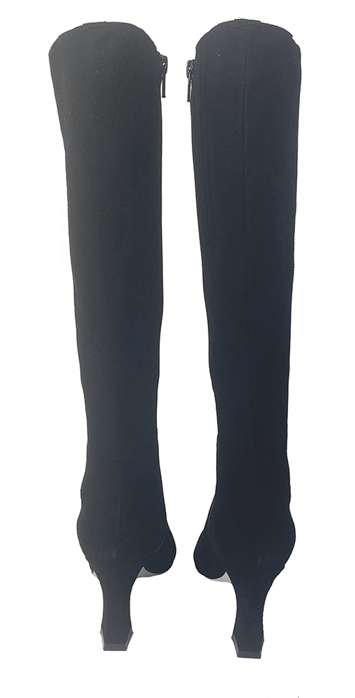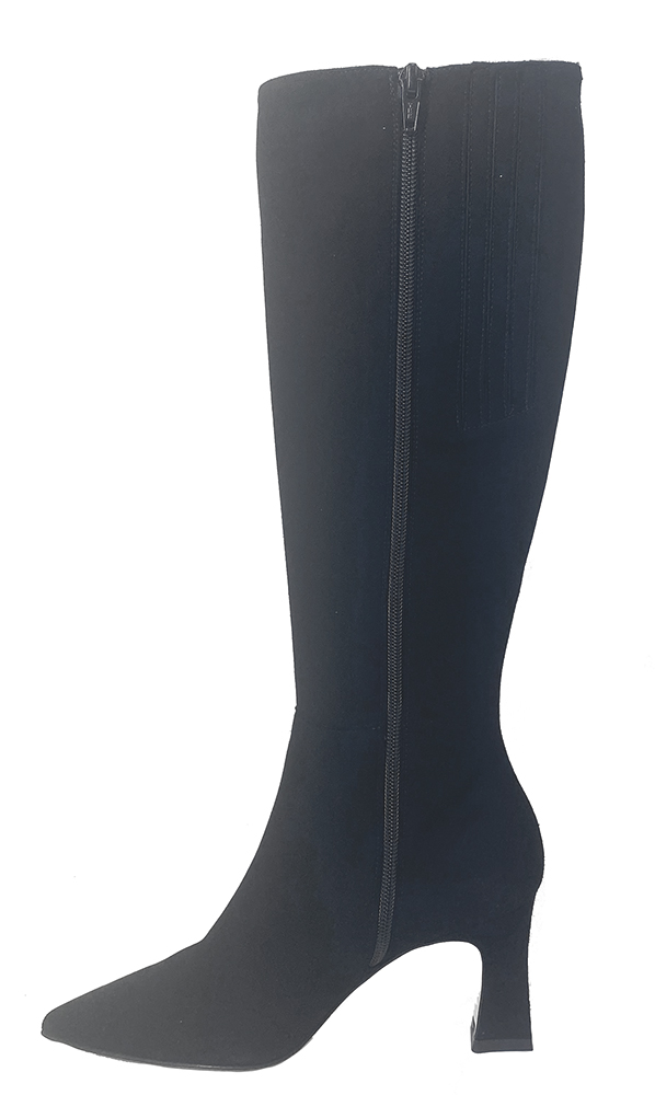 Zwarte suede dameslaars van Lilian. Deze laars heeft een spitsere neus. Heeft een normale schacht breedte. De beklede hak is iets uitlopend en heeft een hoogte van 7 cm.