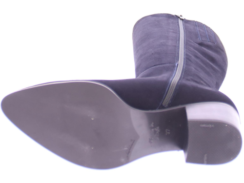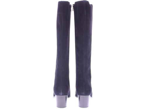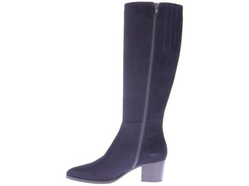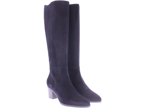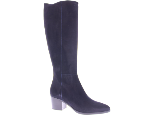 Donkerblauw suede lange dames laars van Lilian. Mooie basic laars met hele fijne pasvorm op een wat ovalere leest met een 6 cm blokhak. De kuitwijdte is normaal.