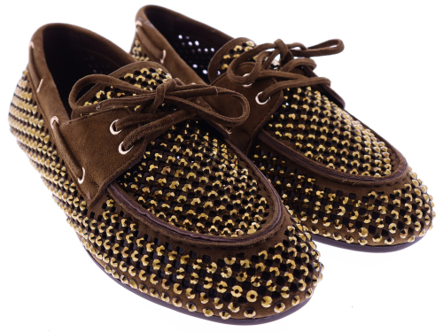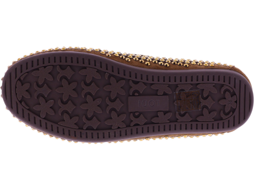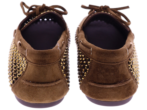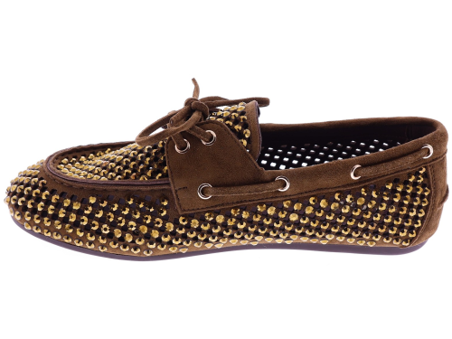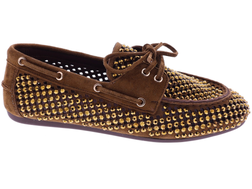 Bruin suède dames bootschoenenen van Lodi. Deze bootschoen is uitgevoerd in opengewerkt suède en afgewerkt met goudkleurige strassteentjes. Het zachte suède zorgt voor een prettig draagcomfort en een luchtig gevoel aan de voet. Een makkelijk te combineren model dat geschikt is voor dagelijks gebruik. Ontdek ook de andere dames instappers van Lodi bij Klijsen.
