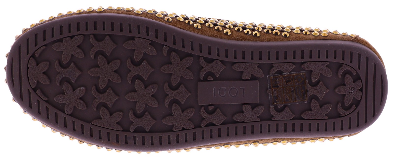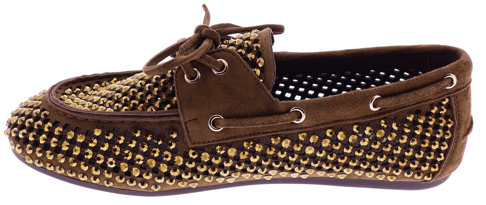 Bruin suède dames bootschoenenen van Lodi. Deze bootschoen is uitgevoerd in opengewerkt suède en afgewerkt met goudkleurige strassteentjes. Het zachte suède zorgt voor een prettig draagcomfort en een luchtig gevoel aan de voet. Een makkelijk te combineren model dat geschikt is voor dagelijks gebruik. Ontdek ook de andere dames instappers van Lodi bij Klijsen.