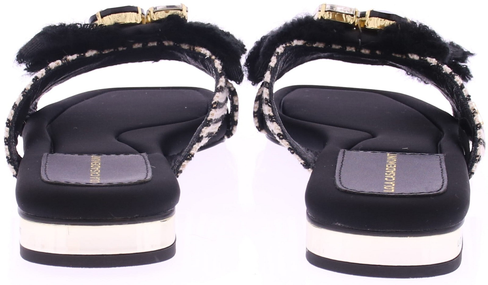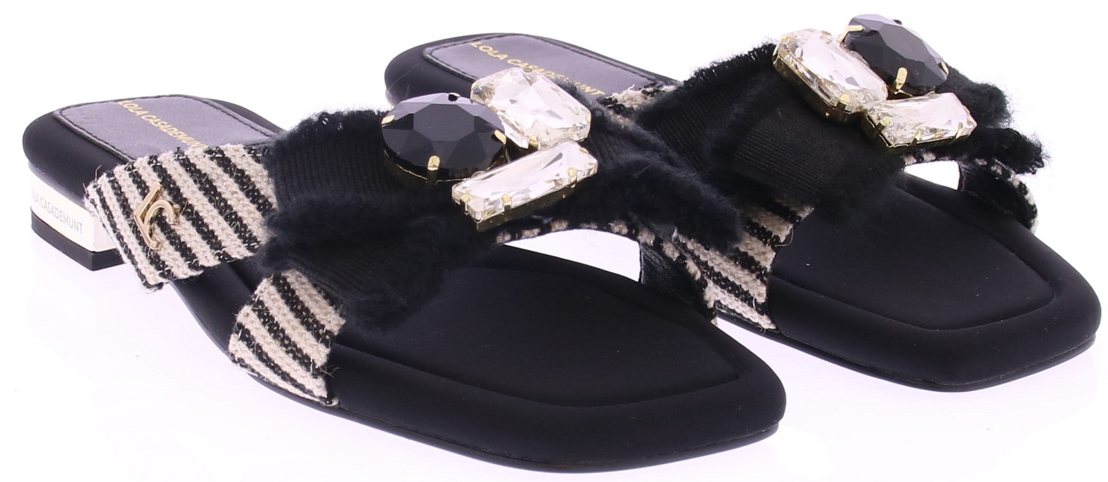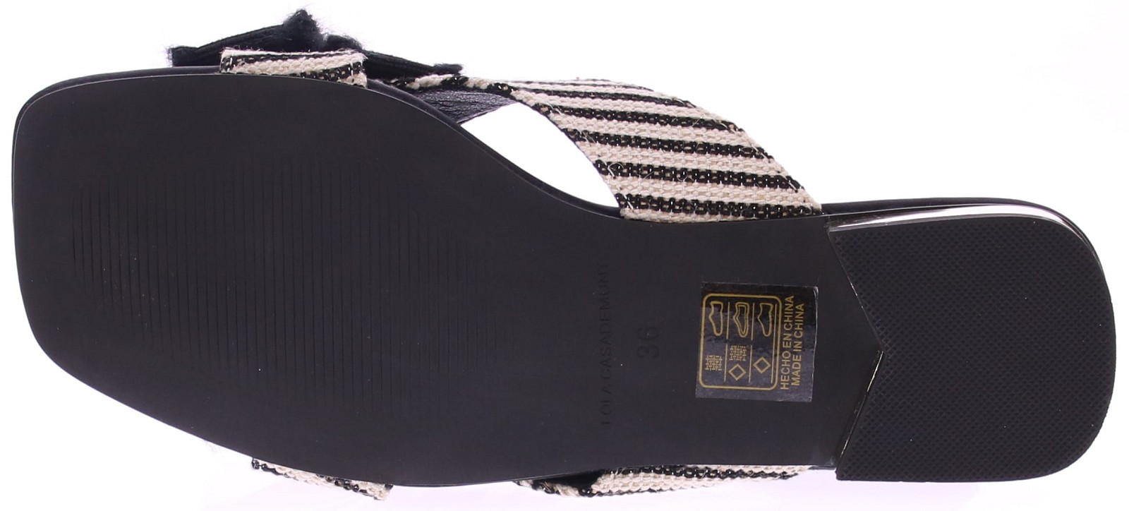 Zwart- wit stoffen dames slippers van Lola Casademunt. Deze slipper heeft een zwart-wit gestreepte band met een decoratieve garnering op de wreef. Het open model is makkelijk aan te trekken en geschikt voor warme dagen. De platte zool zorgt voor een prettig draaggevoel. Leuk te combineren met een zomerse jurk, rok of een luchtige broek. Ontdek ook de andere dames muilen van Lola Casademunt bij Klijsen.