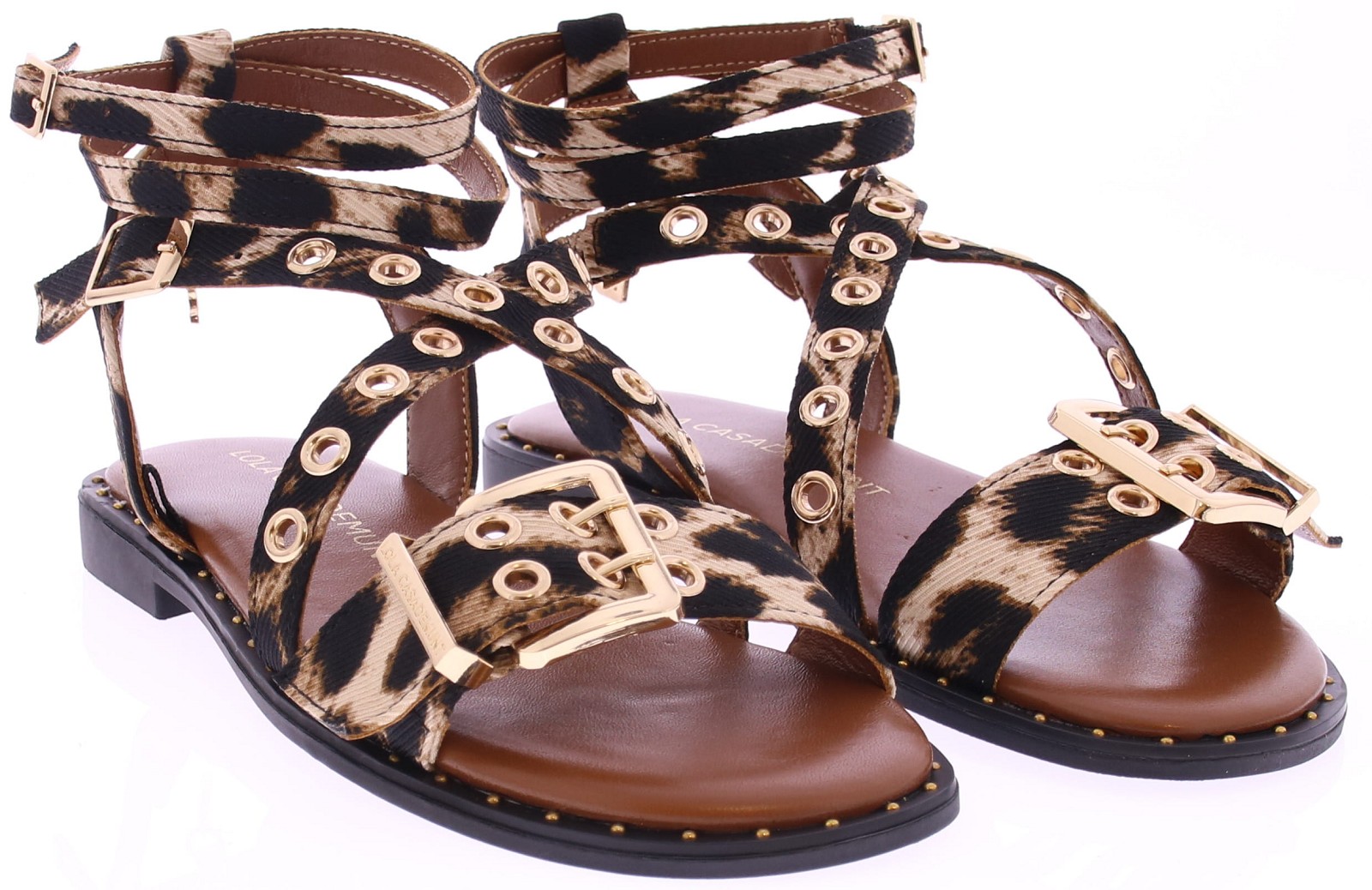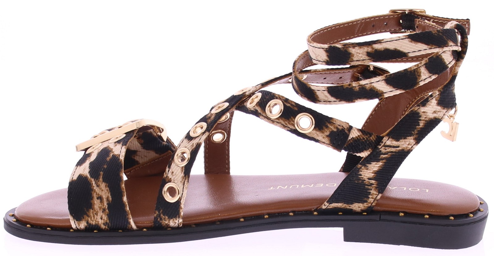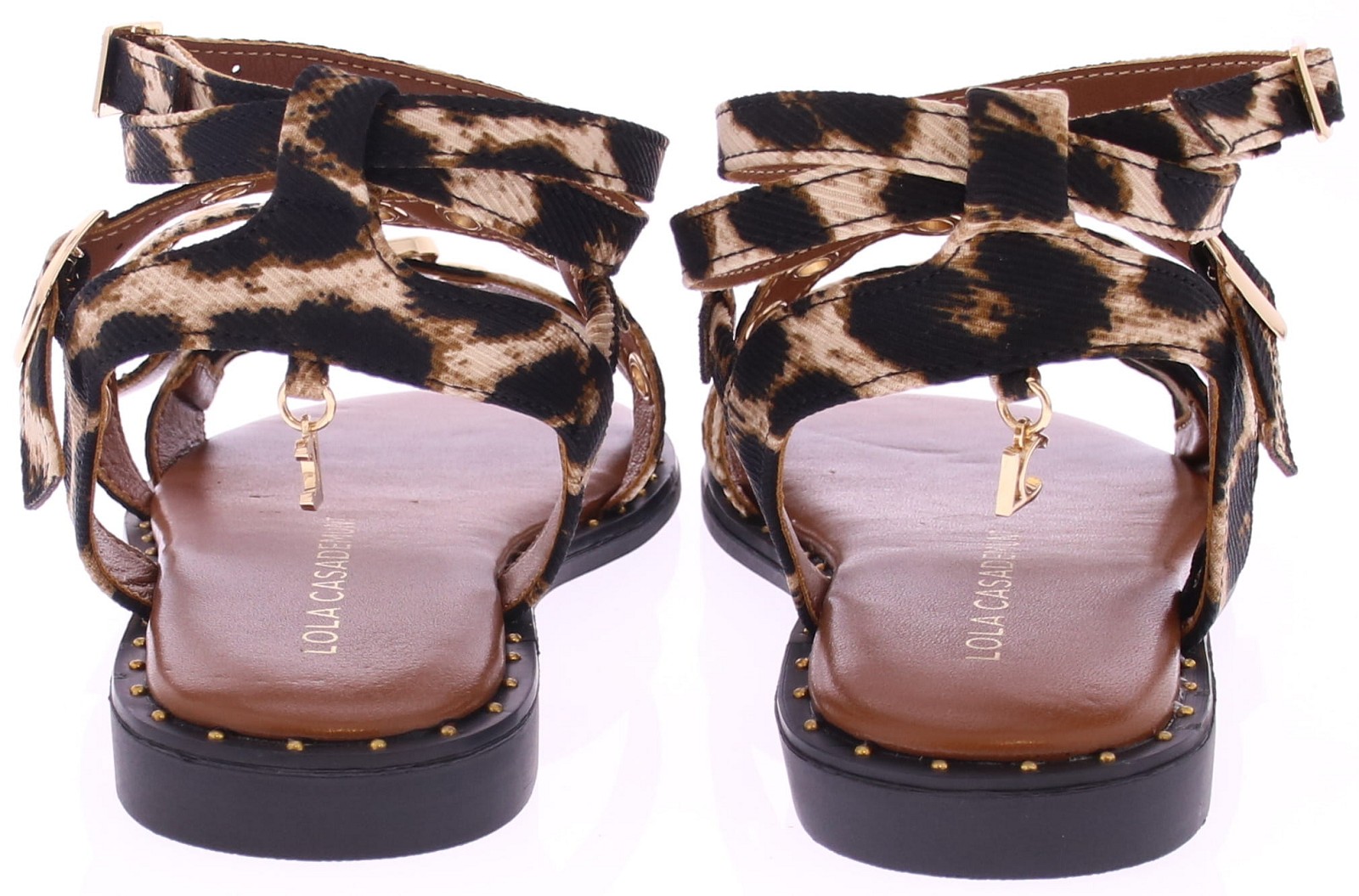 Leopard print dames sandalen van Lola Casademunt. Deze sandaal heeft kruisbandjes over de voet en een dubbel bandje rond de enkel. De grote goudkleurige gesp geeft een opvallend detail. Het leren voetbed en de platte zool zorgen voor een fijn draaggevoel. Leuk te combineren met een zomerse jurk, rok of een korte broek. Ontdek ook de andere dames sandalen van Lola Casademunt bij Klijsen.
