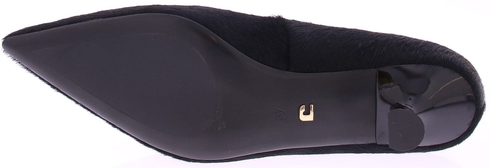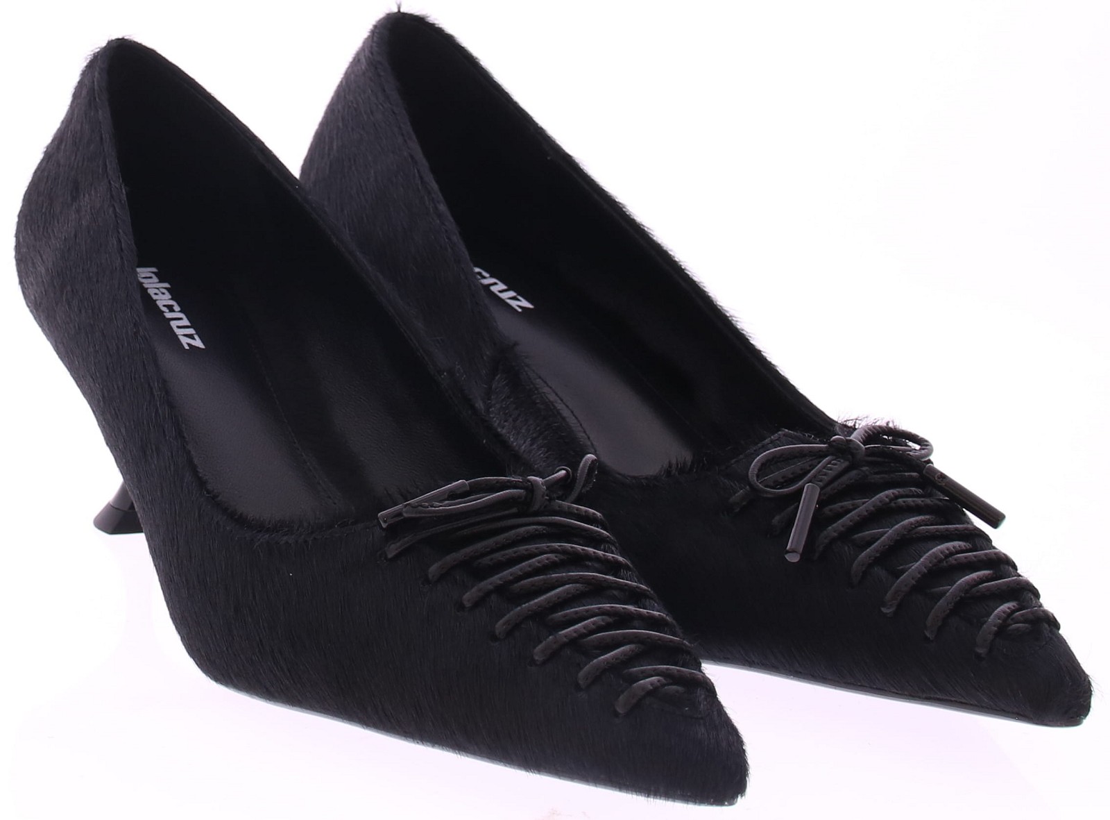Zwart ponyhair dames pump van Lola Cruz. Deze elegante pump heeft een sierlijke veter op de voorvoet en een spitse neus. De elegante hak heeft een hoogte van 5 cm en de zool is van leer met een rubber inzet. Stijlvol, veelzijdig en perfect voor zowel dagelijks gebruik als een avondje uit.