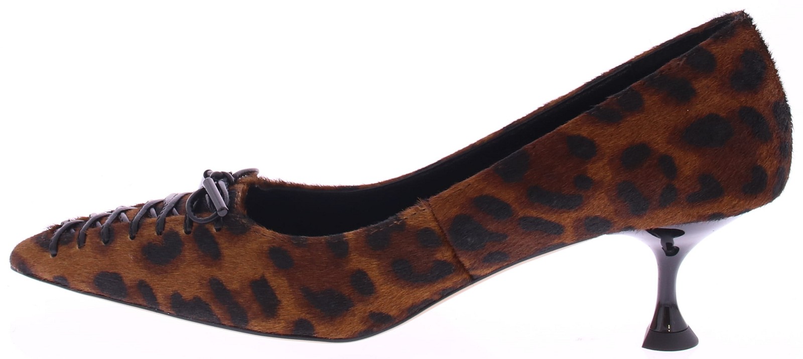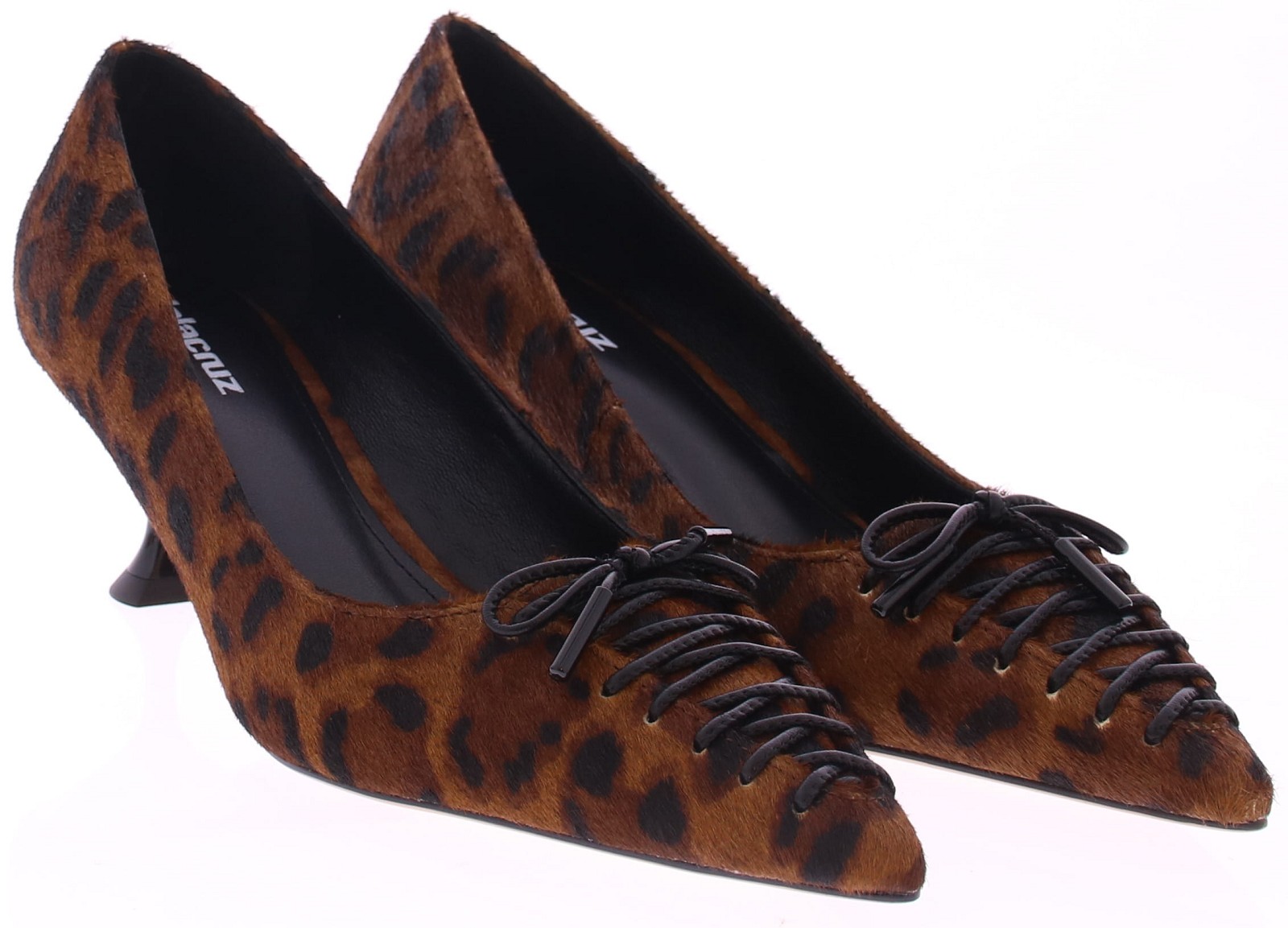 Leopard print ponyhair dames pump van Lola Cruz. Deze elegante pump heeft een sierlijke veter op de voorvoet en een spitse neus. De elegante hak heeft een hoogte van 5 cm en de zool is van leer met een rubber inzet. Stijlvol, veelzijdig en perfect voor zowel dagelijks gebruik als een avondje uit.