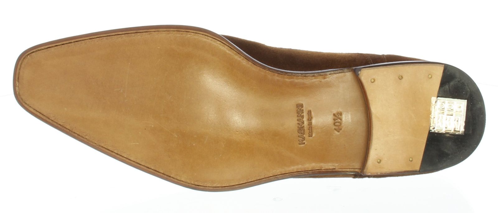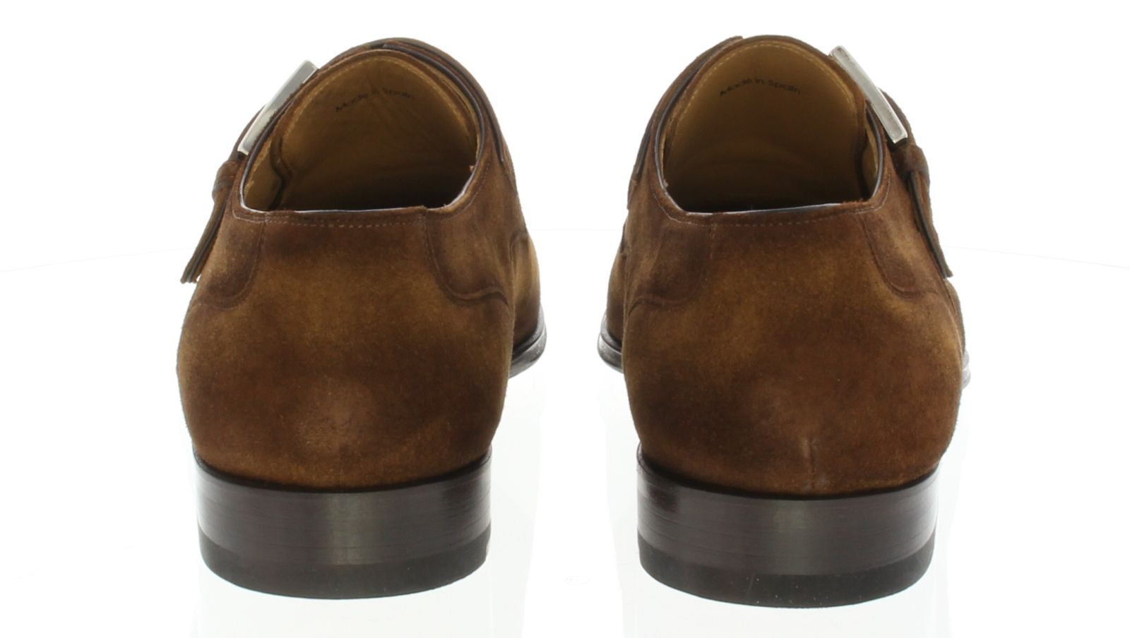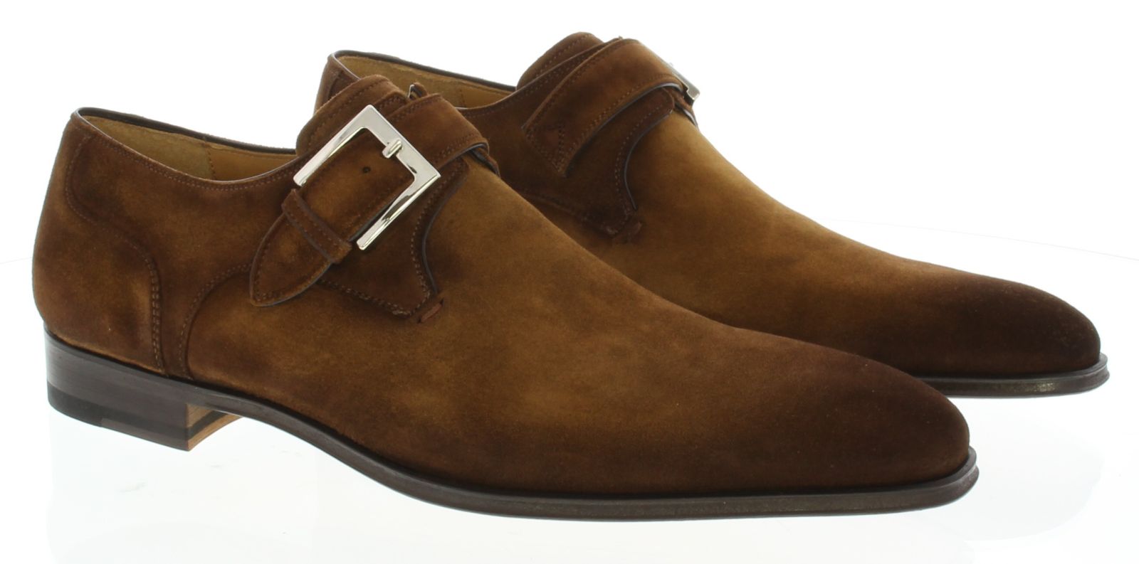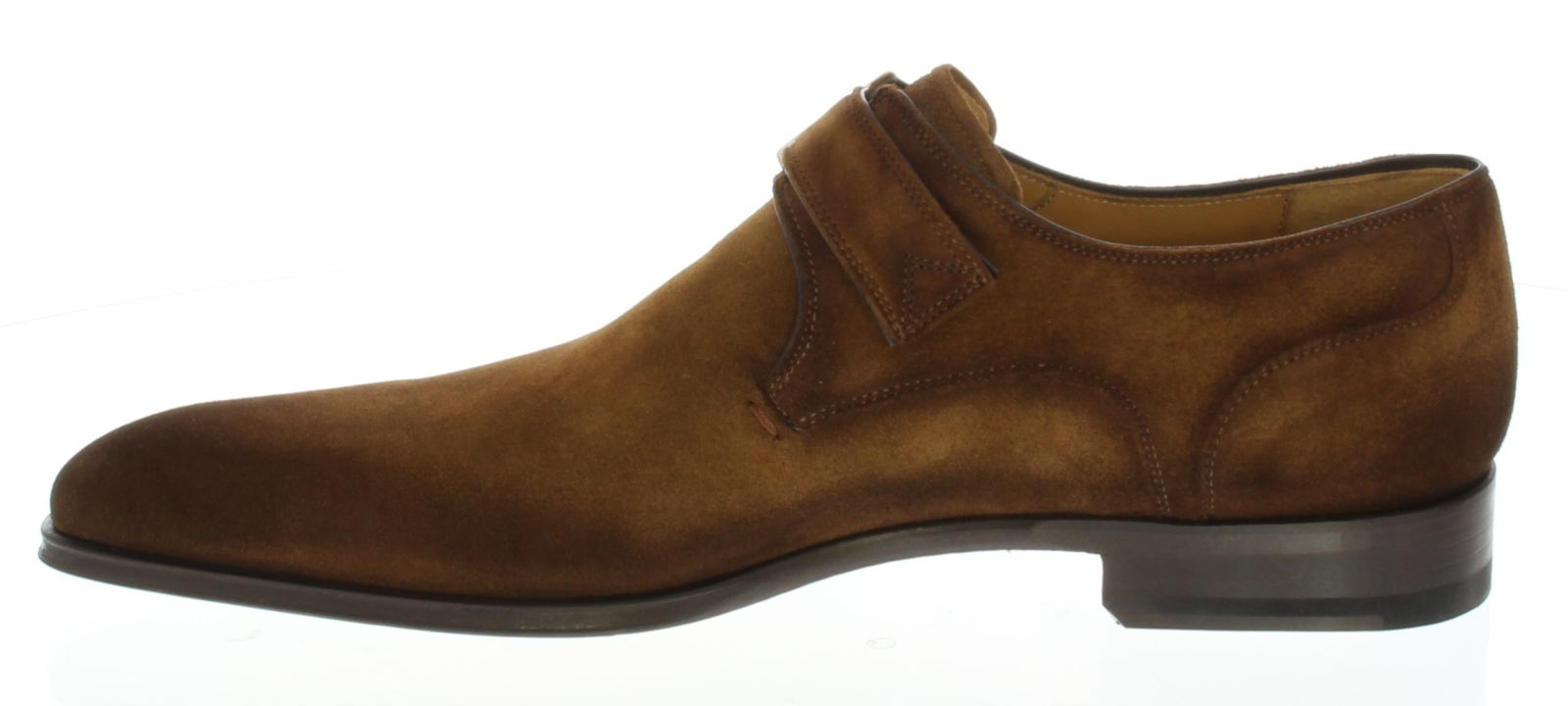 Cognac suede heren gespschoen van Magnanni. Hierbij is de belijning donkerder aangezet, waardoor de kleur meer spreekt. De schoen heeft een leren zool en is gemaakt van geiten suede.