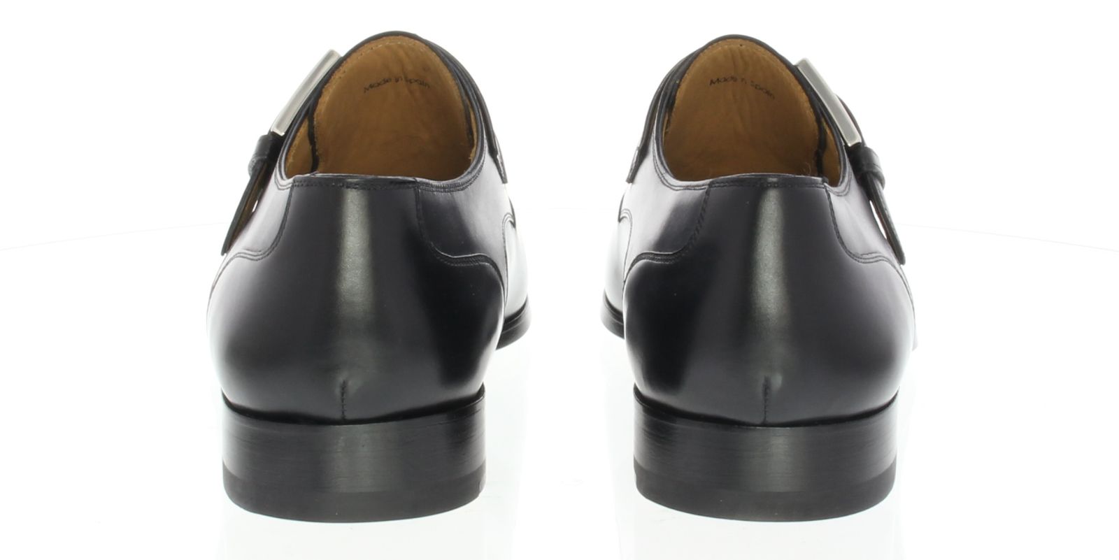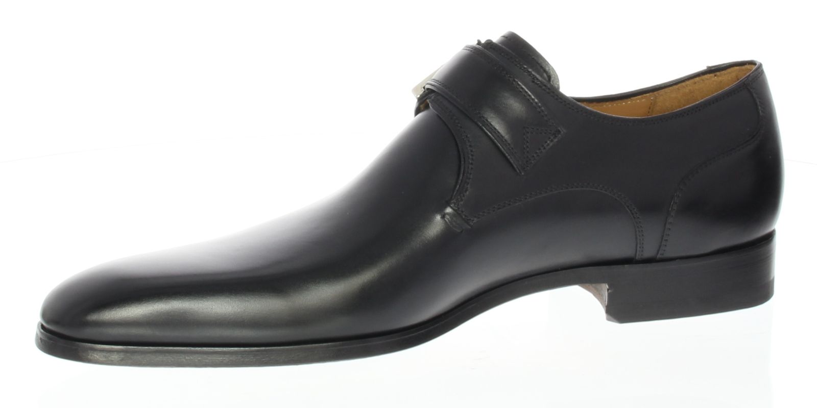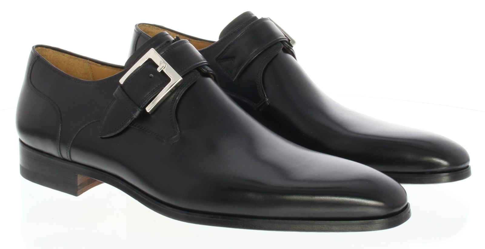 Zwart leren heren gespschoen van Magnanni. De zool van de schoen is van leer met een rubber inzet op het slijtvlak. De voering is geheel van leer.