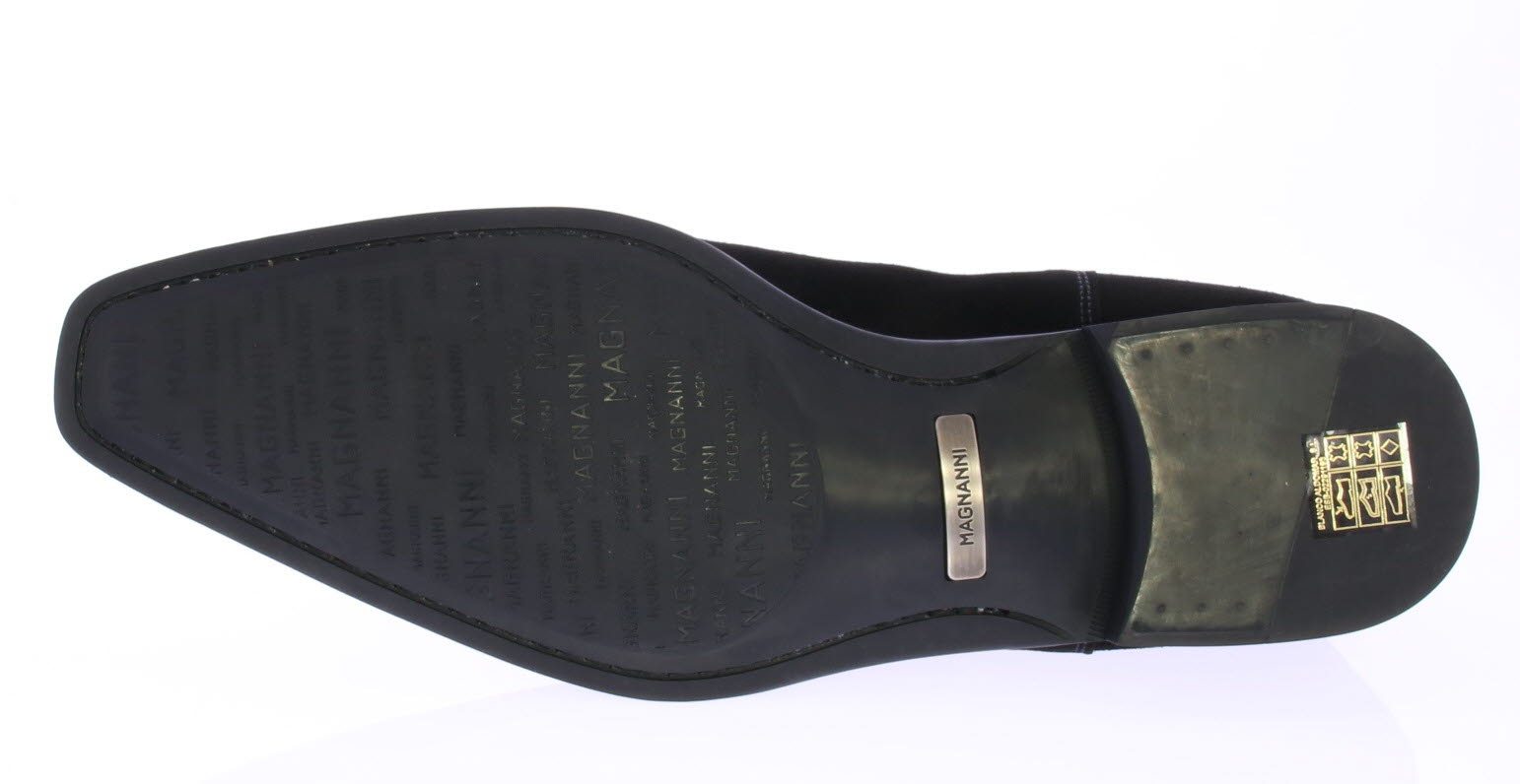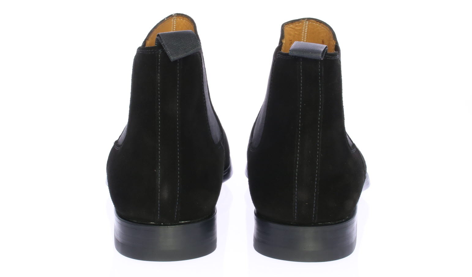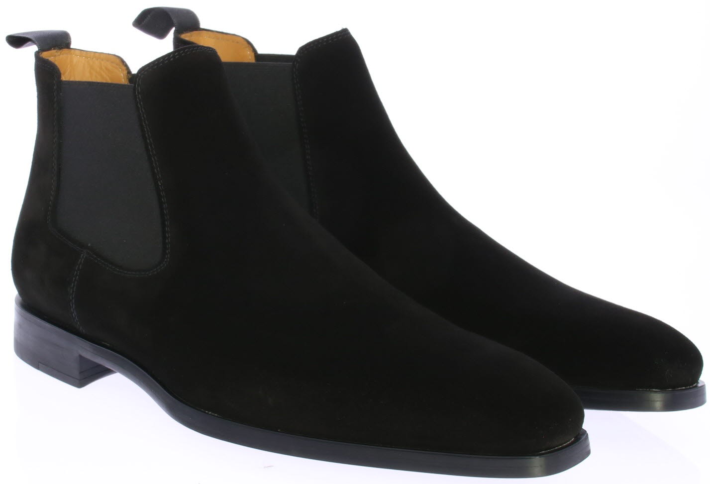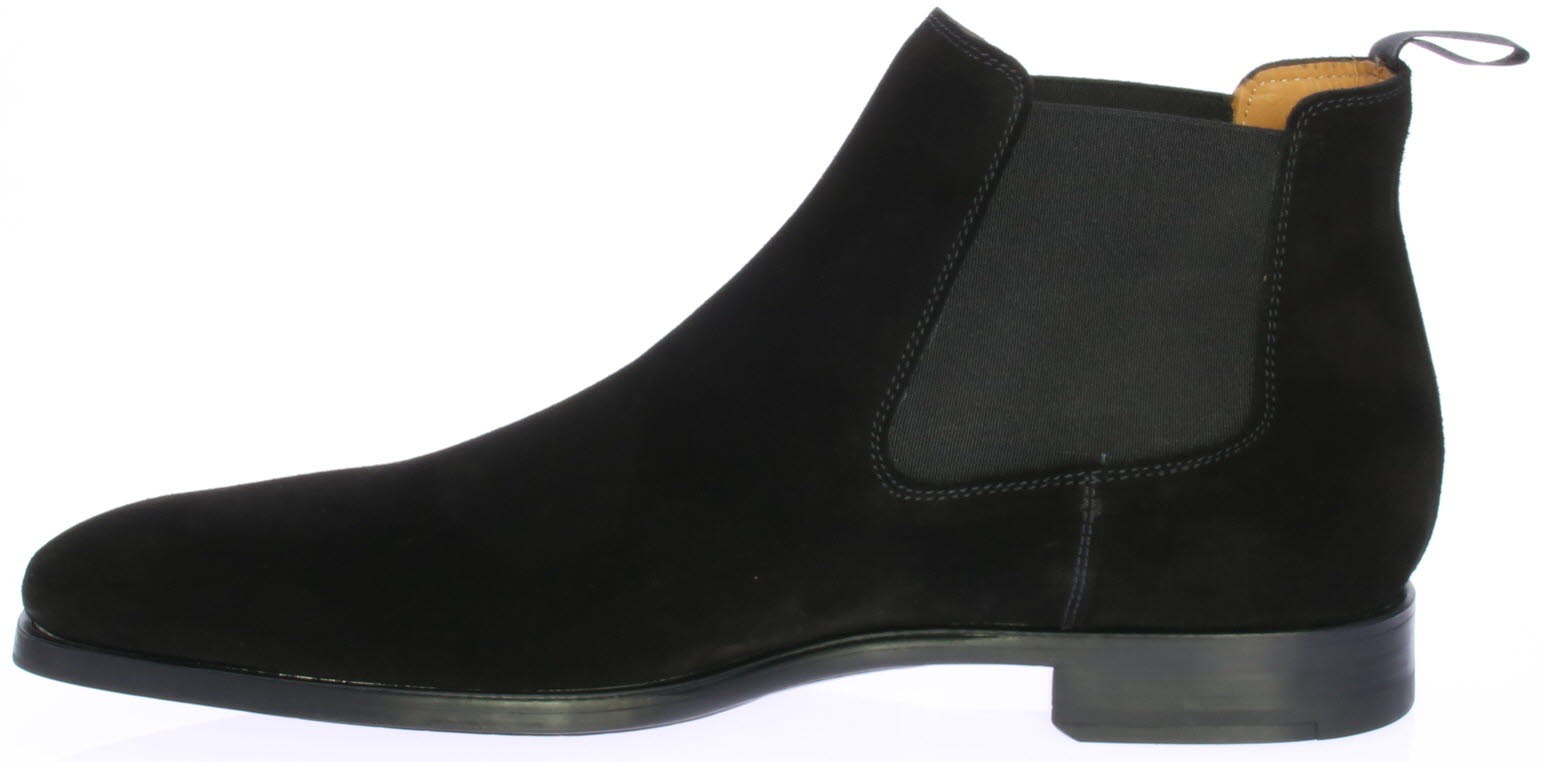 Zwarte suede heren chelseaboots van Magnanni. De laarzen hebben een rubberen onderwerk met leren voering en een treklus aan de achterkant voor een gemakkelijke instap.