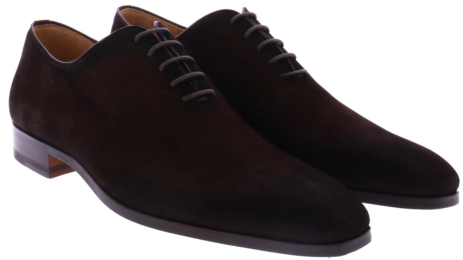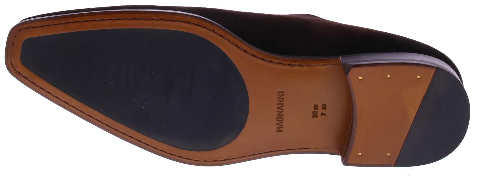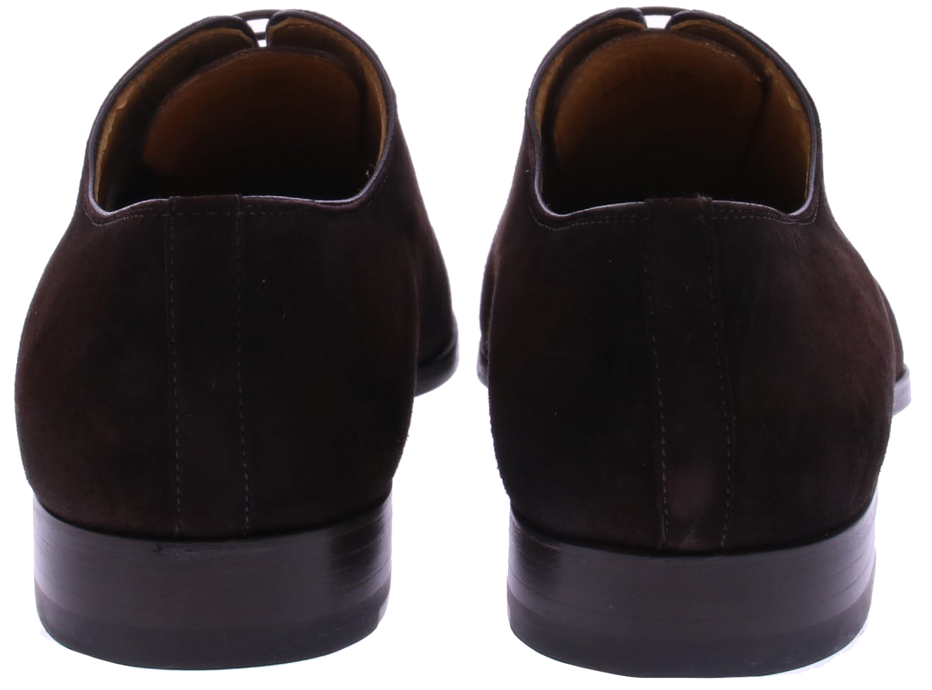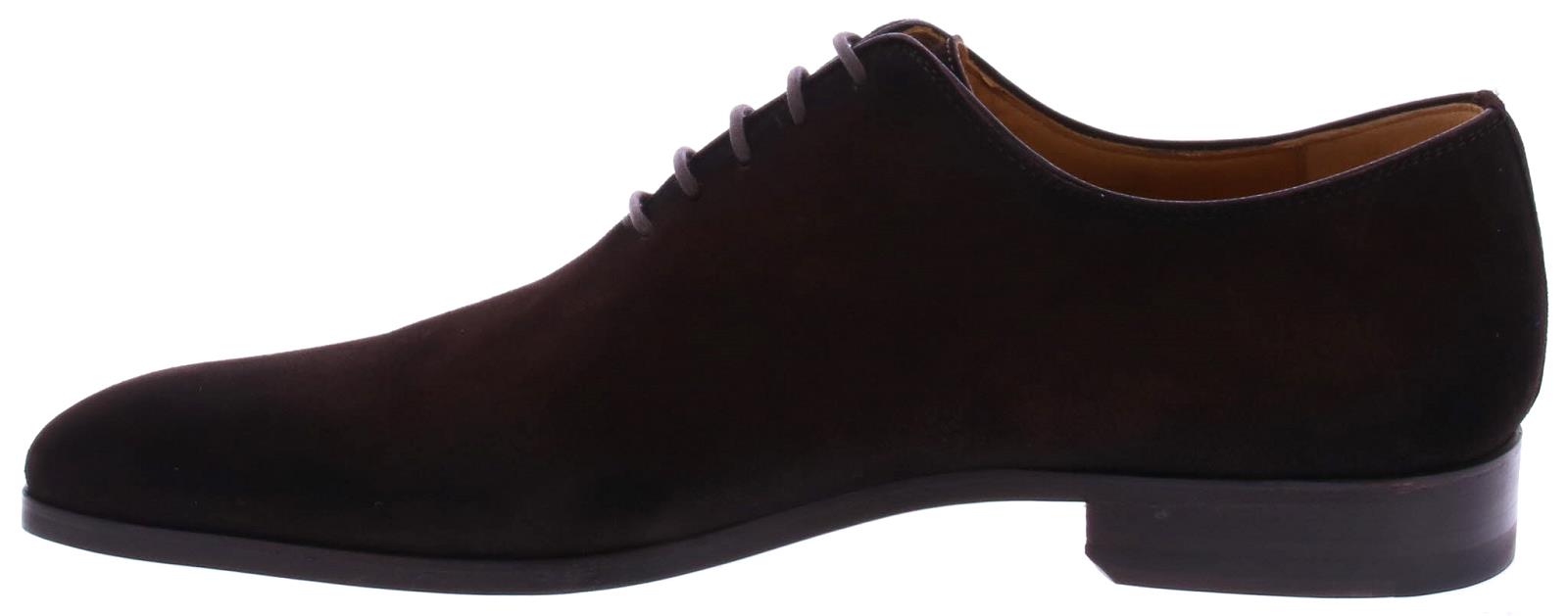 Donker bruine suede heren veterschoen van Magnanni. Deze schoen is gemaakt uit 1 stuk leer en heeft dus geen stiknaden op het voorblad. De zool is van leer, ingezet met rubber.