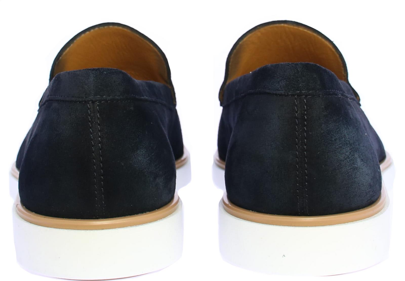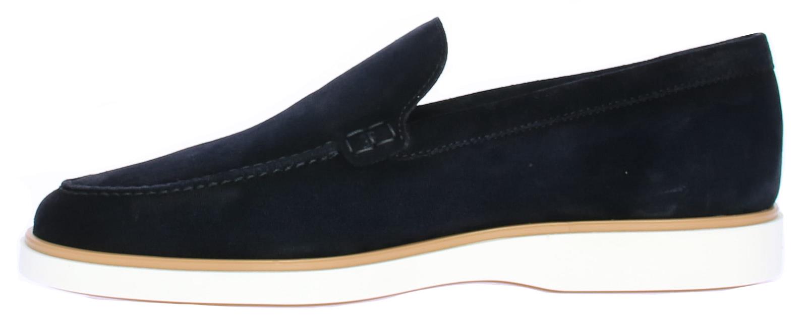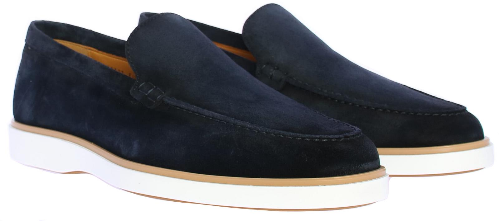 Donker blauwe suede heren instapper van Magnanni. Deze sportieve instapper komt op een witte rubberen zool en is leer gevoerd.