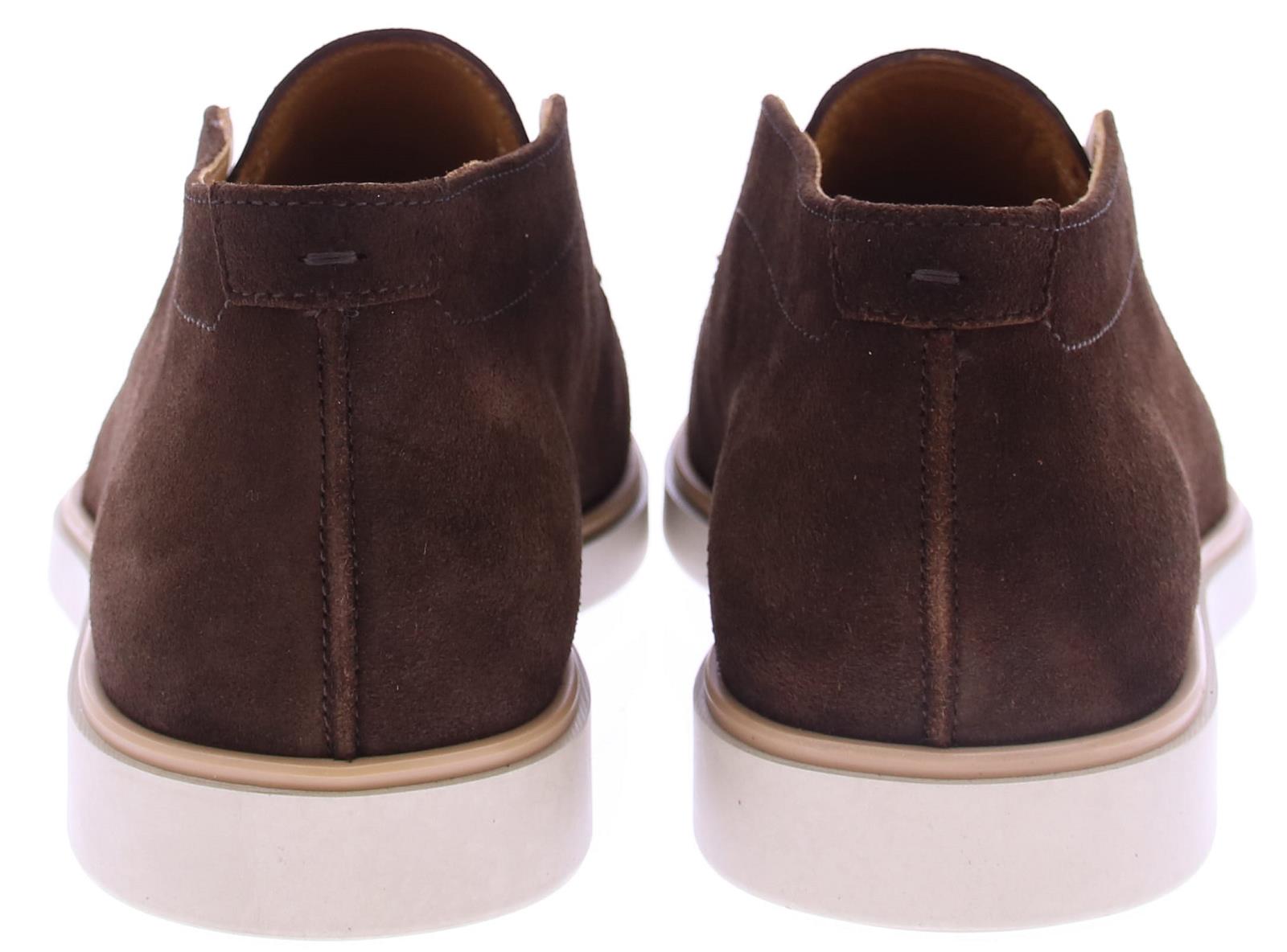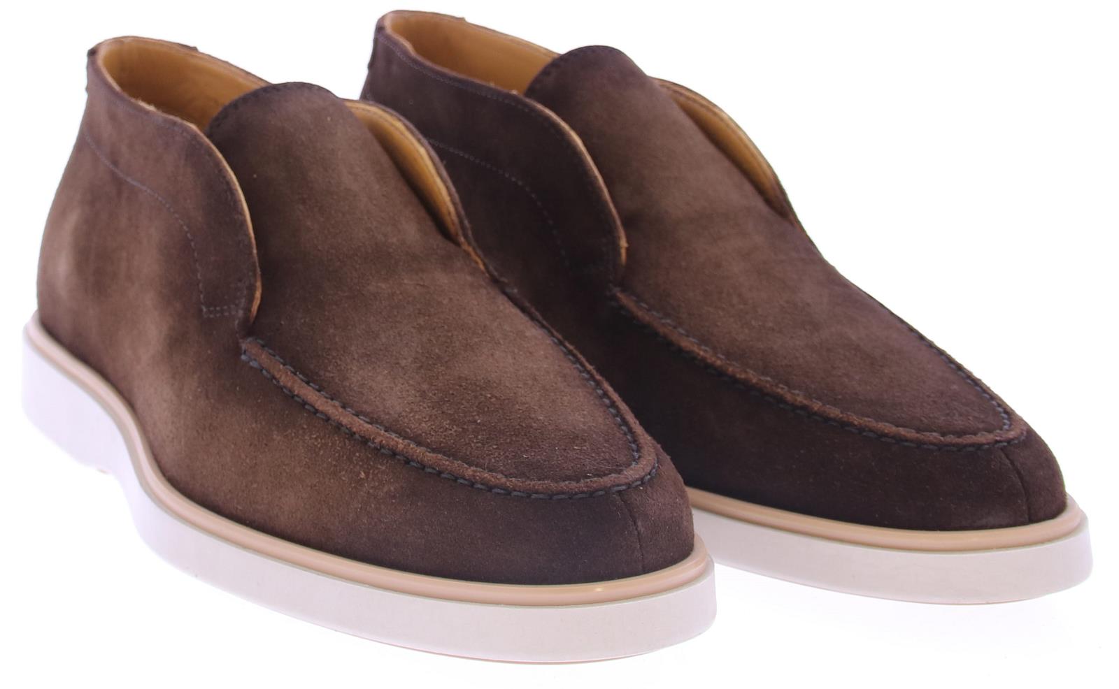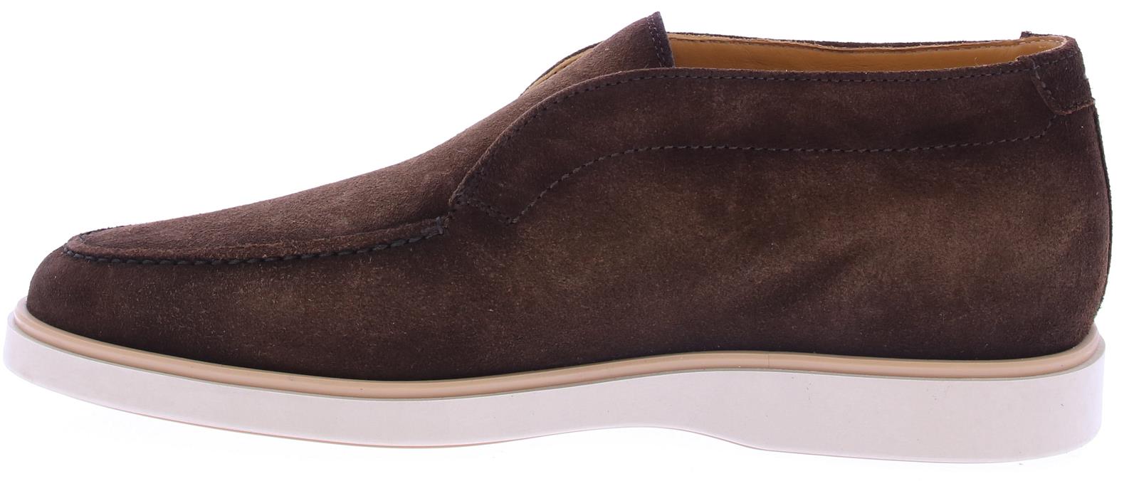 Heren halfhoge snap on loafer uitgevoerd in midden bruin suede met leren voering op een sporieve rubber zool.