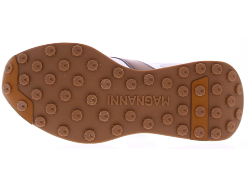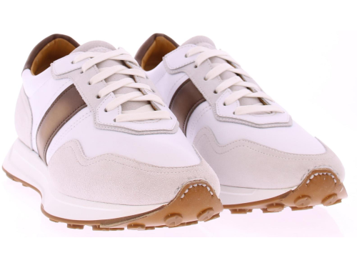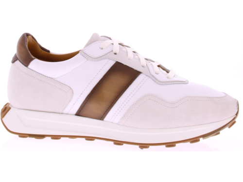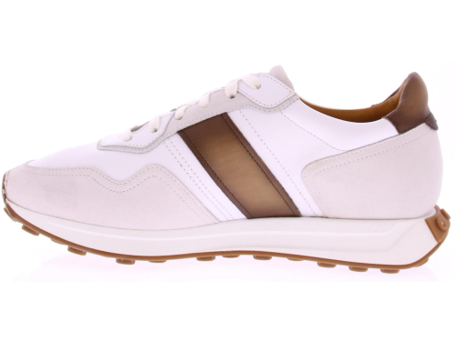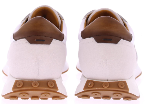 Sneaker van Magnanni uitgevoerd in wit met zand/room suede. De schoen heeft bruine accenten, en de voering is van kalfsleer. De zool is van rubber en het voetbed uitneembaar.