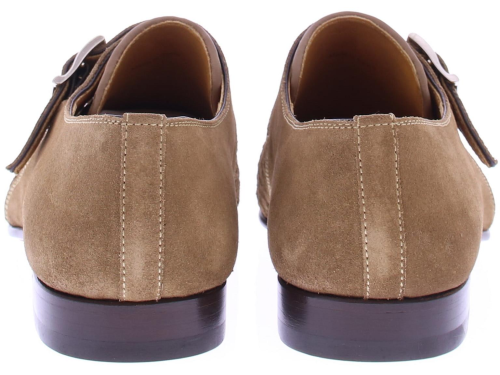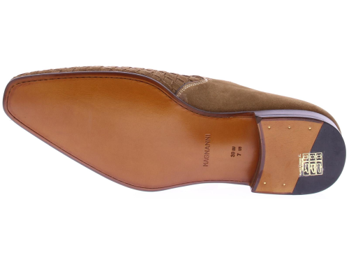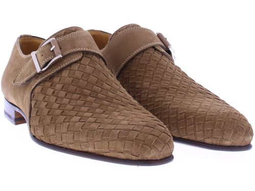 Heren gespschoen van Magnanni met gevlochte voorblad in beige suede uitgevoerd. De schoen heeft een leren voering en zool.