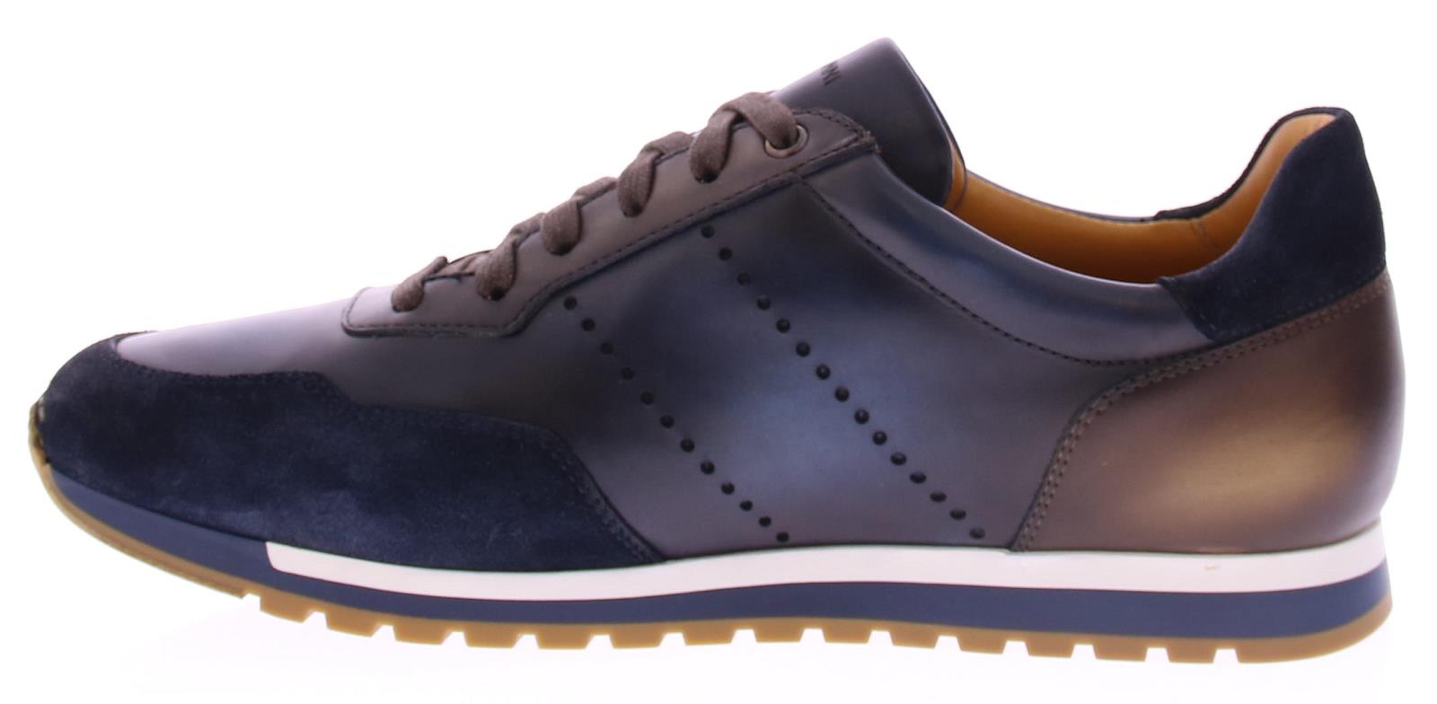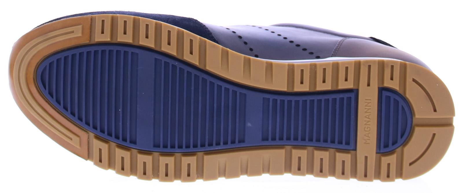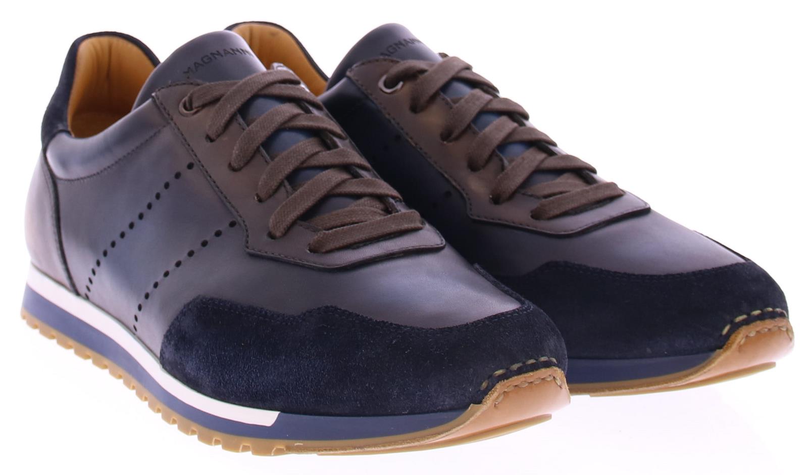 Magnanni heren sneaker in donker blauw leer met suede. De schoen heeft als accentkleuren een cognac leren hiel en een donker bruin leren veter stuk. Hierdoor is de schoen makkelijk te combineren met vele kleuren kleding. De zool is van rubber en de voering van leer. Het suède materiaal aan de buitenkant en het leer aan de binnenkant zorgen voor een luxe uitstraling en een zacht gevoel aan de voeten.