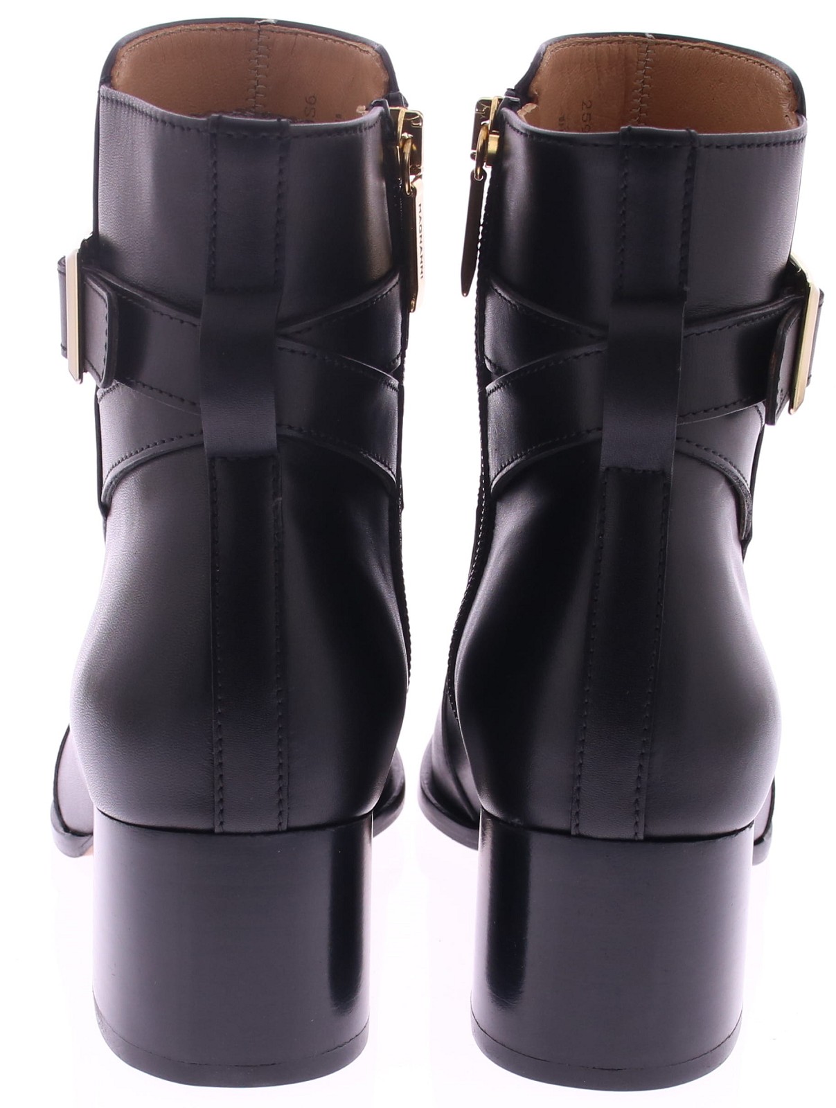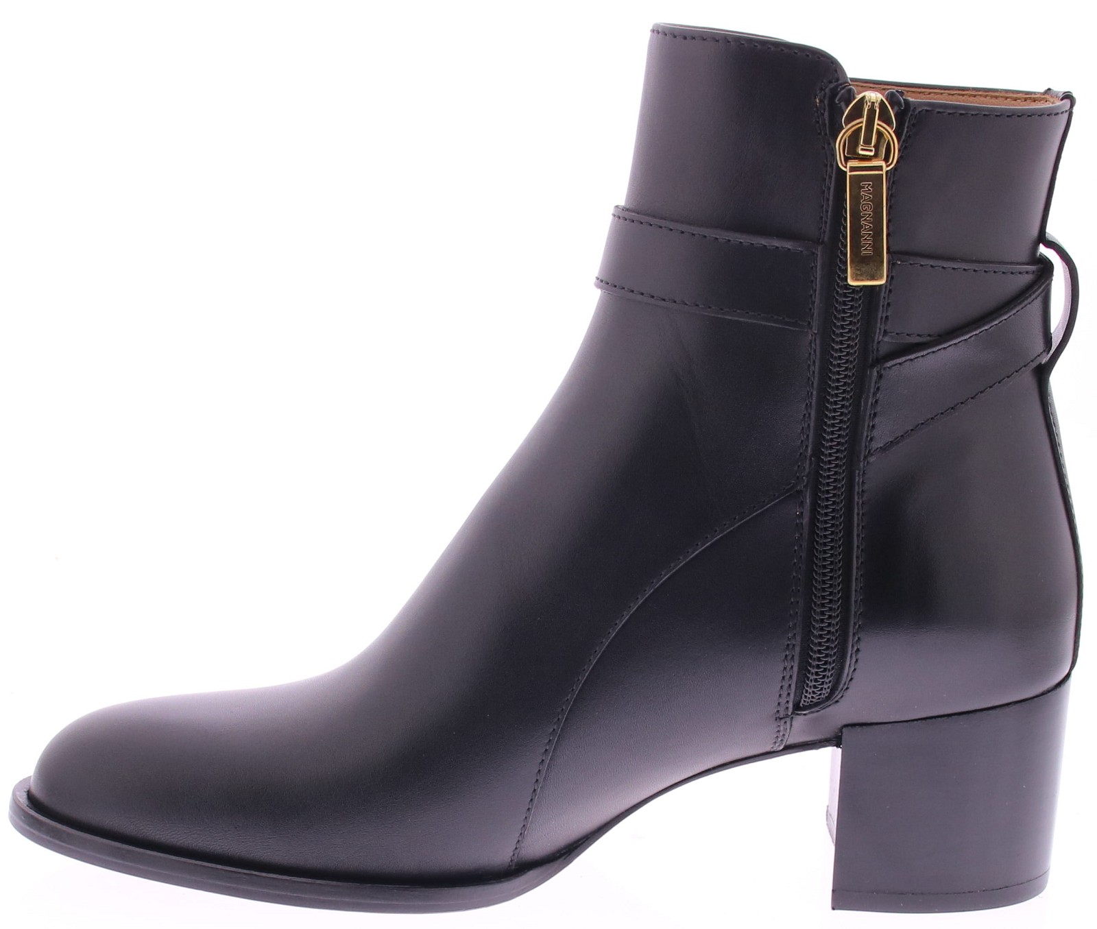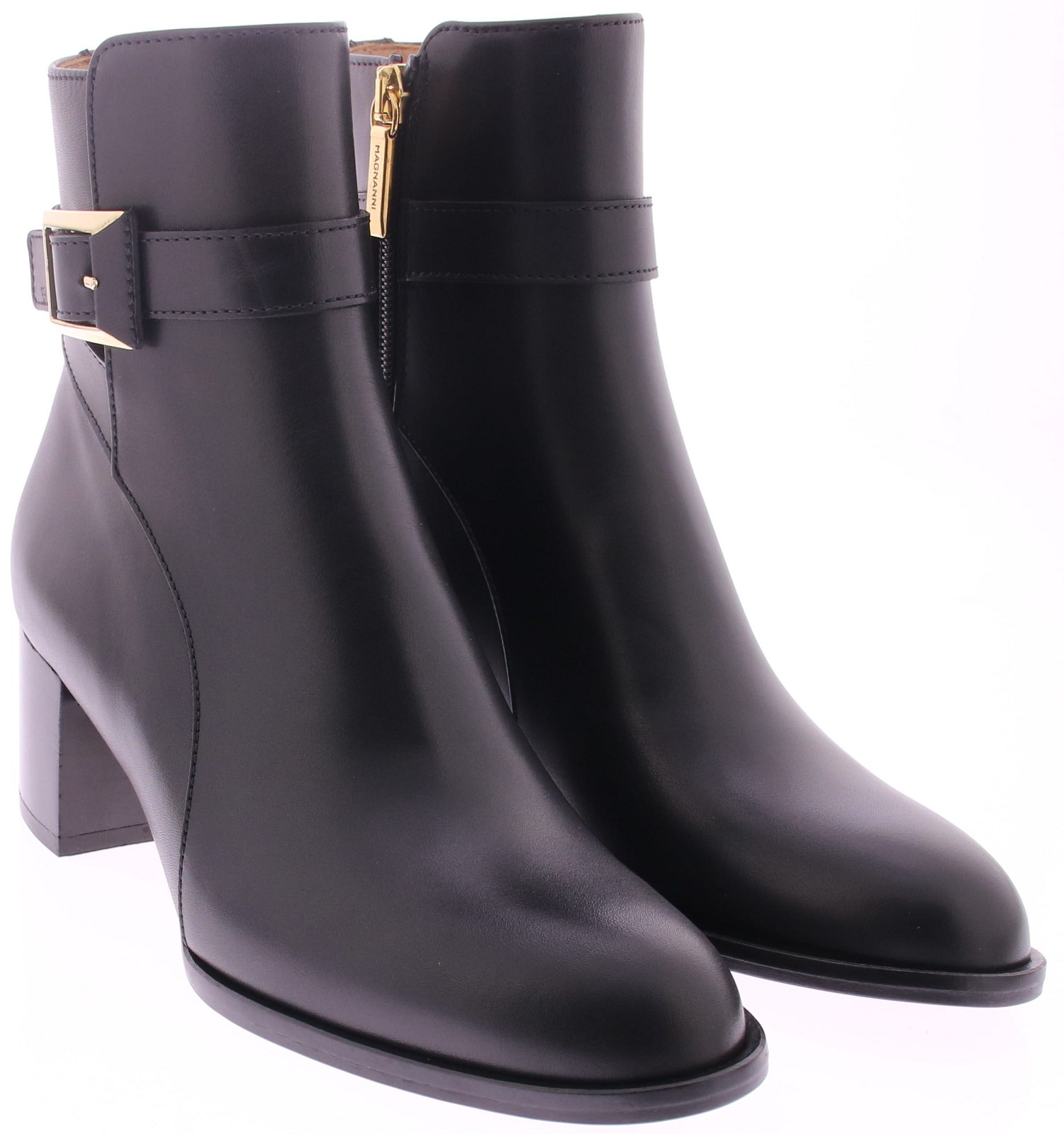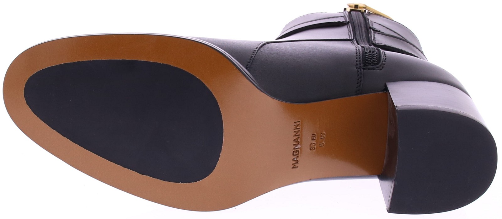 Elegante zwart korte leren dames laars van Magnanni. De laars heeft aan de binnenkant een rits voor een makkelijke instap, een blokhak met een hakhoogte van ongeveer 5 cm en een leren loopzool met rubberen inzet. De schacht is voorzien van een leren bandje met luxe goudkleurige gesp. De luxe uitstraling van het leer en de fijne pasvorm zijn kenmerkend voor dit Spaanse merk.