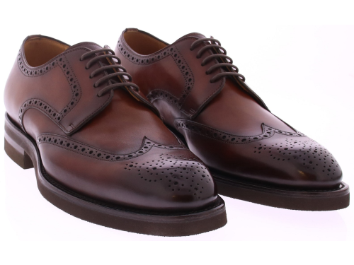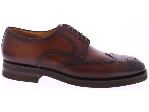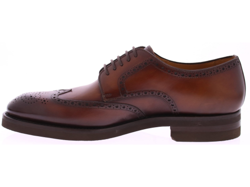 Deze stijlvolle brogue veterschoen van Magnanni's Selection Line is een toonbeeld van elegantie, ambacht en klasse. Het met de hand gepatineerde bruine leer, gecombineerd met verfijnde perforaties (broguing), geeft deze schoen een luxueuze en onderscheidende uitstraling. De toevoeging van een rubberen zool zorgt voor hedendaags comfort en praktische duurzaamheid. Waarom deze schoen bijzonder is: De combinatie van de klassieke wingtip met de rijke handfinish van het leer maakt deze brogue geschikt voor zowel formele als semi-formele gelegenheden. De rubberen zool biedt een subtiele, moderne upgrade voor wie stijl en draagcomfort wil combineren. Perfect voor: Trouwen, business looks, galadiners of gewoon een elegante workday-outfit. Staat prachtig onder een pak, maar doet het ook uitstekend bij een donkerblauwe jeans met blazer.