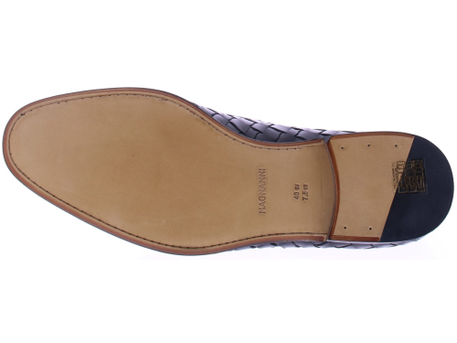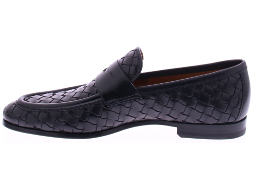 Zwart vlechtleren heren loafer van Magnanni. Dit luxe model is uitgevoerd in gevlochten leer in de kleur Boltiarcade Passado Blu Talco Negro, met een diepe, handgefinishte tint die het ambacht prachtig versterkt. De elegante band over de wreef en de verfijnde belijning geven de instapper een stijlvolle, tijdloze uitstraling. De leren zool en leren voering zorgen voor soepel draagcomfort. Een exclusieve keuze voor heren die kwaliteit en vakmanschap waarderen.