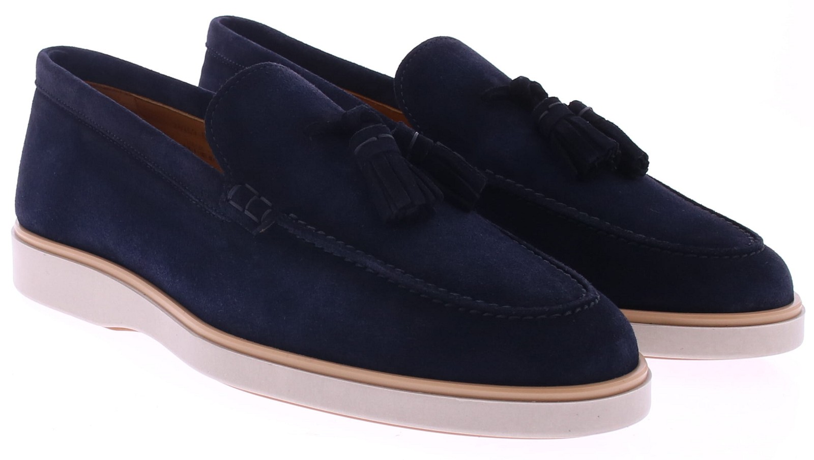 Blauw suède heren loafer van Magnanni. Dit sportief-chique model is uitgevoerd in zacht suède in de kleur Crosta Difu Azul en is voorzien van elegante kwastjes voor een verfijnde uitstraling. De lichte, comfortabele zool geeft de instapper een moderne en veelzijdige look, terwijl de leren voering zorgt voor een soepel draaggevoel. Een stijlvolle keuze voor heren die luxe en casual comfort moeiteloos willen combineren.