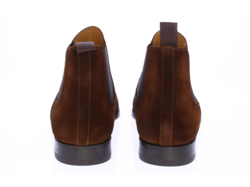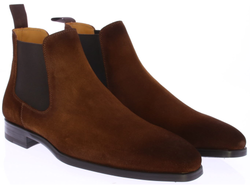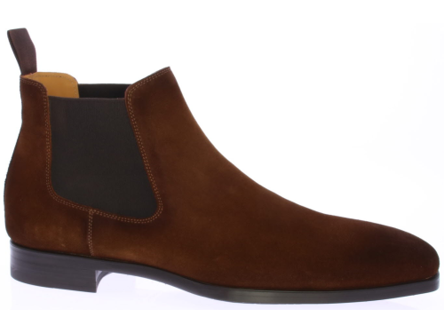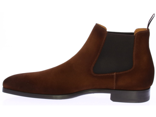 Cognac suede heren chelseaboots van Magnanni. De laarzen hebben een rubberen onderwerk met leren voering en een treklus aan de achterkant voor een gemakkelijke instap.