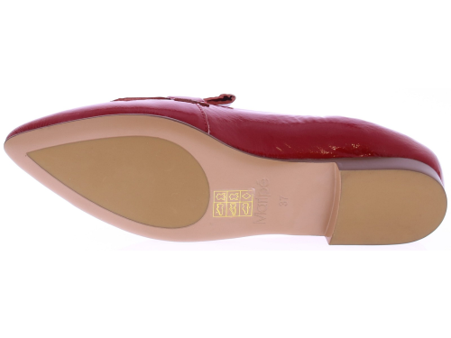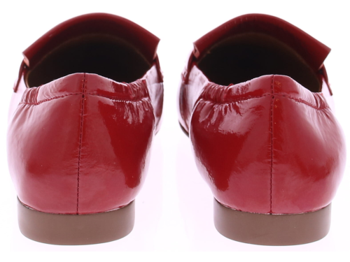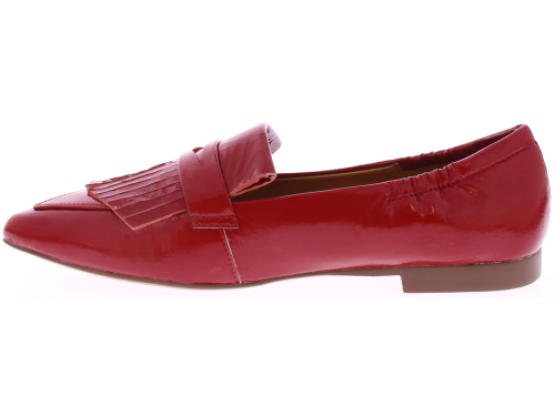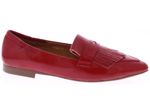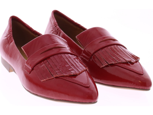 Rood lakleren dames instapper van Maripe. Dit model heeft een puntige neus en een soepel laklederen bovenwerk. De binnenkant is in leer uitgevoerd. De band met franjes op de neus geeft de schoenen een casual look. De elastische bewerking bij de hiel zorgt voor een goede pasvorm. Het hakje is circa 1 cm hoog en de loopzool is van kunststof gemaakt.