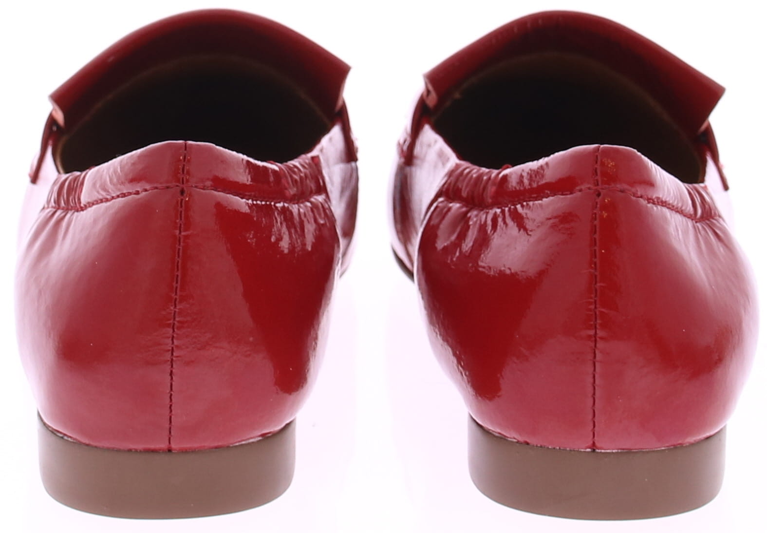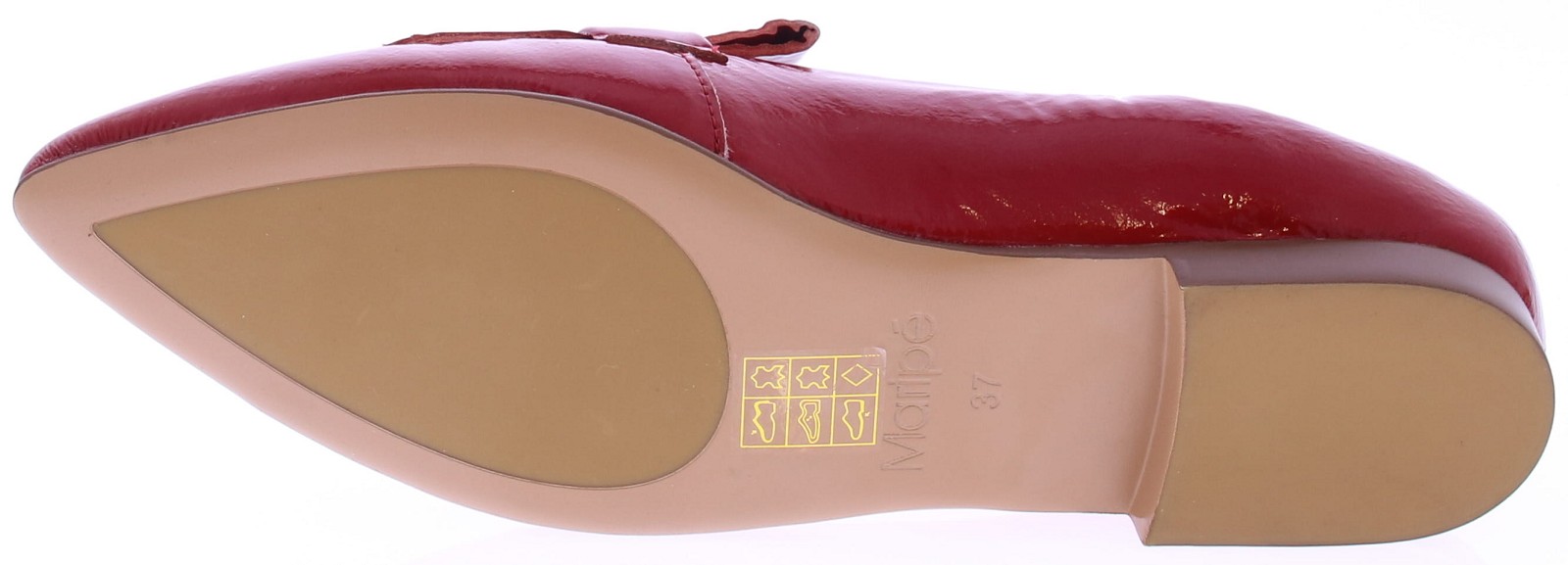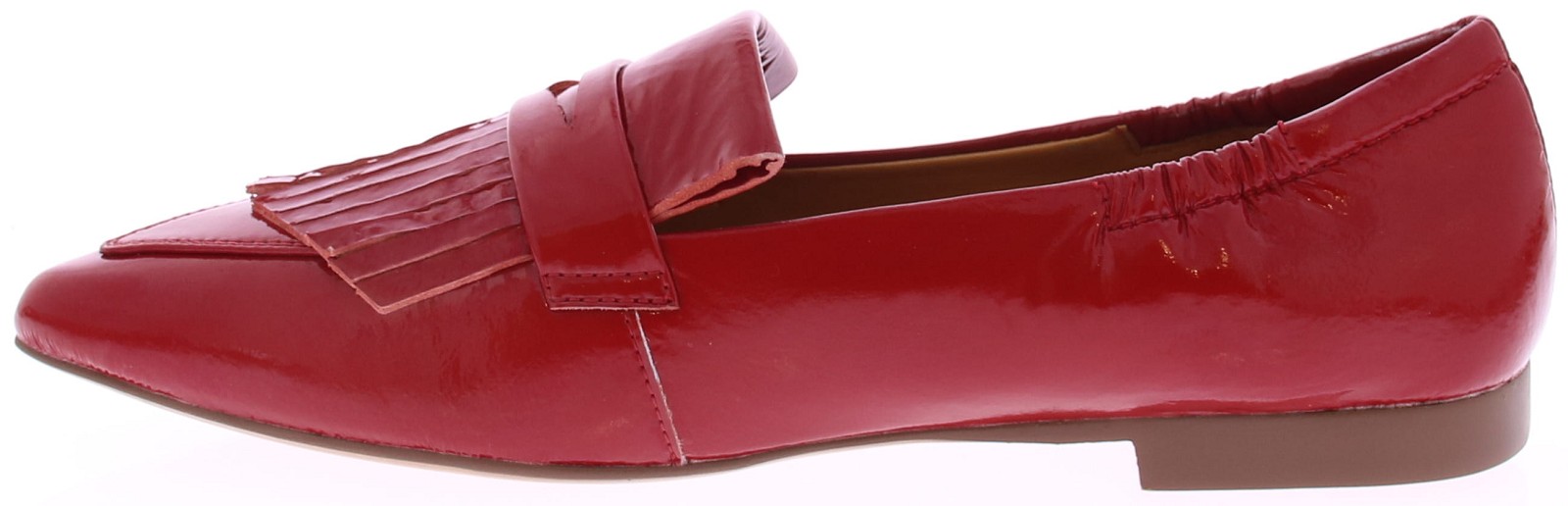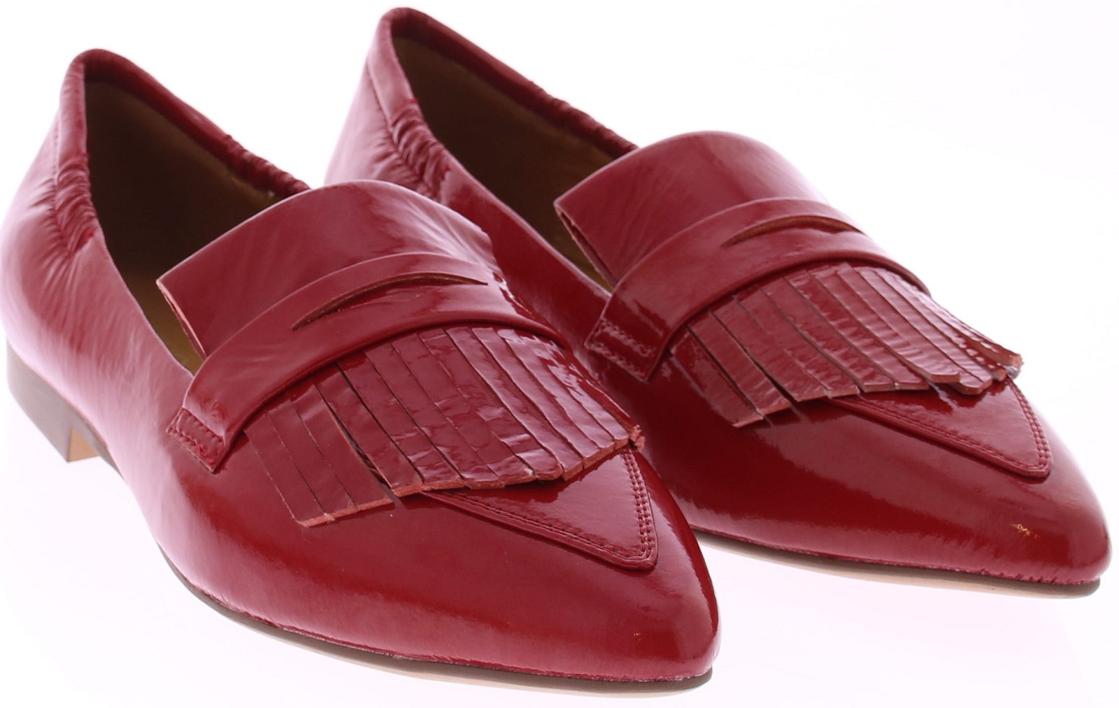 Rood lakleren dames instapper van Maripe. Dit model heeft een puntige neus en een soepel laklederen bovenwerk. De binnenkant is in leer uitgevoerd. De band met franjes op de neus geeft de schoenen een casual look. De elastische bewerking bij de hiel zorgt voor een goede pasvorm. Het hakje is circa 1 cm hoog en de loopzool is van kunststof gemaakt.