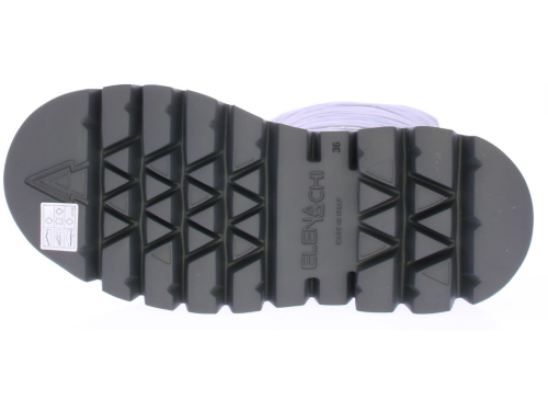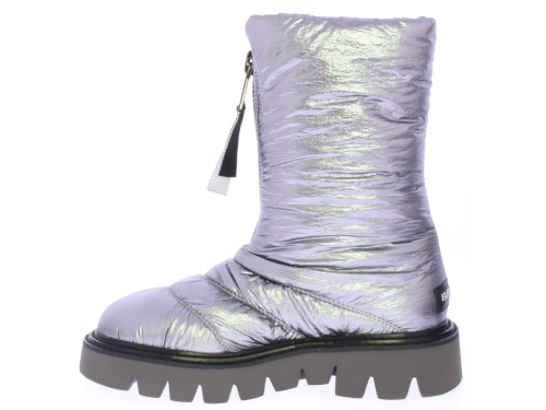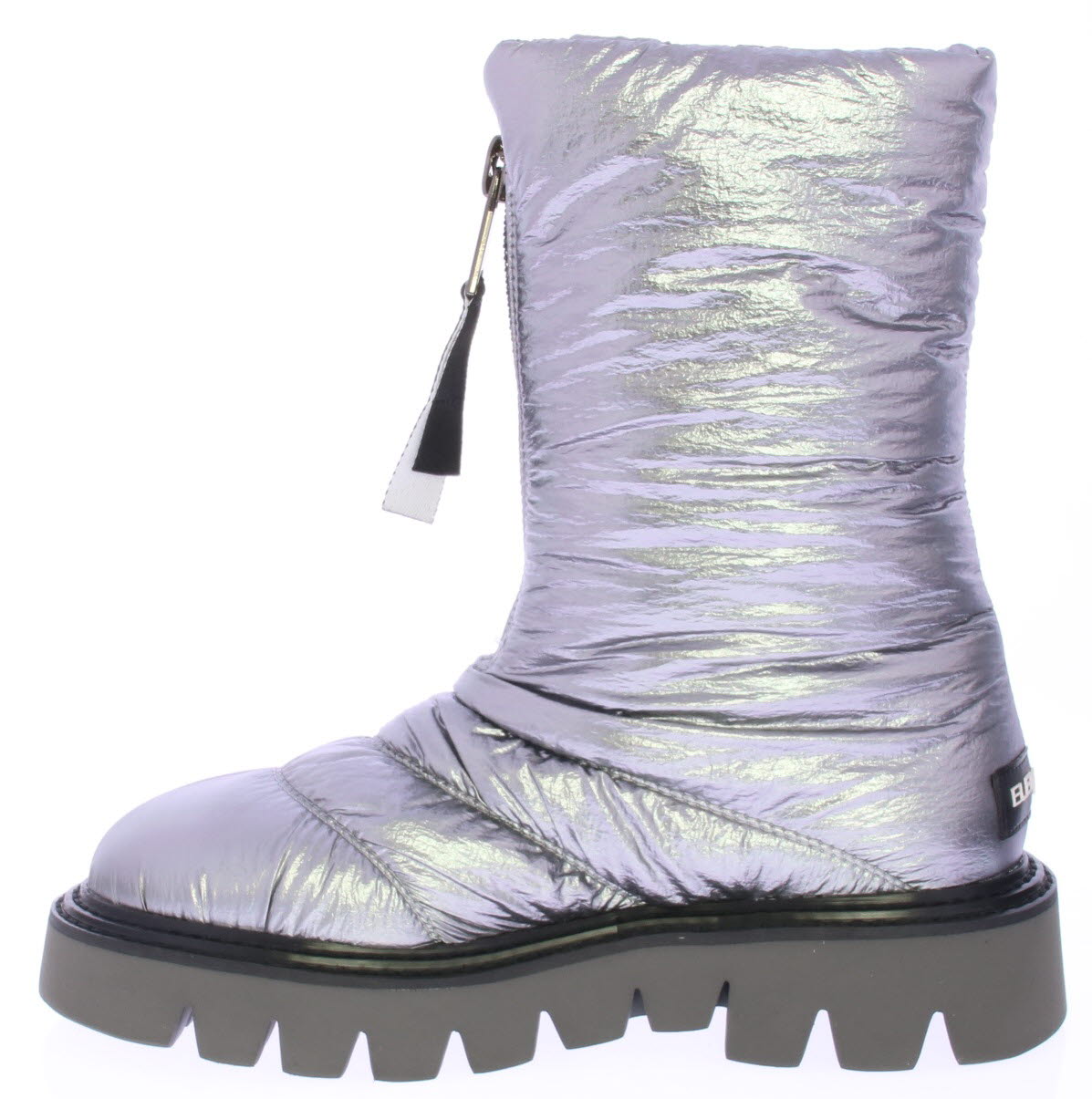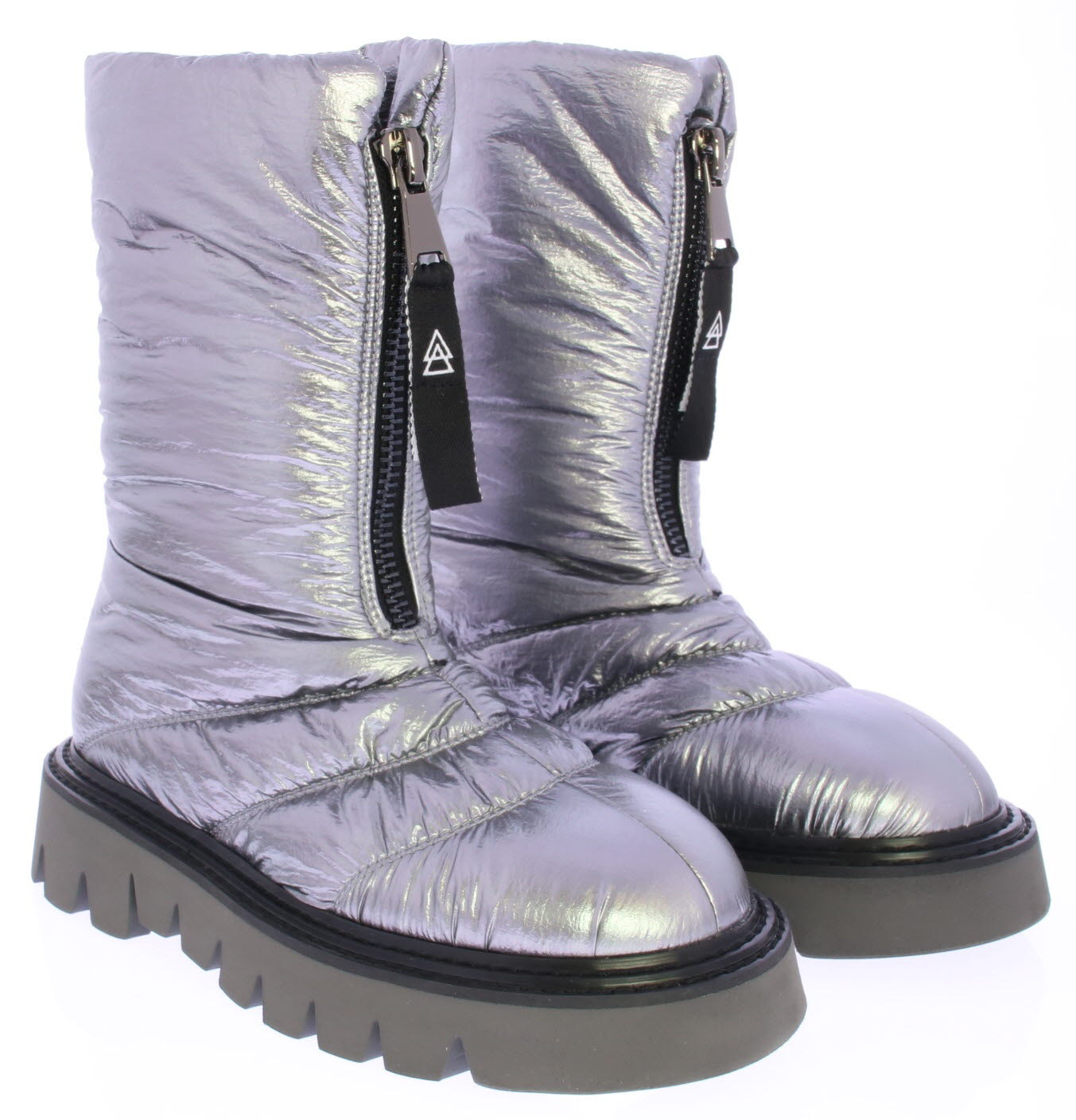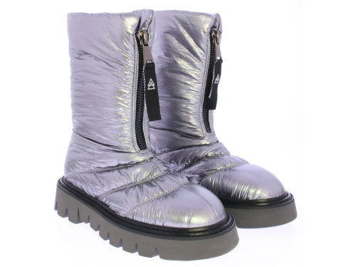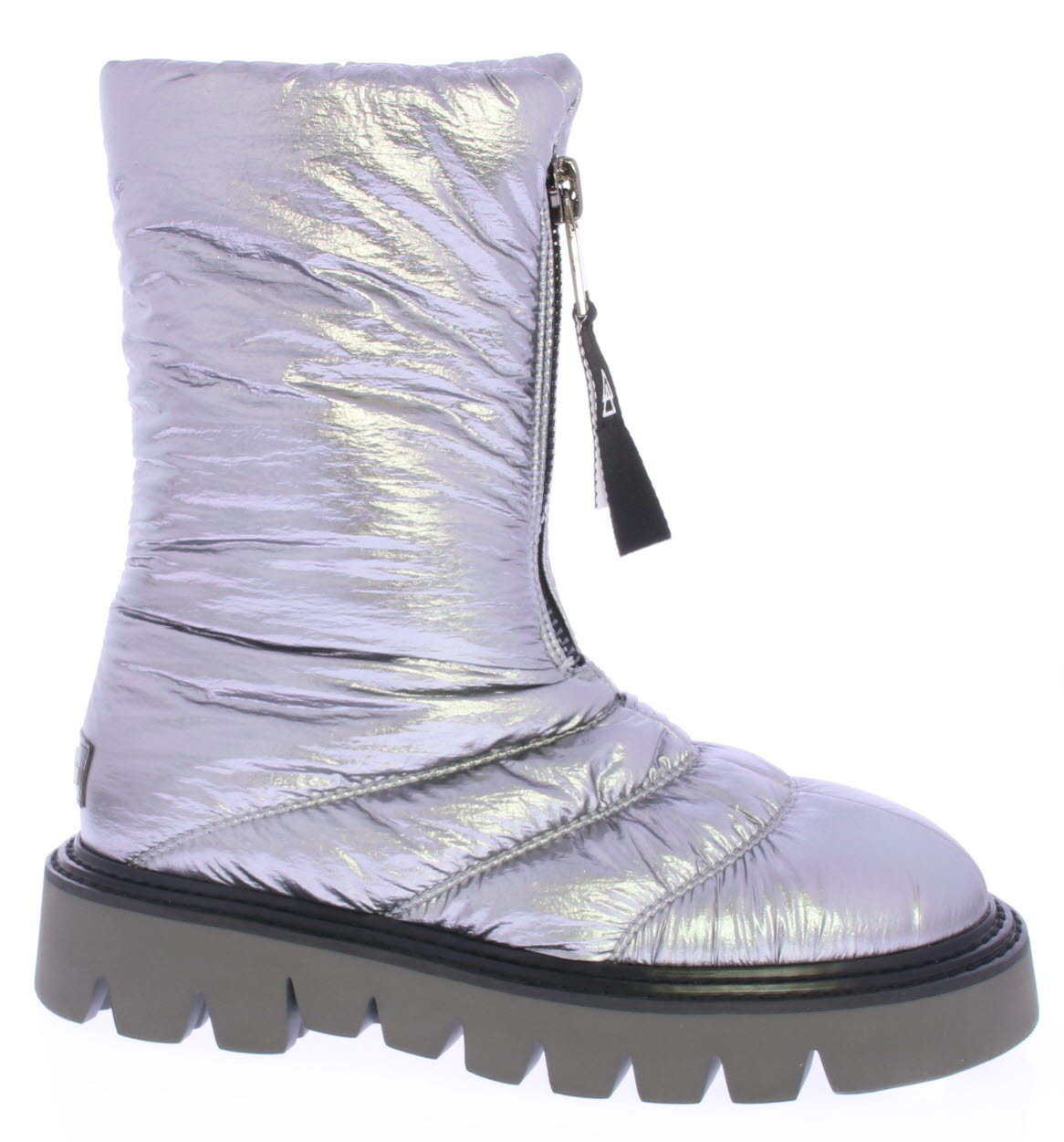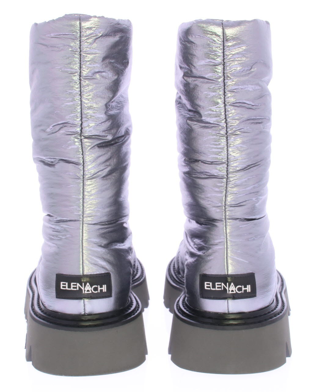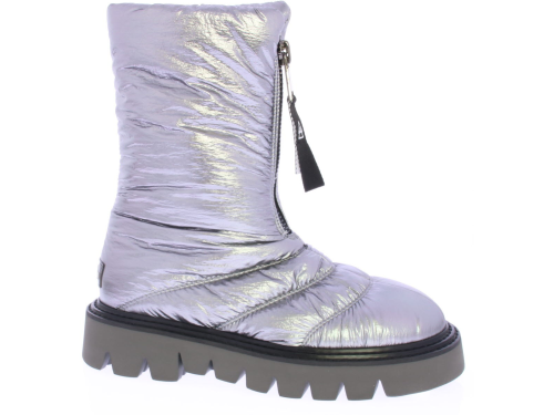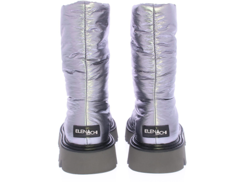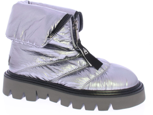 Dames enkel laars van Elena Iachi in zilveren space nylon op een grove sportieve zool. De laars kan ook omhoog gedragen worden. De stof is waterafstotend. De voet is leer gevoerd.