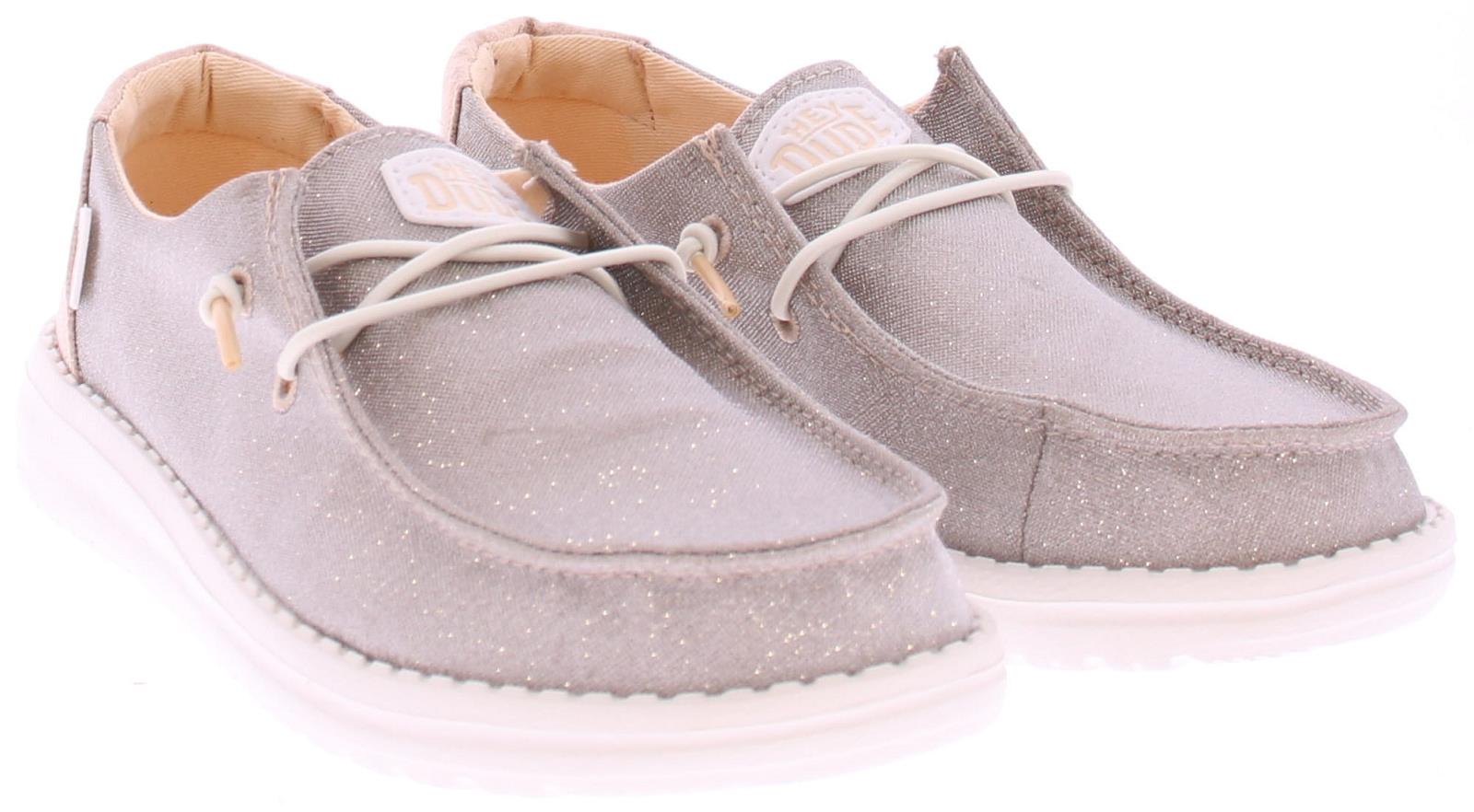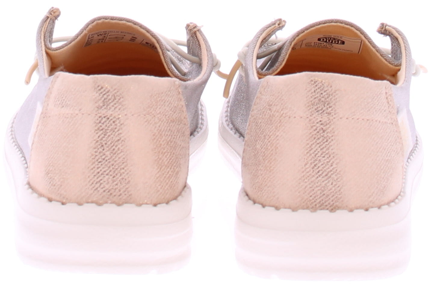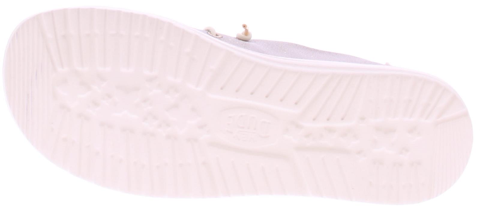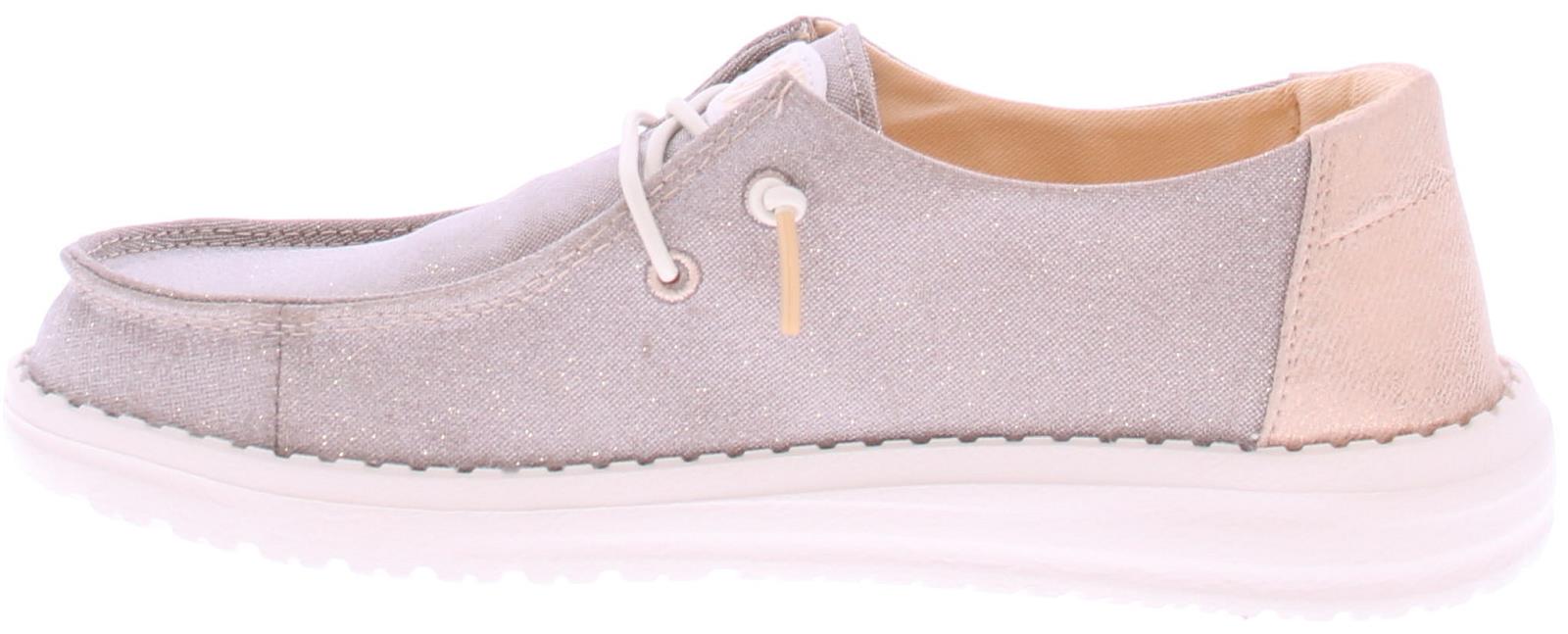 Goud/Platina stoffen glitter dames instapper van Hey Dude. Deze fijne instapper heeft een bovenwerk van textiel. Een elastische easy on vetersysteem vergemakkelijkt de instap. De Ultralichte zool en het met kurk beklede traagschuim voetbed zorgen voor extra demping en comfort.