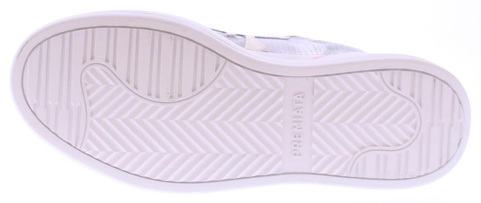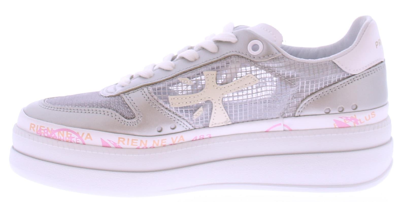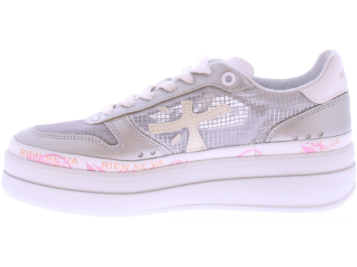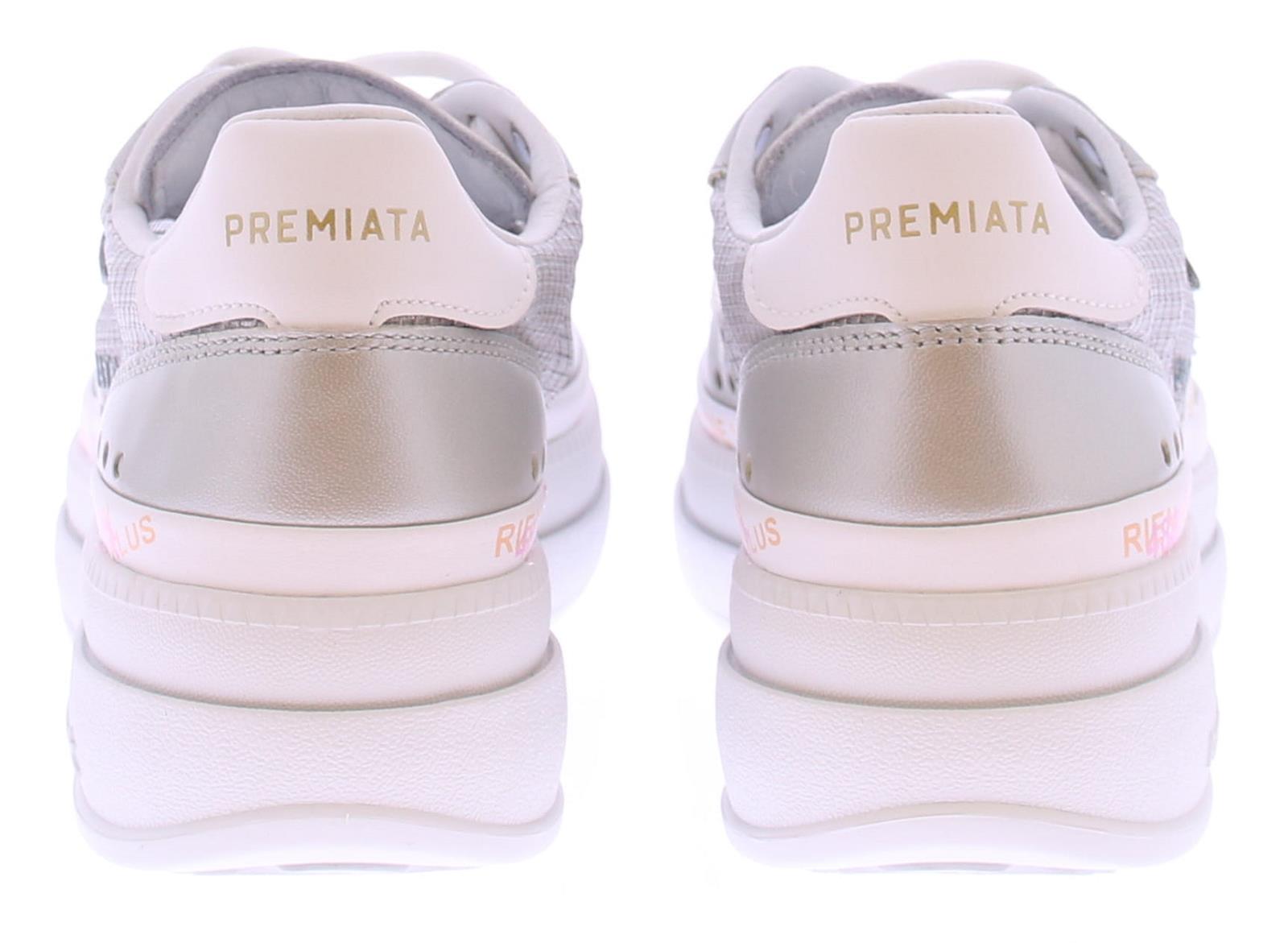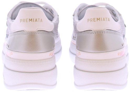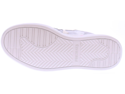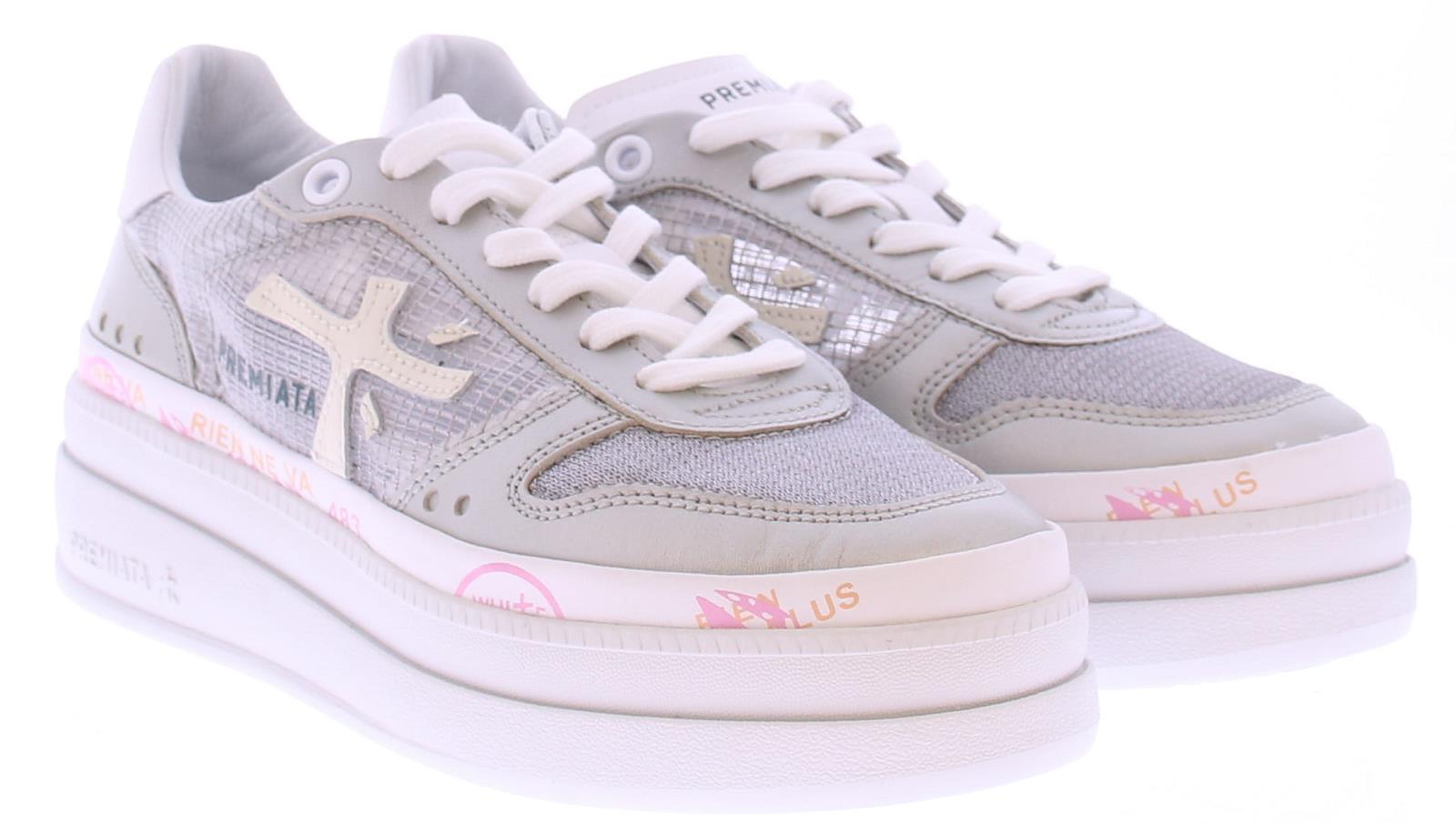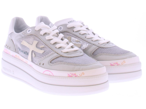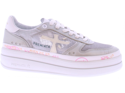 Zilver suede met stoffen dames sneakers van Premiata. De stoffen inzet heeft een lichte metallic glans. Aan de zijkant zit het logo teken in wit leer. De sneaker heeft een hoge zool van 4 cm hoog met de kenmerkende Premiata bedrukking in zacht roze. Het zachte comfortabele voetbed is eventueel uitneembaar.