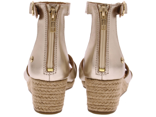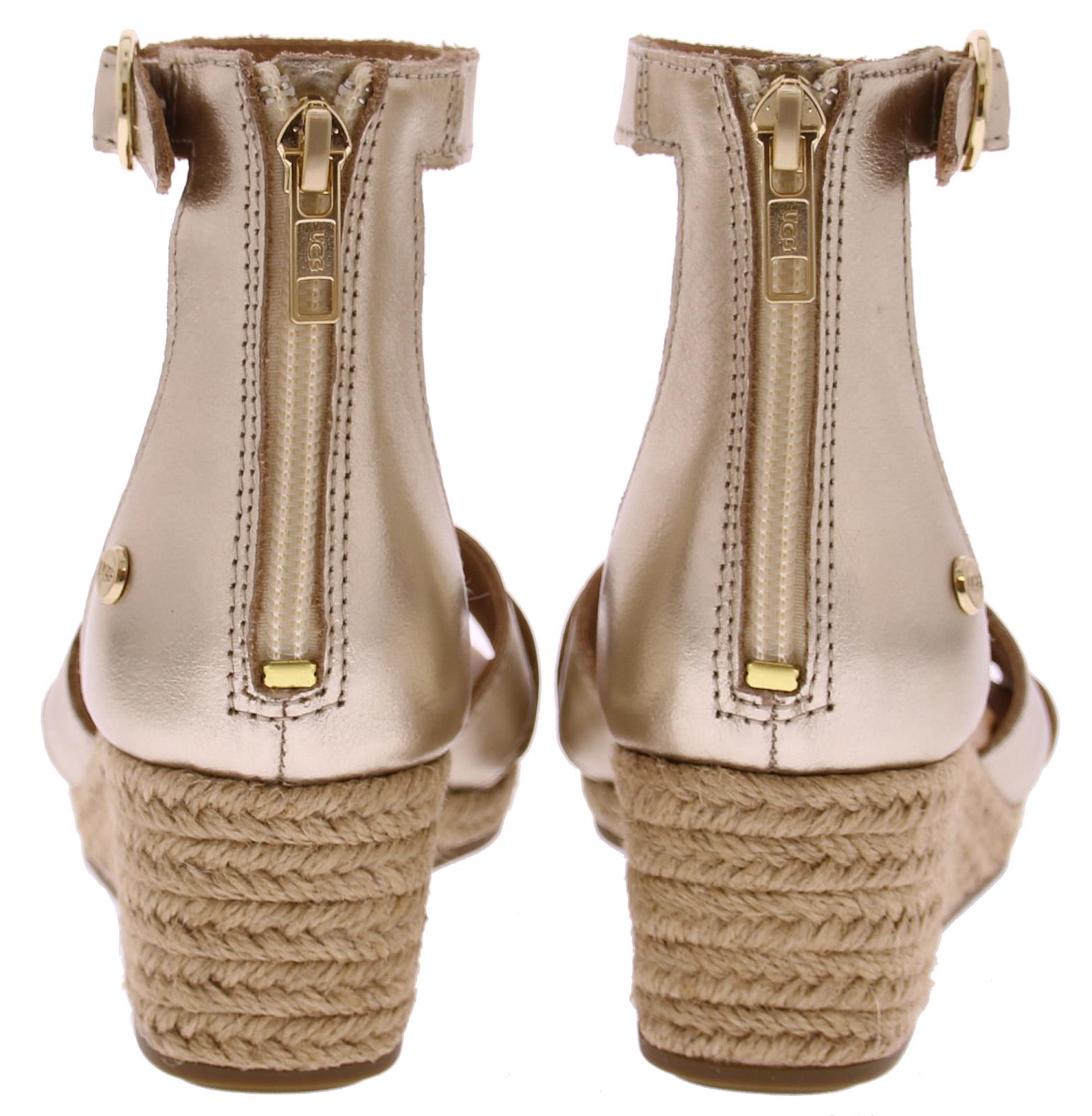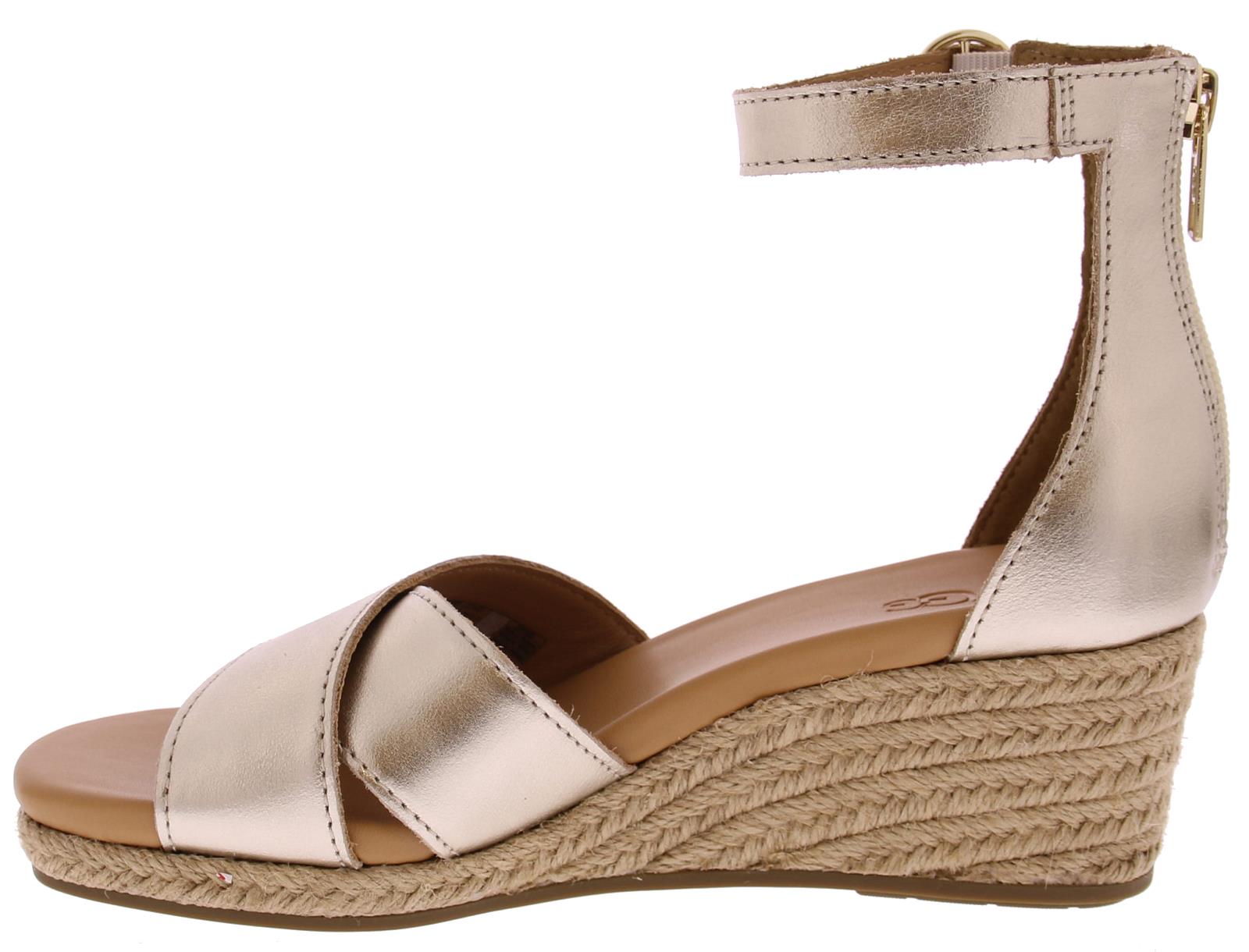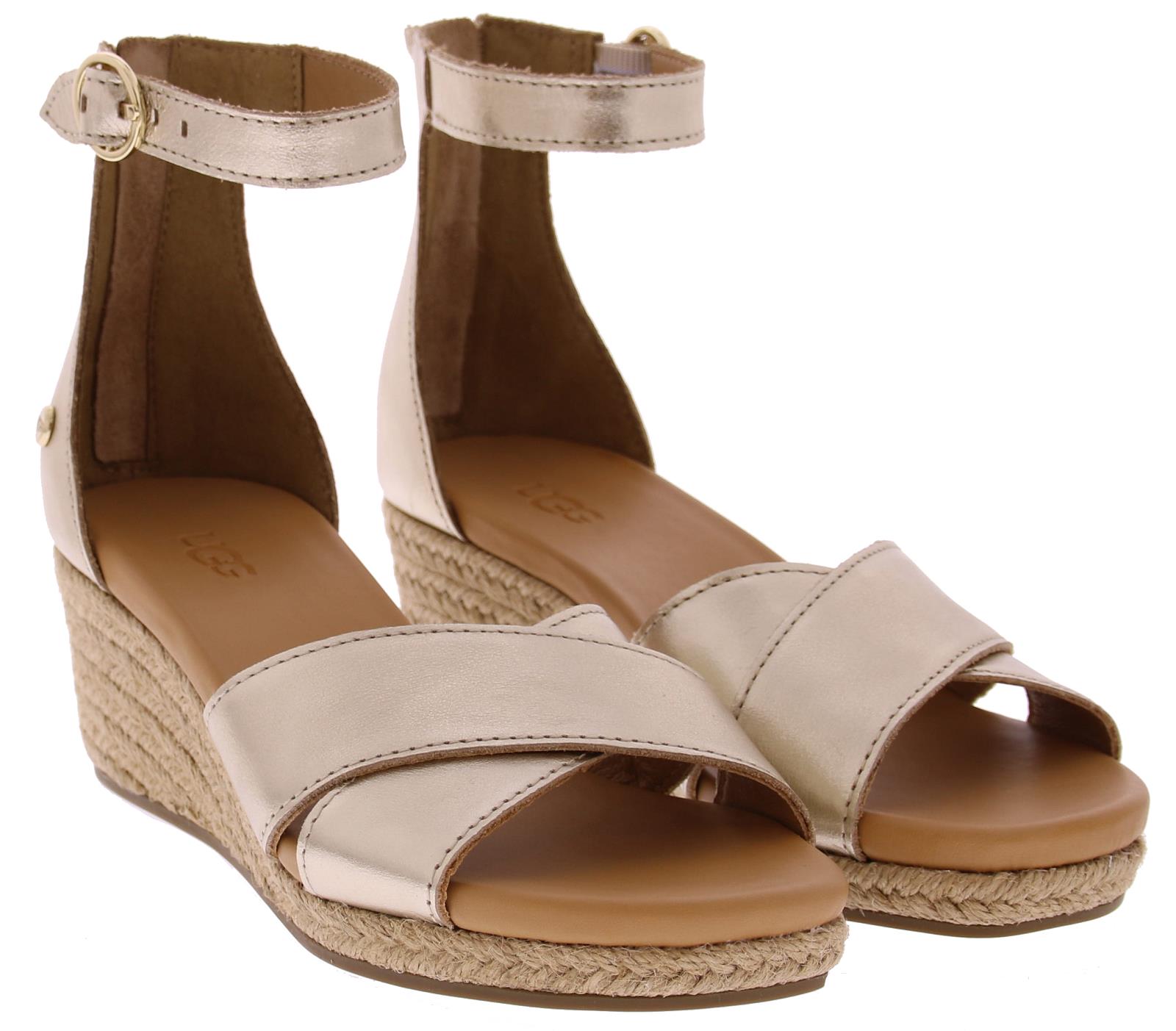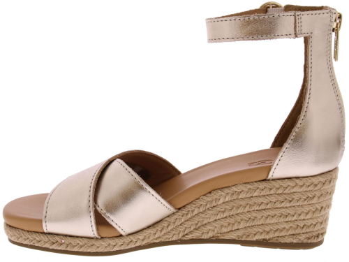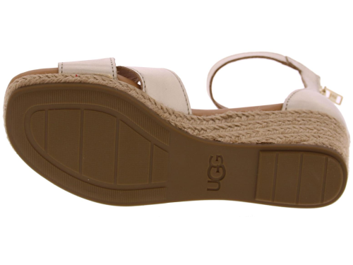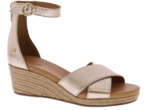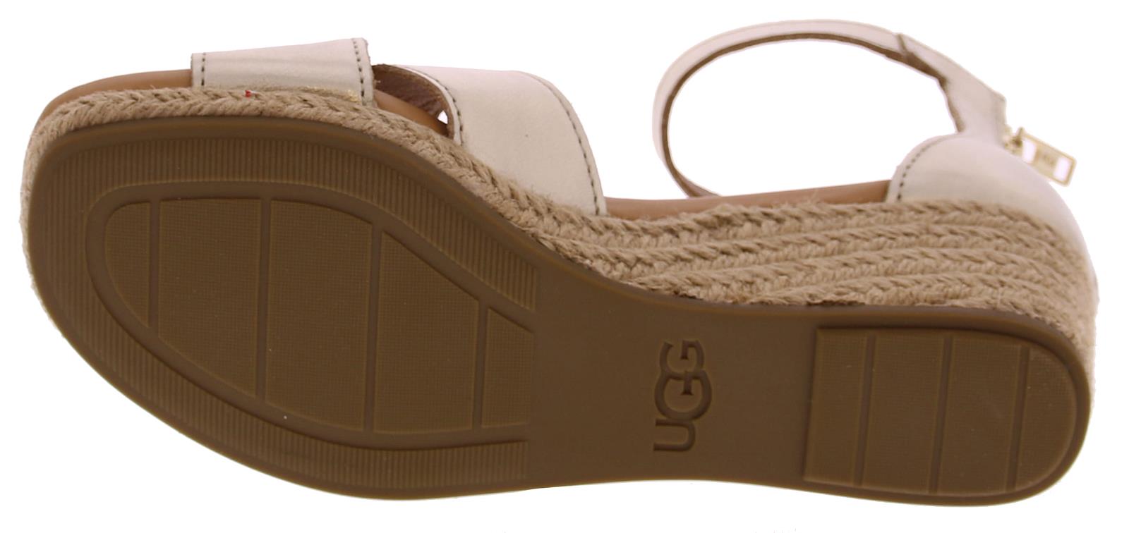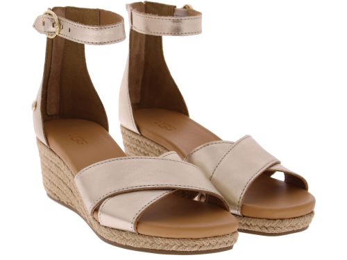 Platina leren dames sandaal van Ugg . Deze sandaal met dichte hiel is uitgevoerd met een enkelband met gespje, en rits op de hiel. De sleehak is bekleed met touw en de hoogte is 4 cm. De rubberen zool en het zachte voetbed maken het een super comfortabele maar toch vrouwelijke sandaal.