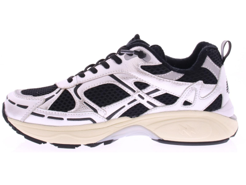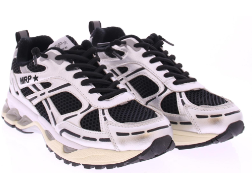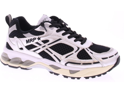 Dames sneaker van MRP artikel MRP01-V.18. Het bovenwerk is van zilver leer accenten en zwarte mesh. Met achter op de hiel metallic zilver met het MRP logo in zwart . De tussenzool is opgebouwd uit wit met beige foam en grijze accenten. Het loopvlak is van zwart rubber met een witte stabilisator in het midden. De voering is van stof en het voetbed uitneembaar.