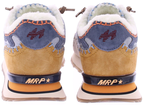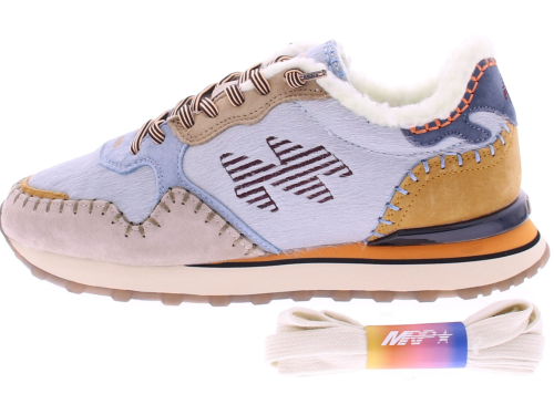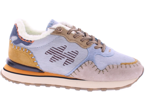 Lichtblauw mix van ponyhair (hairy cow) en beige suède dames sneaker van MRP. De grove sierstiksels geven deze trendy sneaker een stoer randje, terwijl de oranje accenten zorgen voor een fijne afwerking. De sneaker is uitgerust met een elastische veter voor extra gemak, maar wordt ook geleverd met een klassieke veter in de doos – zo kies je zelf je look. De voering is van een heerlijk warme kunststof vacht (alleen zijkanten). Dankzij de comfortabele pasvorm en het uitneembare voetbed is dit de ideale fashion sneaker.