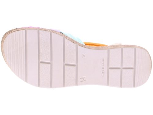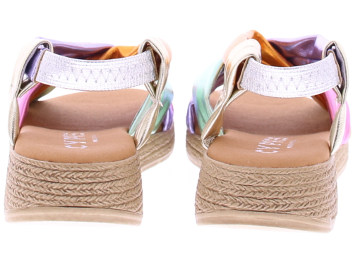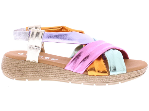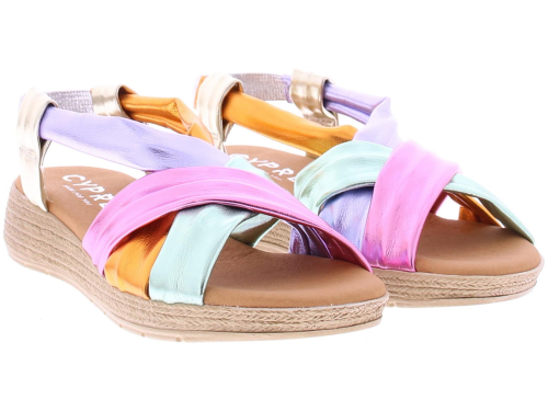 Multikleurige dames sandaal van Cypres. Deze sandaal is gemaakt van PU leer. De super soft banden hebben diverse mettalic kleuren. In de hiel een bandje met elastiek zodat de schoen goed aansluit. De leuke touwzool met iets oplopende sleehak heeft een hoogte van 3 cm.
