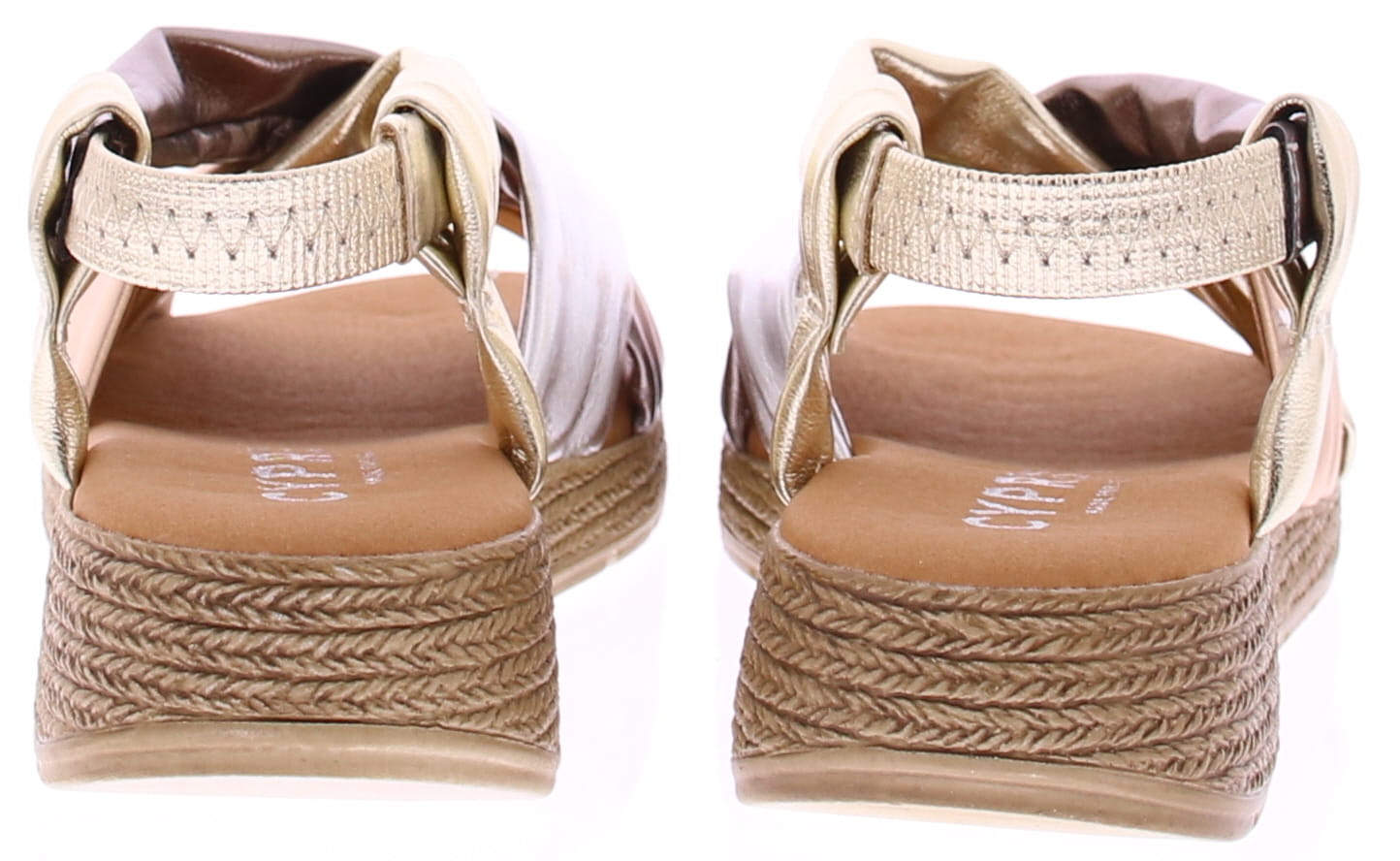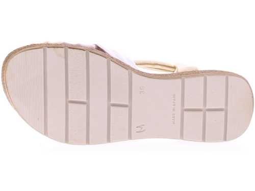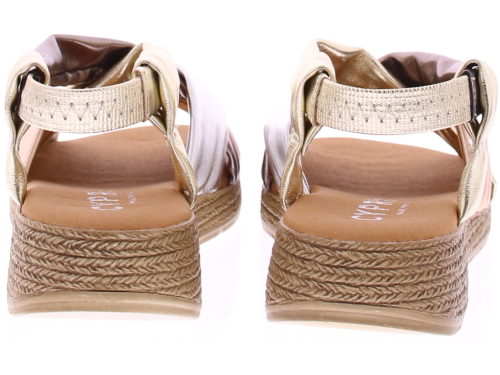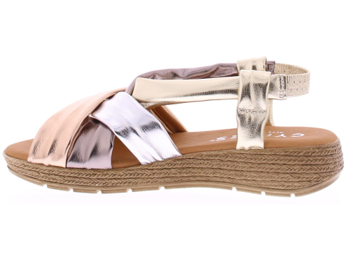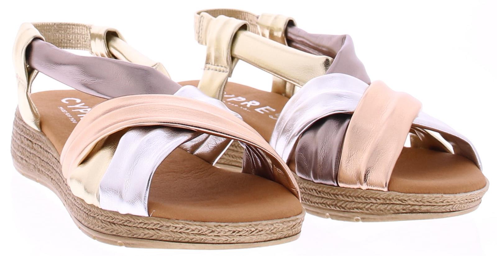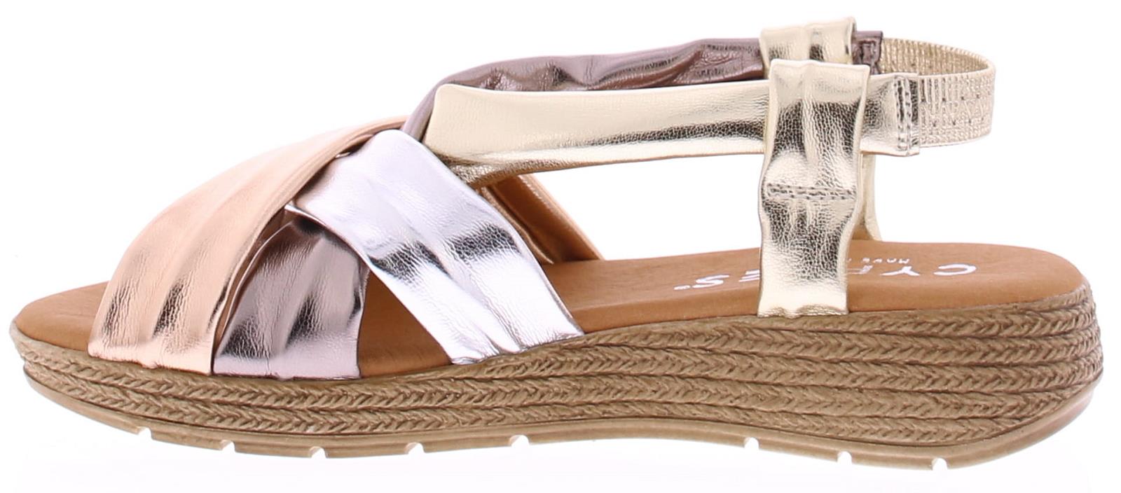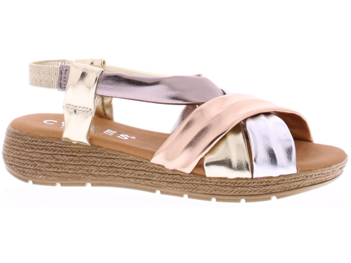 Multi matallic kleurige dames sandaal van Cypres. De banden van deze sandaal zijn gemaakt van super soft PU leer. In de hiel een bandje met elastiek zodat de schoen goed aansluit. De leuke touwzool met iets oplopende sleehak heeft een hoogte van 3 cm.