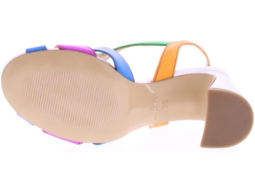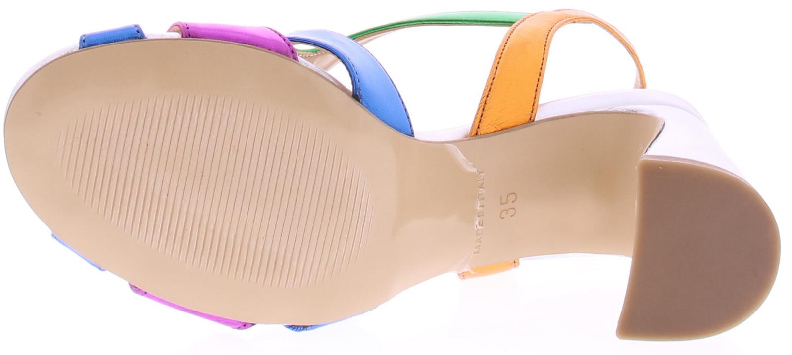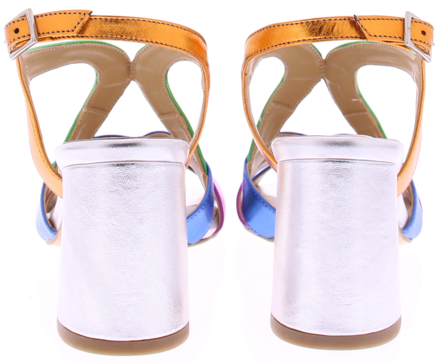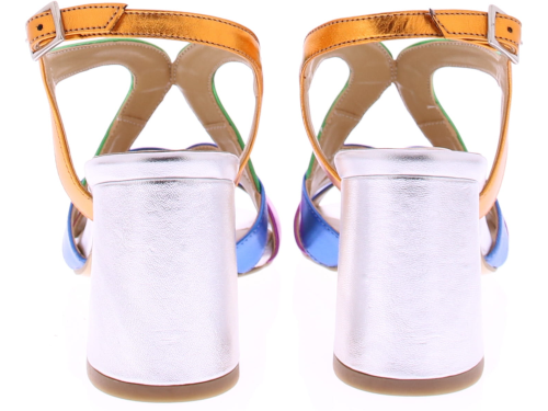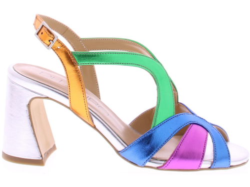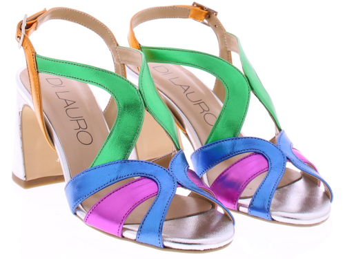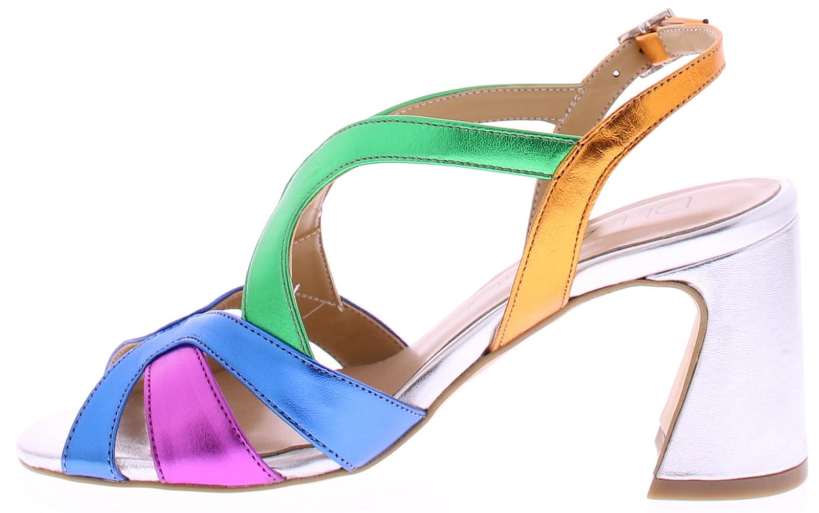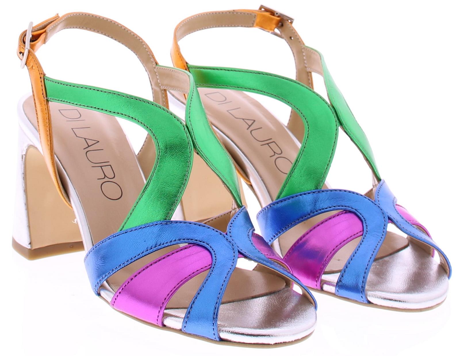 Multikleurige metallic leren dames sandaal van Di Lauro. Deze sandaal heeft sierlijke bandjes over de wreef in de de kleuren, groen, blauw en roze metallic. Om de hiel een oranje bandje met een zilver gespje. De aparte zilvere hak heeft een hoogte van 7cm.
