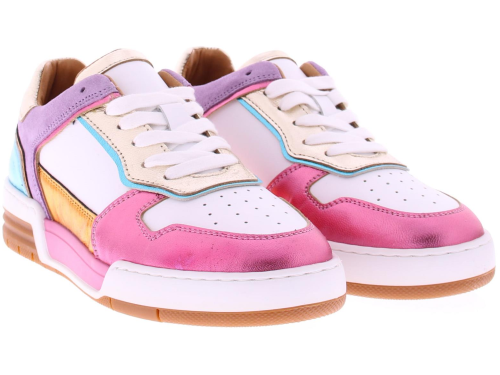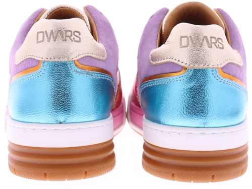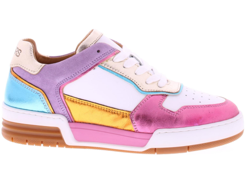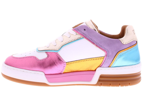 Multikleurige dames sneaker van DWRS. Dit lage basketmodel is uitgevoerd in wit leer en in metallic kleuren. Het voetbed is eventueel uitneembaar.