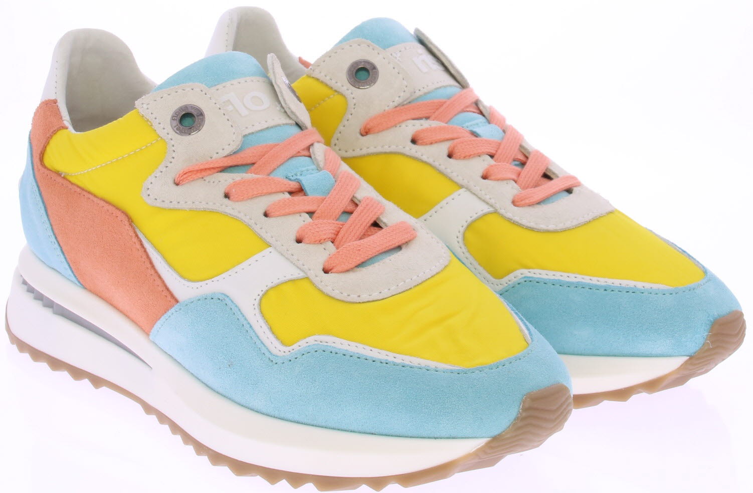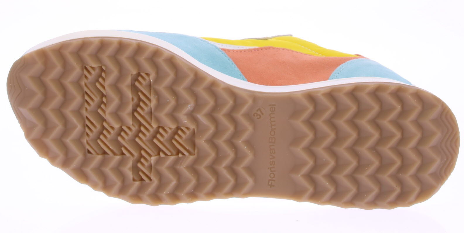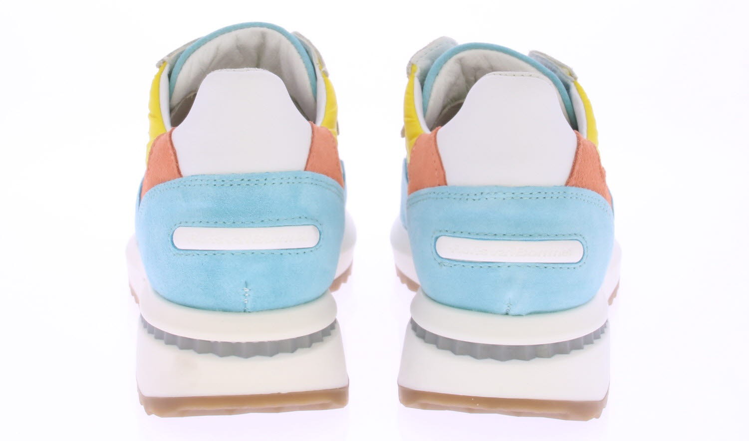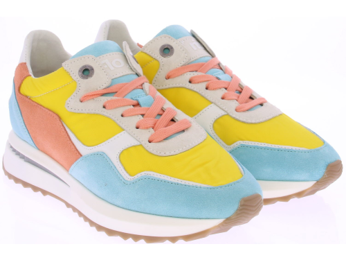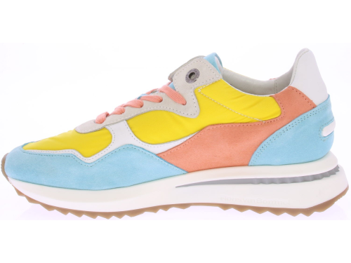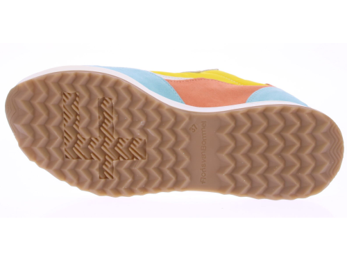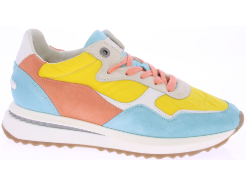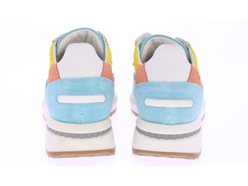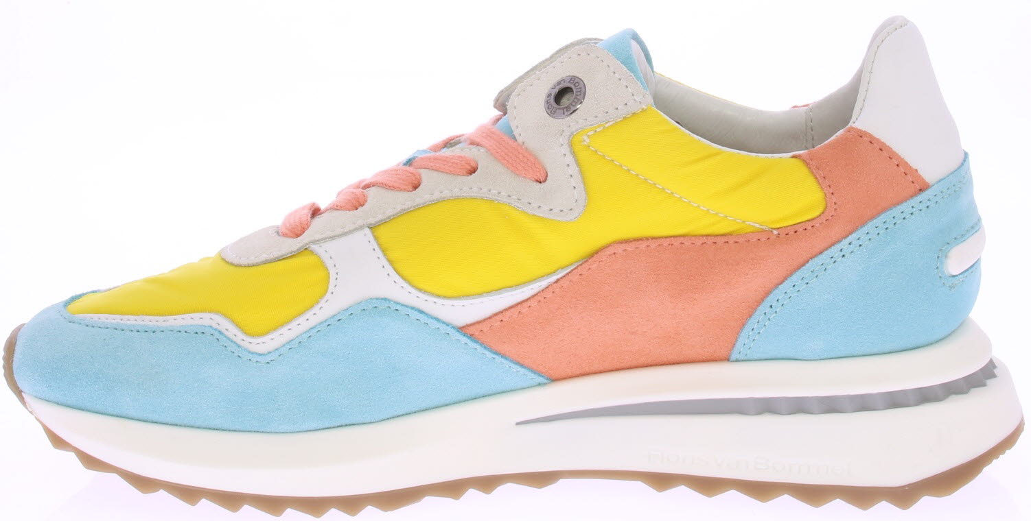 Licht blauwe/oranje/gele suede/leren dames sneaker van Floris van Bommel. Deze sneaker is uitgevoerd in een G-leest en heeft een uitneembare zool.