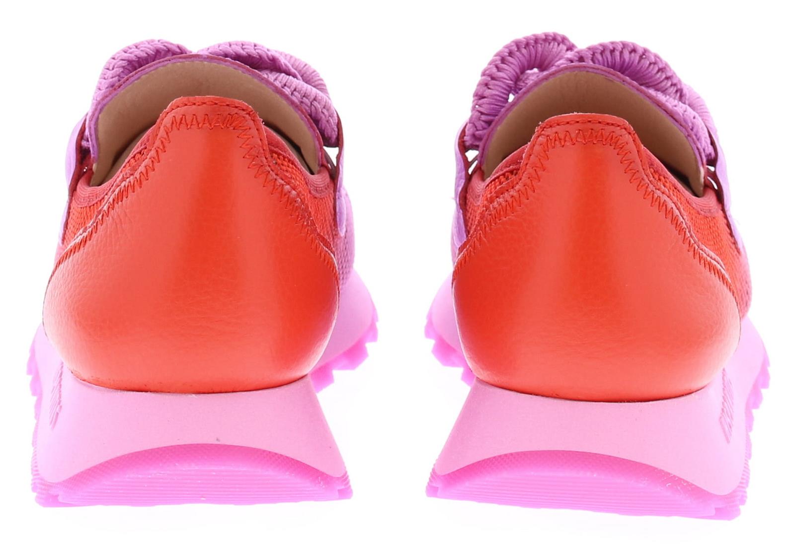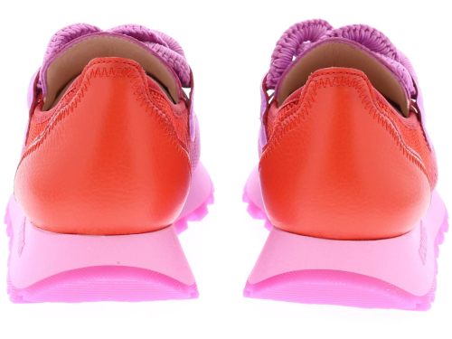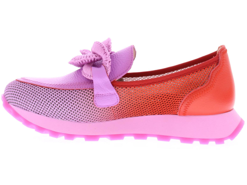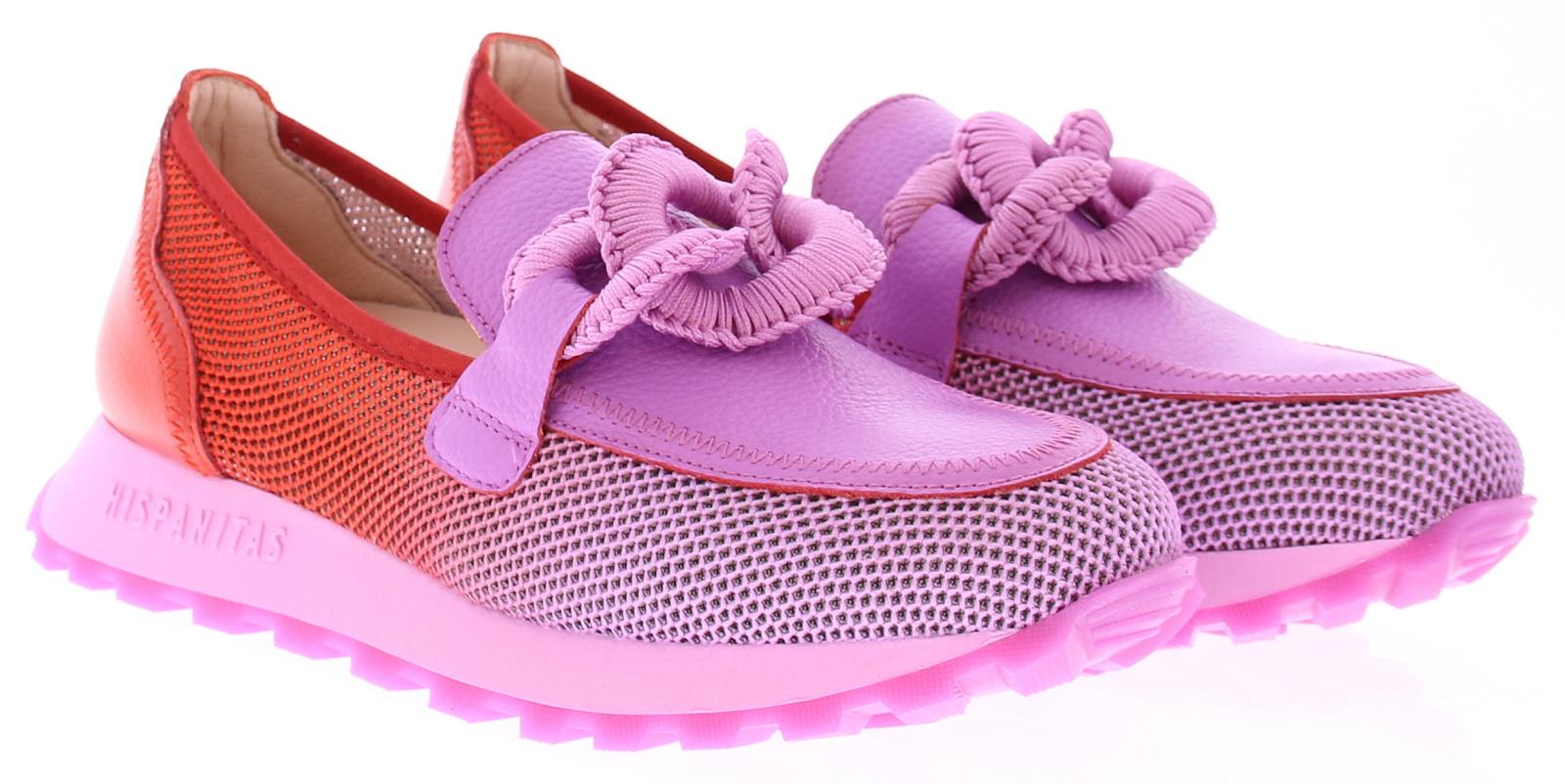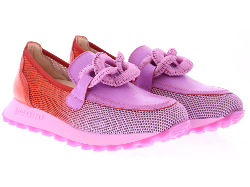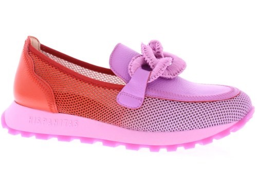 Violet leer met rood stoffen dames instapper van Hispanitas. Deze instapper heeft een gehaakte bit op de wreef en is eenvoudig aan en uit te trekken. De stevige stof aan de zijkant is geperforeerd waardoor deze zeer luchtig is. Het voetbed is uitneembaar. De rubberen zool heeft een fijn profiel, waardoor je voldoende grip en comfort ervaart.