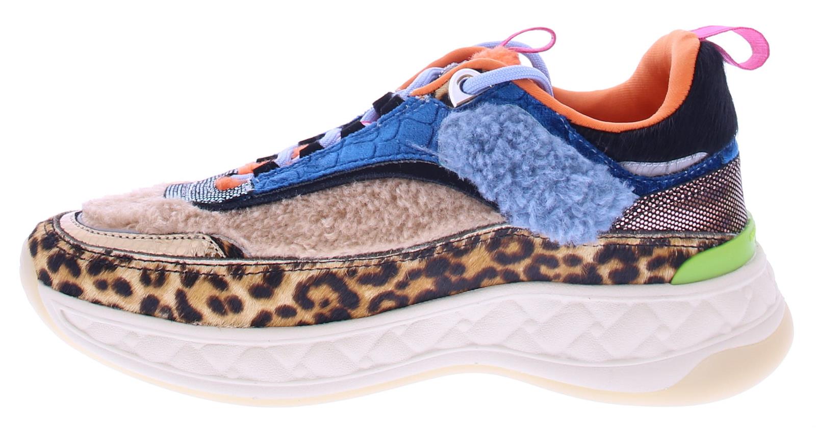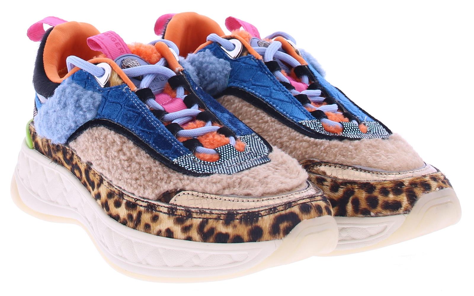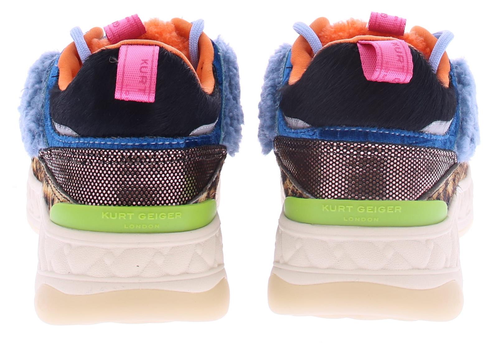 Multikleurige dames sneaker van Kurt Geiger. Deze sneaker is uitgevoerd in diverse materialen zoals textiel,leer en teddy in de kleuren metallic goud, zwart suede,panterprint en oranje. Met op de tong de herkenbare aderlaars kop van het merk Kurt Geiger. De voering is van zacht textiel het voetbed is uitneembaar. Met deze toffe sneakers kan je eindeloos combineren draag ze bij een jeans en shirt voor een relaxte look of onder een jurkje voor een vrouwelijke uitstraling.