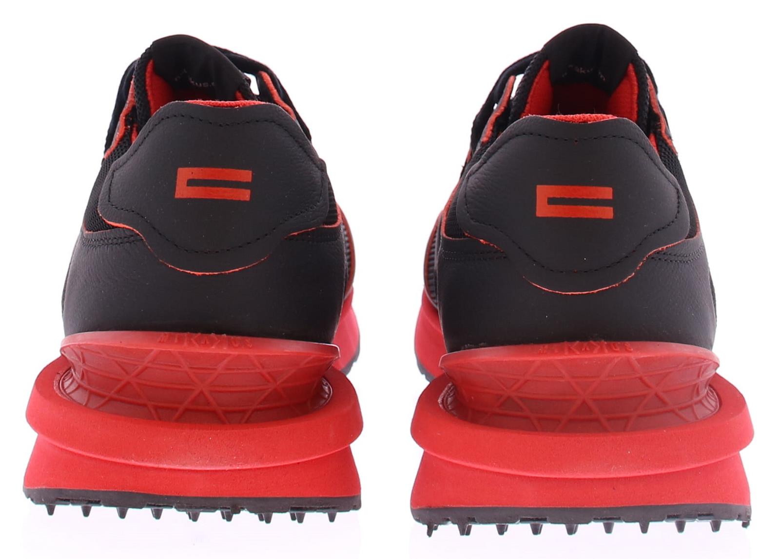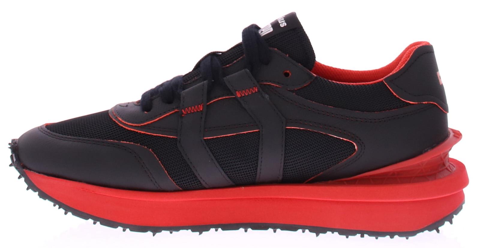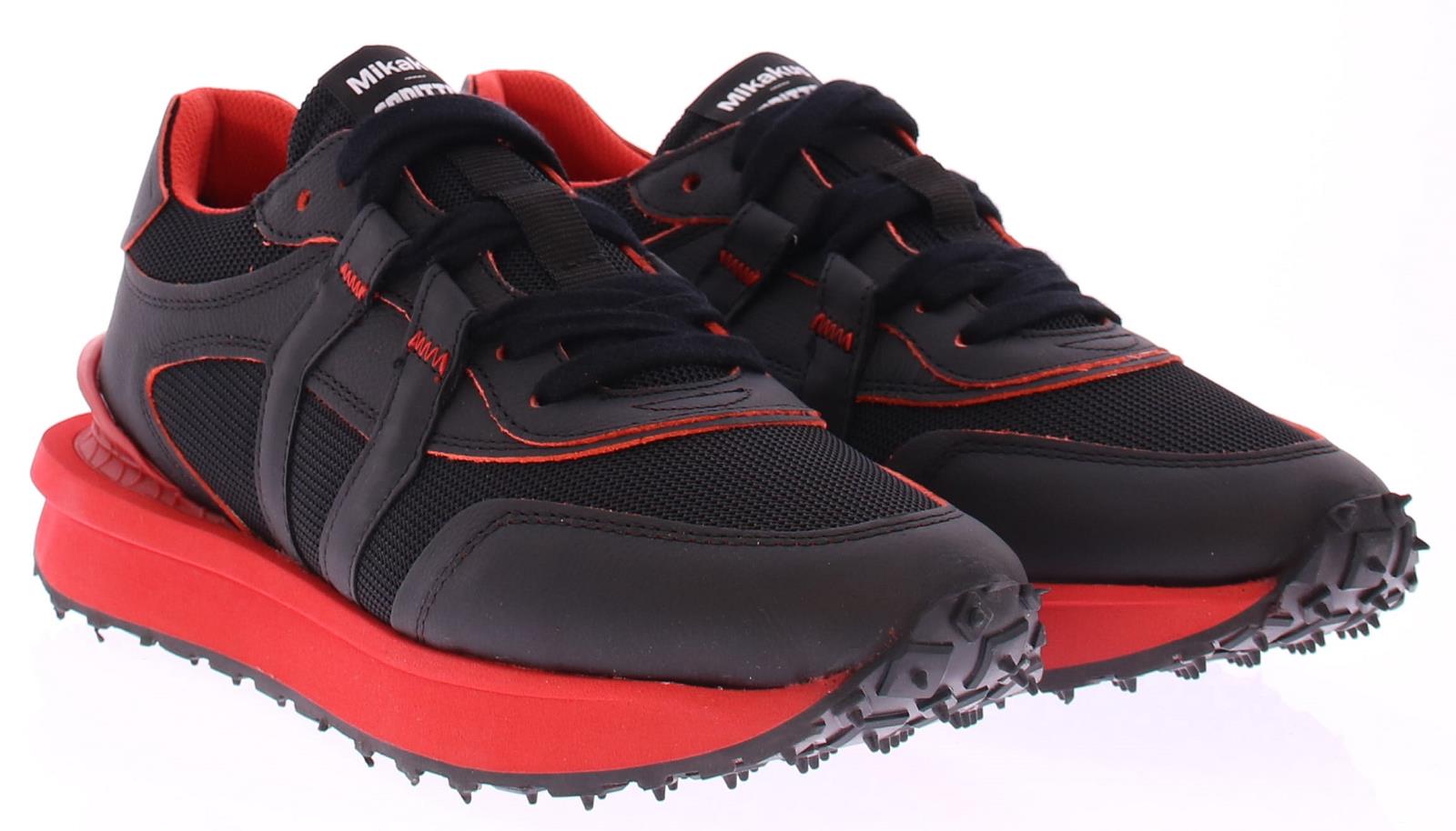 Zwarte leer met stoffen heren sneaker van Mikakus met rode accenten. De rubberen zool heeft een rode rand. De zwarte Mikakus sneakers voor heren zijn stijlvolle en eigentijdse schoenen die een combinatie bieden van comfort, functionaliteit en modieuze esthetiek. De schoenen hebben een opvallend ontwerp met aandacht voor detail en zijn geschikt voor verschillende casual gelegenheden.
