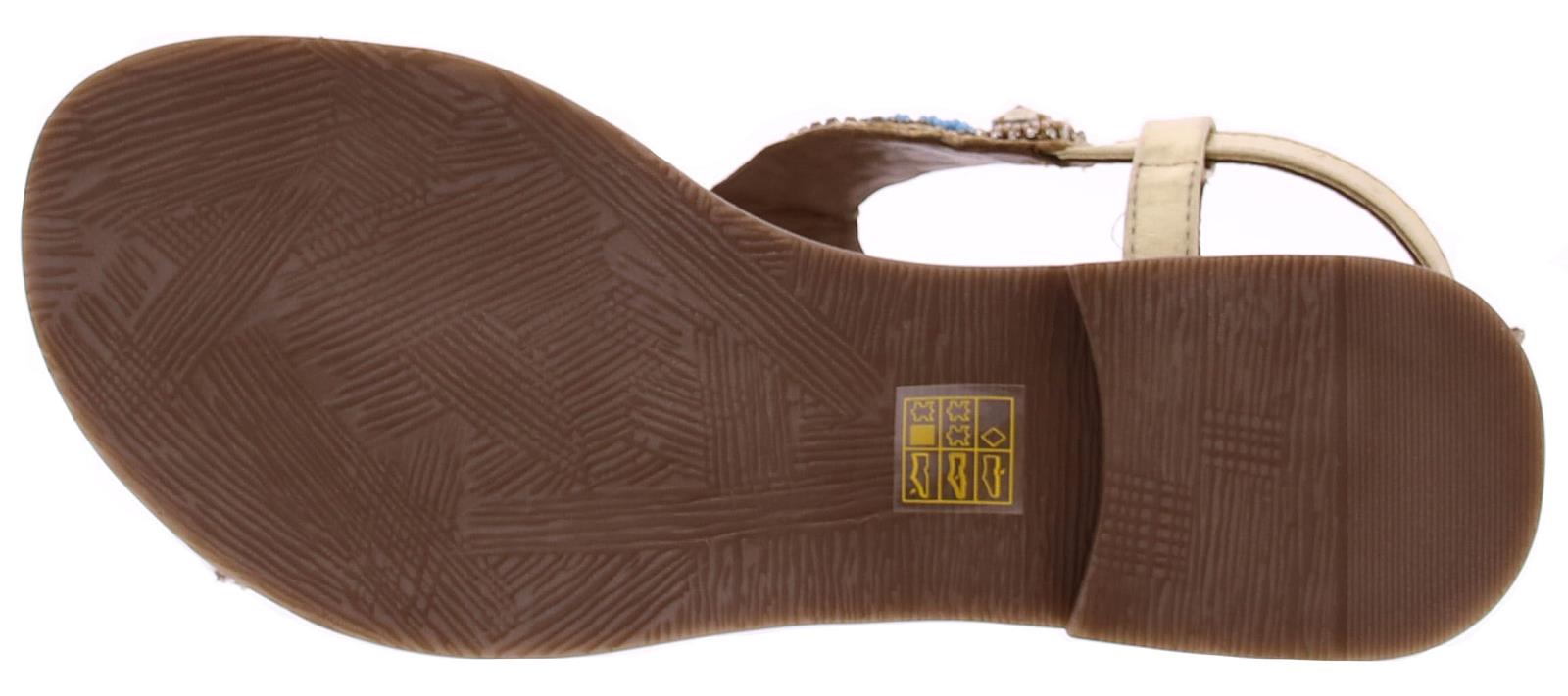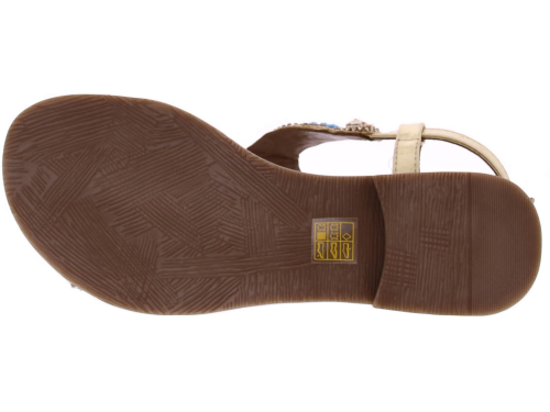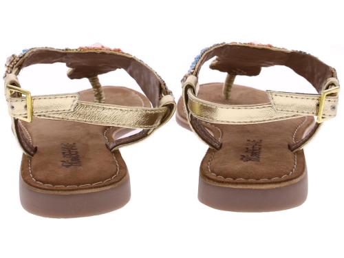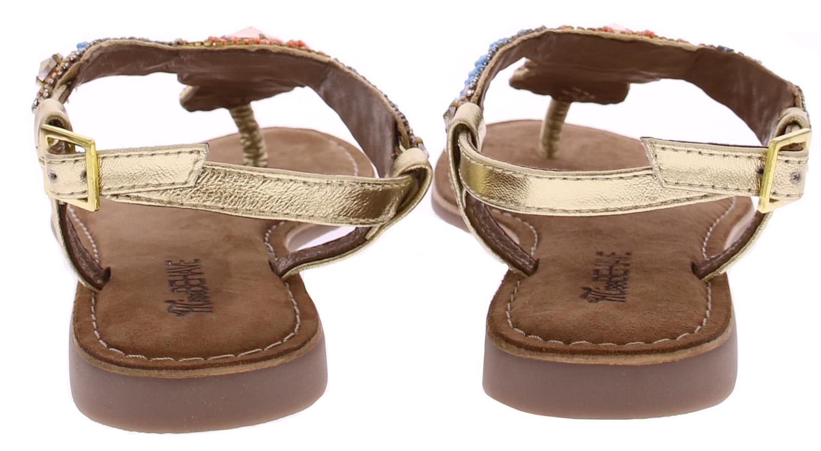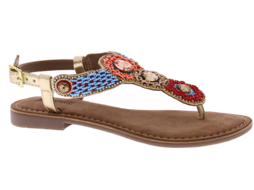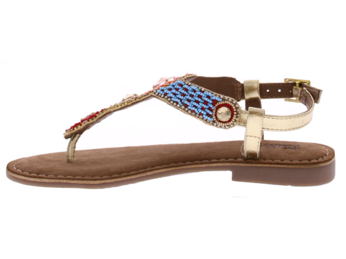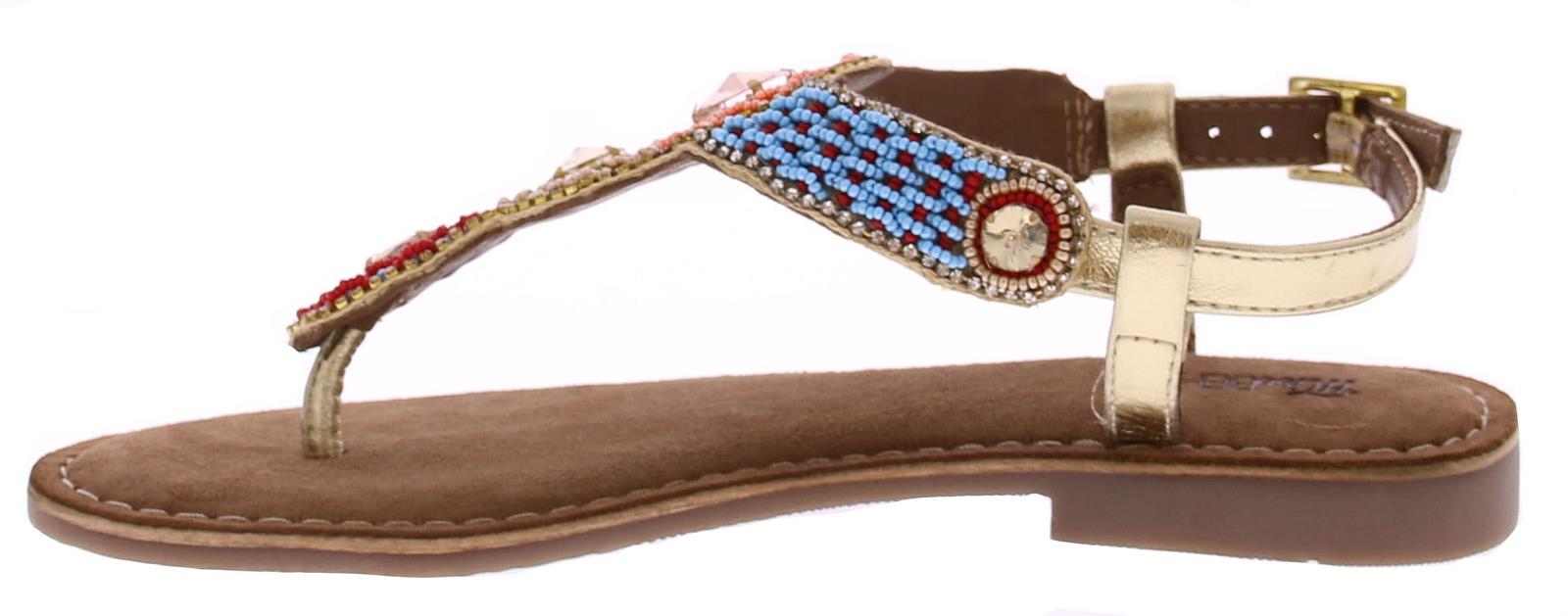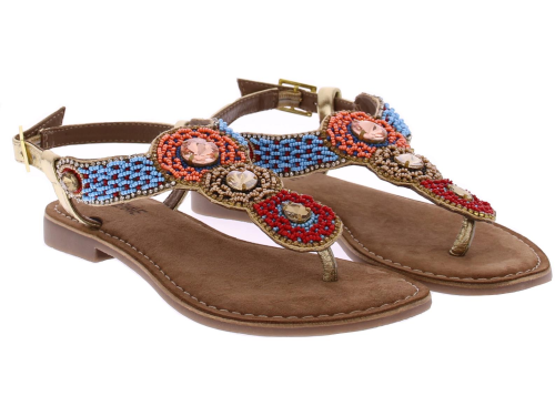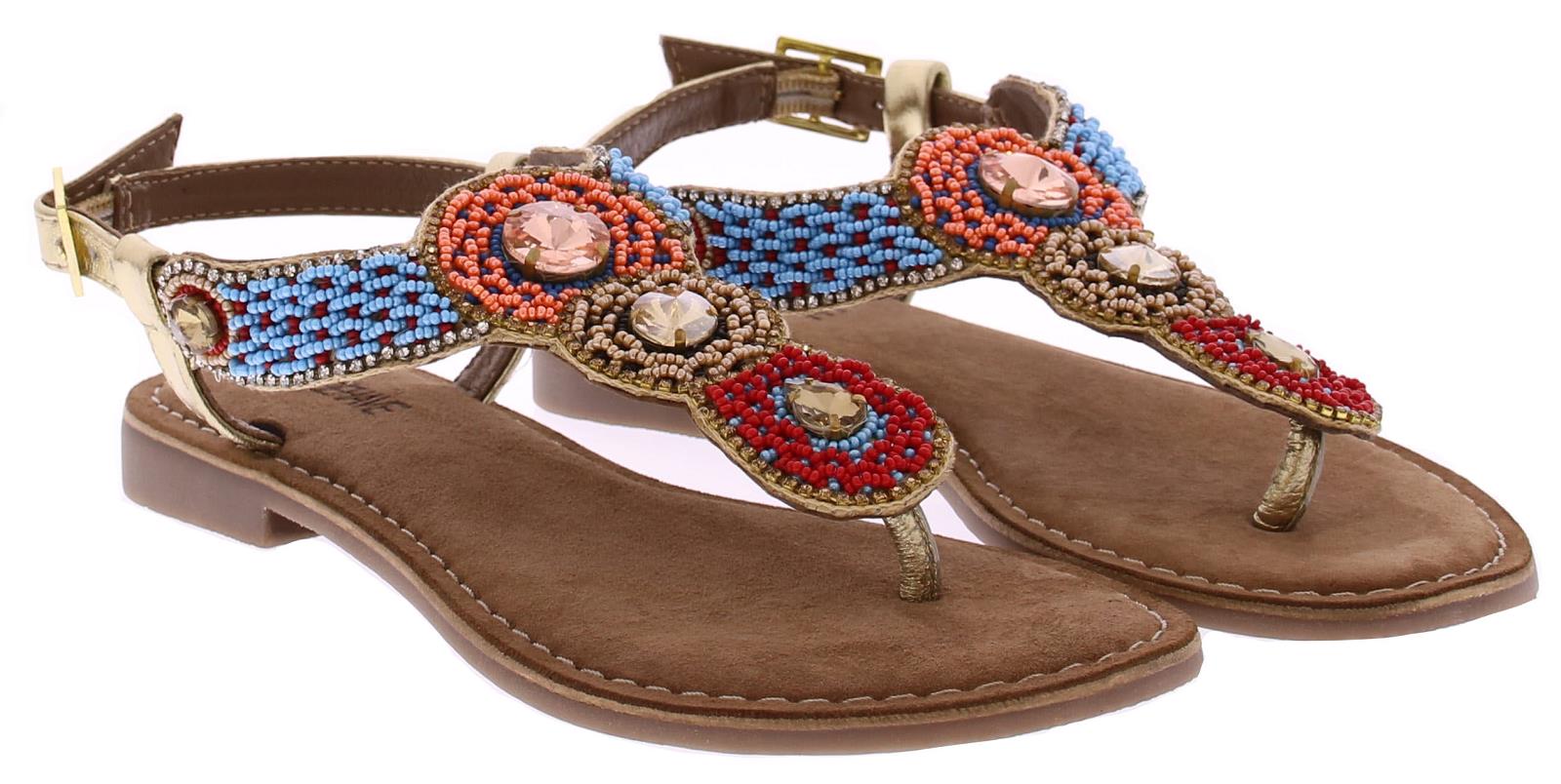 Multi kleurige leren dames sandaal van Miss Behave. Deze leren sandaal heeft een brede band met daarop een patroon van kleine kraaltjes in de kleuren oranje, brons en rood. Het voetbed is gemaakt van zacht materiaal waardoor deze sandaaltjes niet alleen modieus zijn maar ook lekker dragen.
