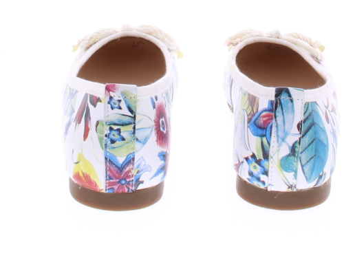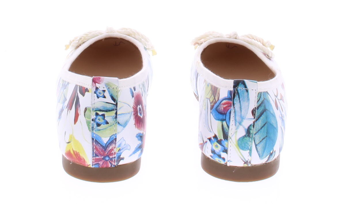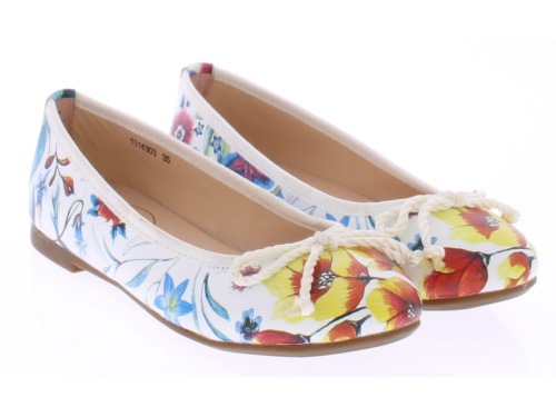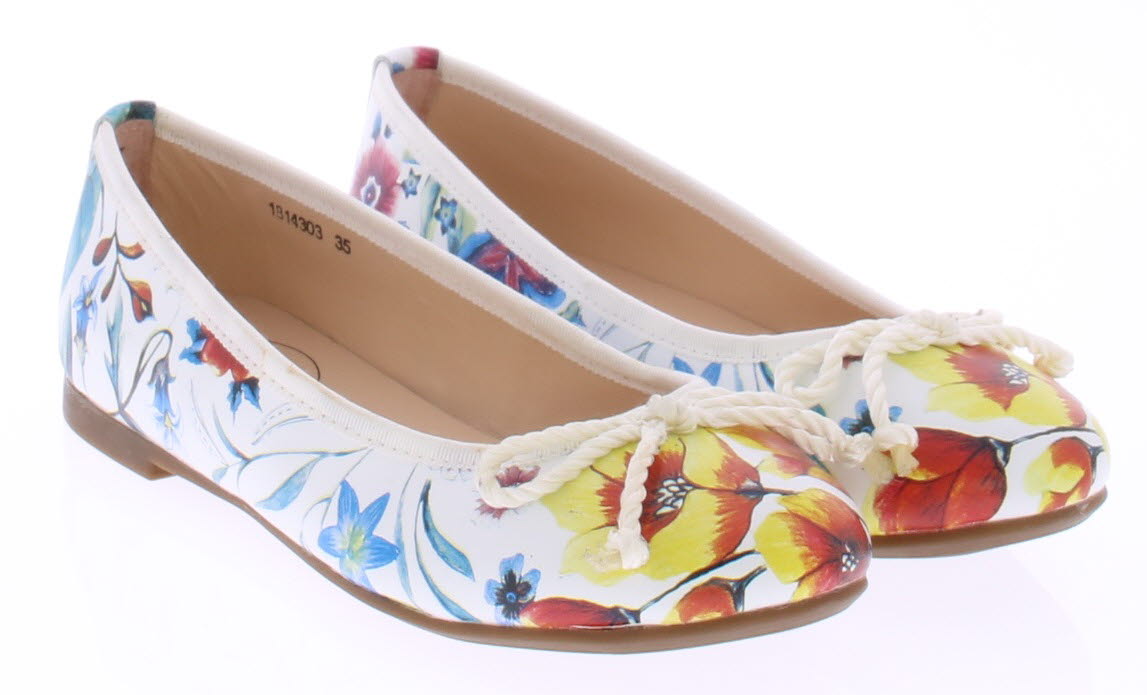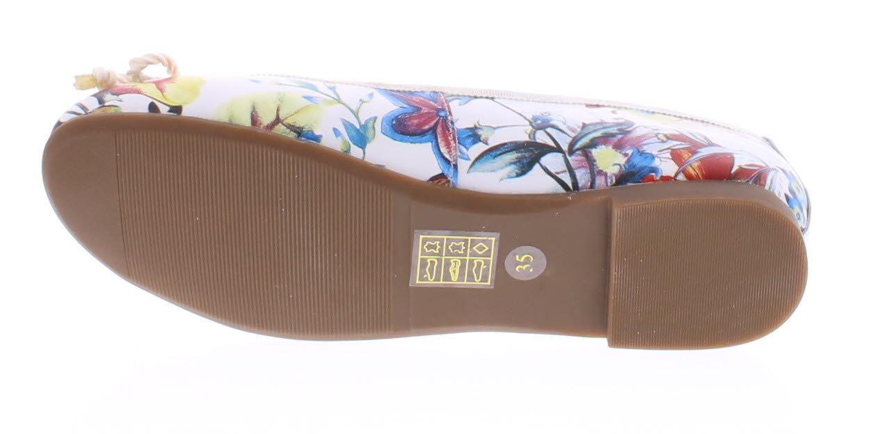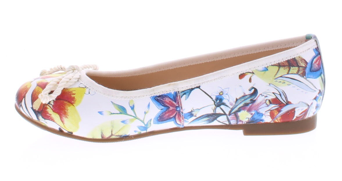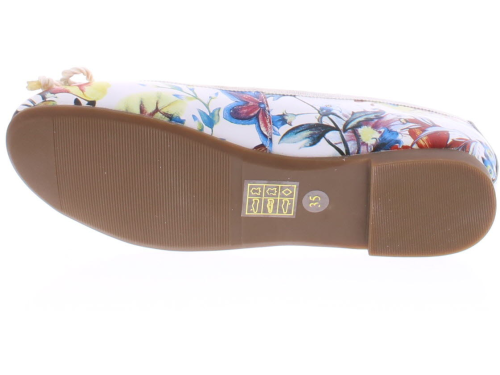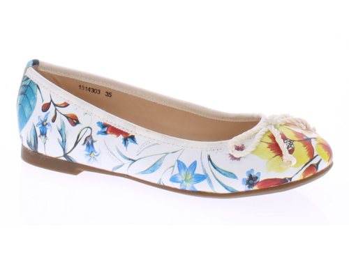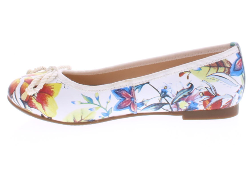 Dames ballerina van SI in leer met een multigekleurde bloemenprint en wit strikje.