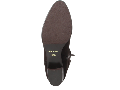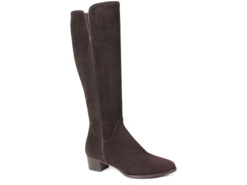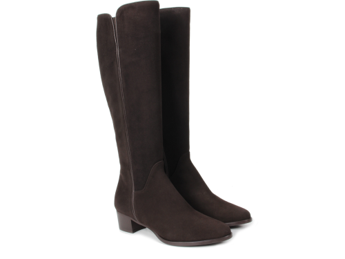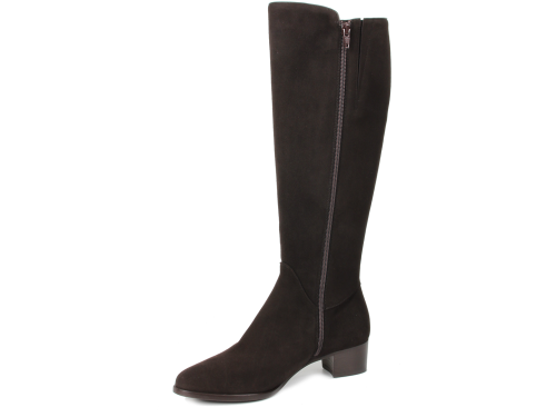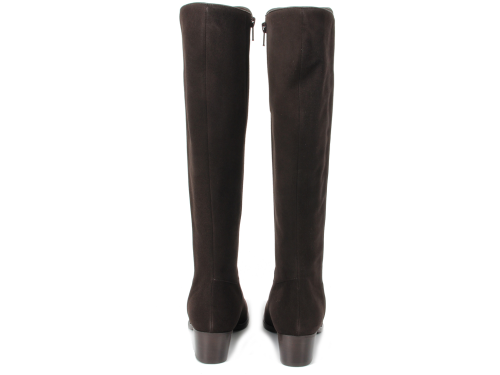 Donkerbruin suede dames laars van Nalini. Deze lange laars is afgewerkt met een leren bies over de hele schacht. De hak van de laars is 3 cm en de schacht is aan de voorzijde iets hoger dan aan de achterzijde zodat u minder last zal hebben van de laars in de knieholte.