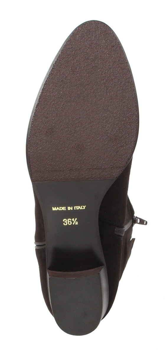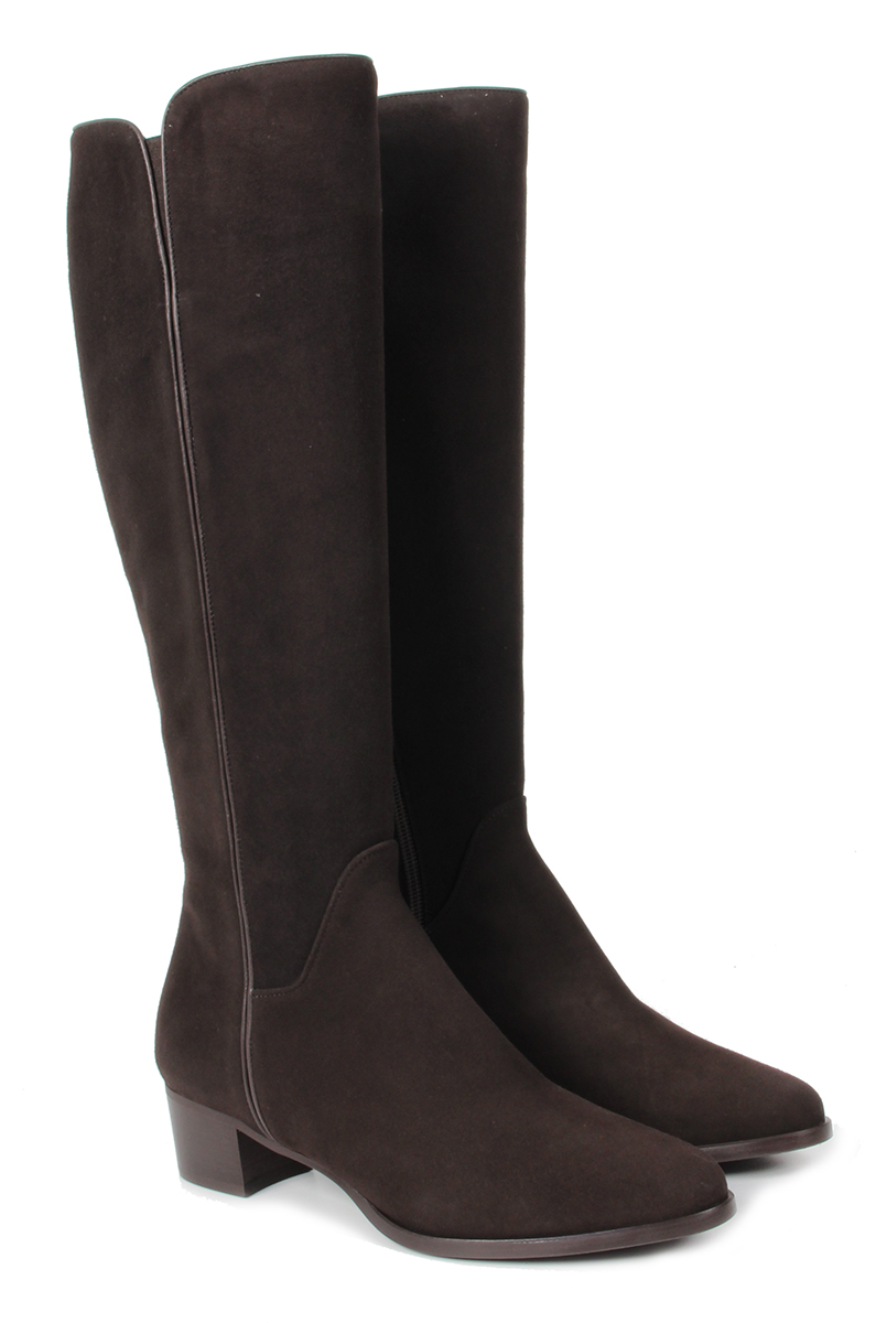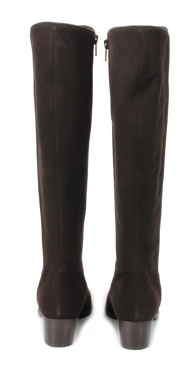 Donkerbruin suede dames laars van Nalini. Deze lange laars is afgewerkt met een leren bies over de hele schacht. De hak van de laars is 3 cm en de schacht is aan de voorzijde iets hoger dan aan de achterzijde zodat u minder last zal hebben van de laars in de knieholte.