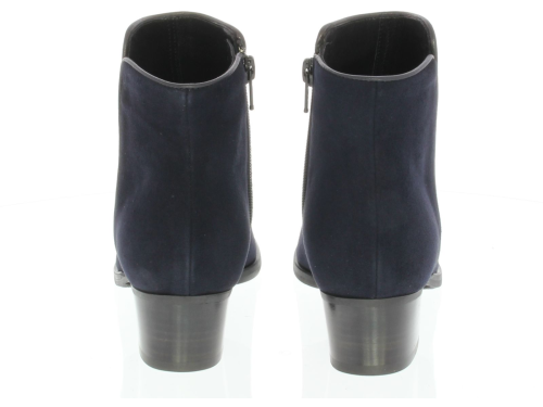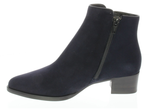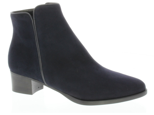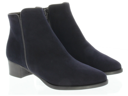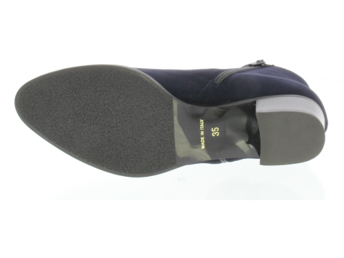 Donkerblauw suede dames enkellaars van Nalini. De laars is uitgevoerd in mooi zacht suede met een leren biesje aan de zijkant en bovenaan langs de schacht. De hak is 4 cm hoog. Hij sluit mooi om het been en is daardoor ook mooi bij een rok of jurkje.