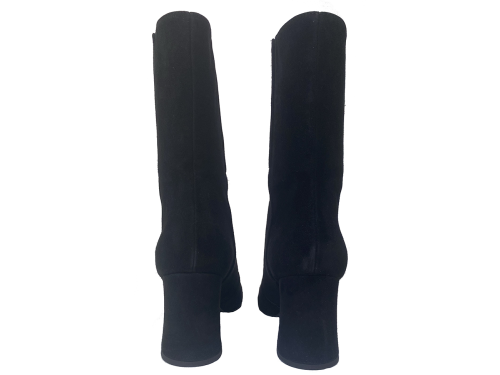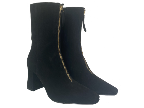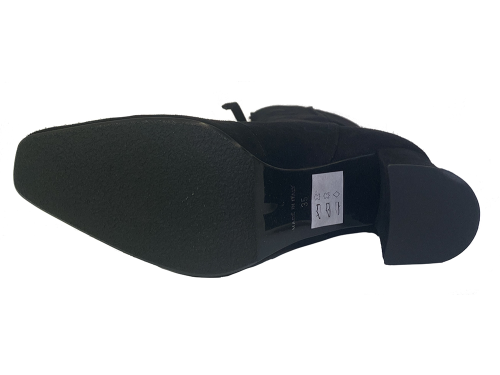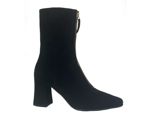 Zwart suede dames enkellaarsje van Nalini met een carre leest en een rits op de wreef en scheenbeen. Heeft een iets wat uitlopende beklede hak van 7 cm.