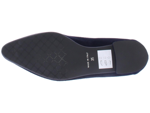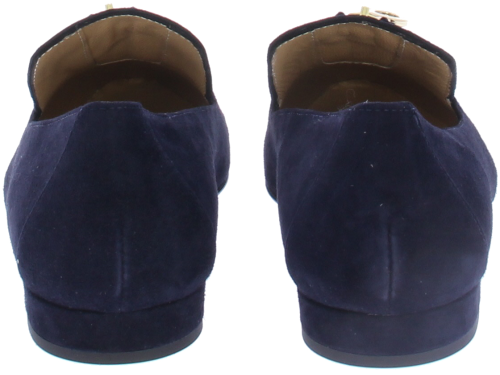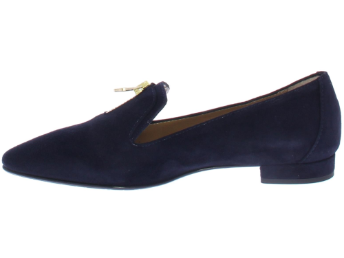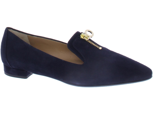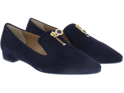 Blauw suede dames instapper van Nalini. De schoen heeft een goudkleurig detail op de wreef in de vorm van een rits. De hak is 2 cm hoog en is bekleed met suede. De zool is van rubber.